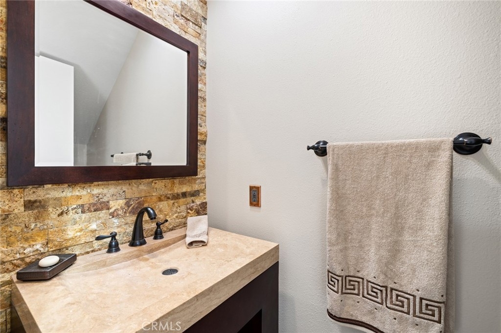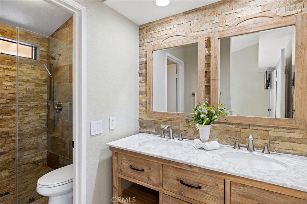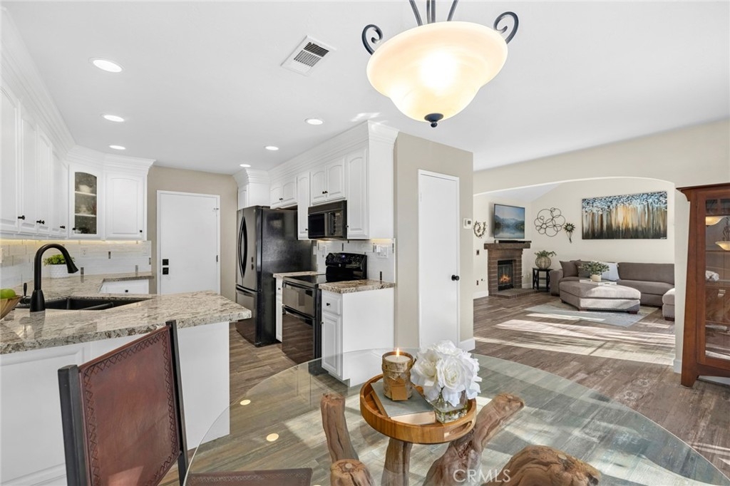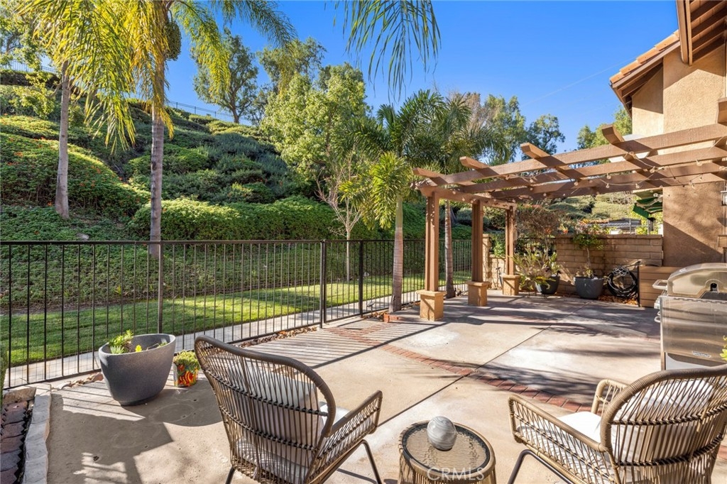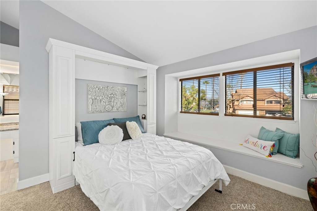 Ideal combination of location, serene setting, complete pride of ownership and remodel perfection. The front courtyard welcomes you into this light-infused home offering a wall of windows/doors that span the back of this home bringing in the inviting greenery backdrop and creating a great room concept of living to effortlessly enjoy an indoor/outdoor flow. Interior features neutral wall tones, handsome wood-look tile flooring, and updated amenities throughout including replacement of window glass. The fireplace in the living room invites you to sit and linger, while the granite kitchen enjoys plentiful meal prep counter space, designer backsplash, generous storage behind white cabinetry, and a convenient dining counter. Upstairs, the primary suite boasts soaring ceilings, lush views and a spa-infused remodeled bath with stacked stone walls, large walk-in shower and walk-in closet. Second en-suite bedroom features a convenient built-in Murphy bed, creating versatility of both guest quarters, office or work-out space. Gorgeous en-suite bathroom offers gleaming countertops with custom mirror and lighting and a sparkling white stacked stone accent tub/shower combo and walk-in closet. Outdoor living begins on the expansive patio offering both shady and sun-soaked areas to enjoy al-fresco dining or relaxation. Fabulous private setting with an ideal end of cul-de-sac location and driveway. Close to walking trails, shopping, schools, Anaheim Hills Golf Course and freeway access.