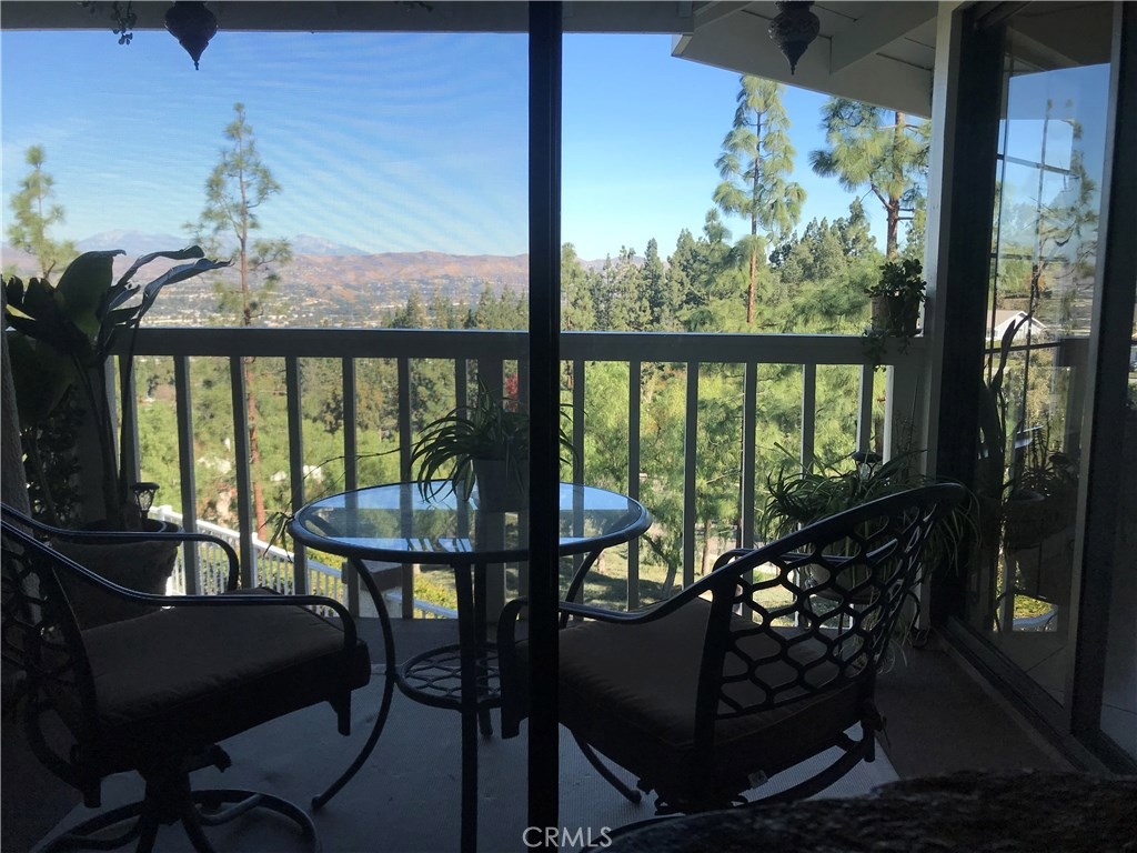 VIEW, VIEW, VIEW!! Perched high in the tranquil hills, with breathtaking unobstructed views, rests this lovely condo in the desirable community of Canyon Pointe of Anaheim Hills. This upper corner unit at the end of a quiet cul-de-sac offers complete privacy and two ample viewing balconies. This 2 bedroom 2 bath home has many nice upgrades throughout including, beautiful granite countertops and custom cabinets in the kitchen, hardwood floors in the bedrooms, tastefully designed bathrooms with travertine master shower and frameless glass door enclosure, triple showerhead with large rain shower spout, dual sinks with marble countertops, and surround sound throughout including the bathrooms. Enjoy parking your car in the roomy two car garage with epoxy flooring and lots of room for storage. The laundry area is conveniently located. Perfectly located for quick access to the 91 FWY, 55 FWY, 241 toll road and near shopping, banking, and restaurants!!
