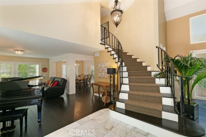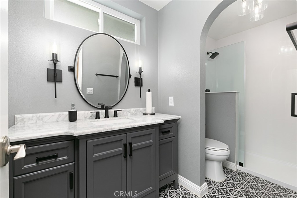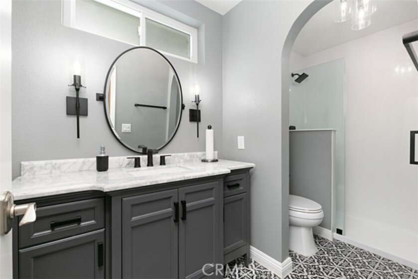 Elegantly upgraded with a gorgeous interior! The current owners spent thousands on this beautiful attached single family residence. Gleaming Italian-style porcelain flooring in the kitchen along with rich wood cabinets, recessed lighting, under counter lights, a big country sink and 5-burner cooktop, and a spacious walk-in pantry. The DOWNSTAIRS BEDROOM has a 3/4 bath that has been dazzlingly, newly remodeled, as has the full bath in the secondary bedroom upstairs. The roomy master with vaulted ceilings, a huge walk-in and also secondary closet looks out onto the private hillside behind the property, and the vanity dressing area between the bath and master has double sinks with custom mirrors and lighting. Relax in this opulent master bathroom out of Architectural Digest with separate tub and shower, enhanced by a muted gray color scheme. Off the kitchen is a BIG dining room area, and double sliders open into the secret garden backyard patio. Extra interior light and charm is provided by the tranquil garden atrium accessed by a sliding glass door off the living room. When winter comes you'll be glad to cozy up in front of the marble-faced fireplace. Privacy and serenity await you here, and a cool dip in the association pool is just a few minutes walk away from the property, straight down the street.