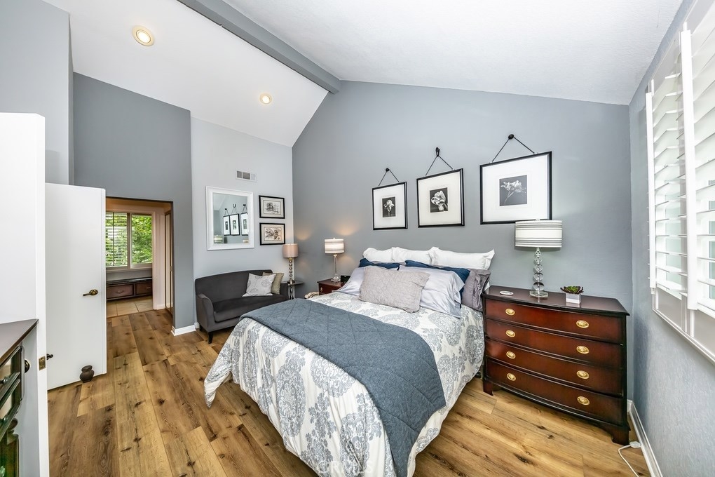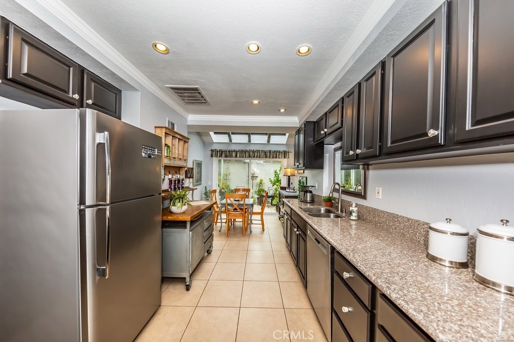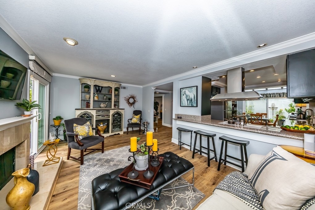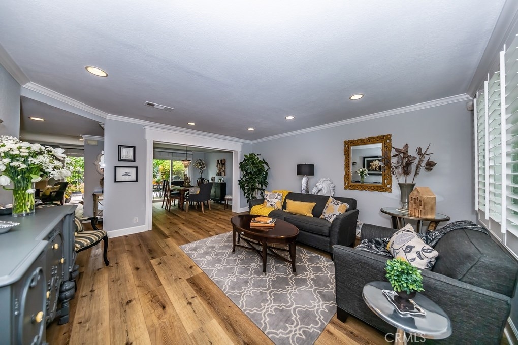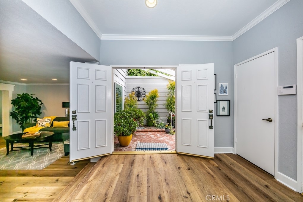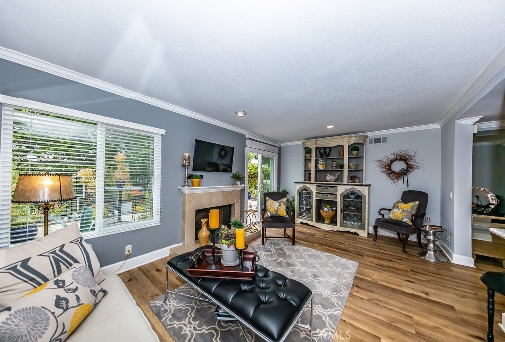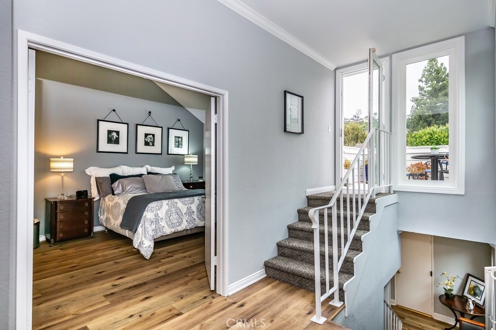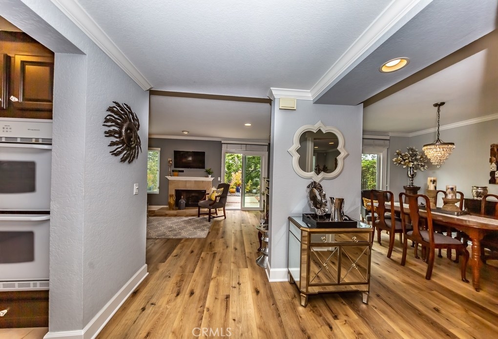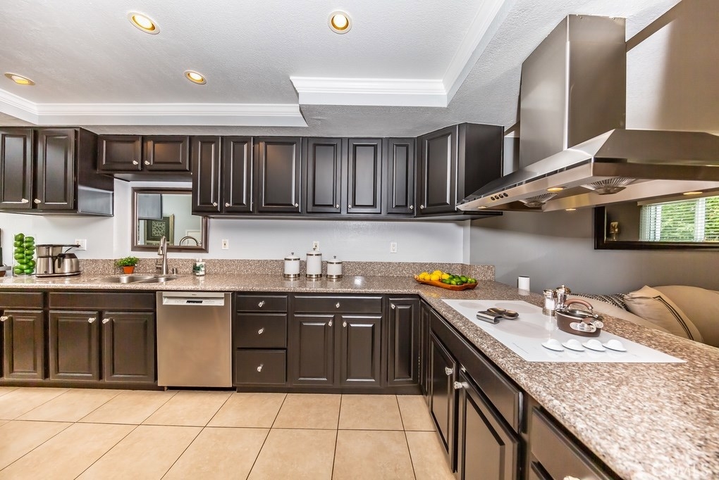 Beautiful turnkey home up in the hills of the Canyon Terrace community. This open floor plan features great living space which flows well together with elegant vinyl wood floors, recessed lighting, and custom baseboards and crown molding. The reconfigured kitchen features granite counters, custom cabinets, recessed lighting, double ovens, and walk-in pantry. The peaceful and private atrium off the kitchen nook brings in great natural lighting. Cozy family room with a welcoming fireplace. The grand dining area flows nicely into the living area. The private and roomy patio offers relaxing views of lush green trees and a peek-a-boo city lights view. The downstairs guest bathroom features marble counter and custom vanity. Continue upstairs to the sizable master bedroom with double door entryway, vaulted ceiling, recessed lighting, and walk-in closet. The master bathroom features dual sinks, quartz counters, custom vanity, and deep tub with shower. Other two additional spacious bedrooms share a Jack n Jill full bathroom with marble counters and custom vanity. From the upstairs hallway, you can walk up to the private balcony deck with nice relaxing views of the trees and neighborhood. Attached two car garage with direct access, epoxy floors, and pull-down storage space. Delightful community pool and spa with spectacular city lights and mountain views. Additional upgrades include a newer roof and windows. All within a short distance to top rated schools, restaurants, and shopping.