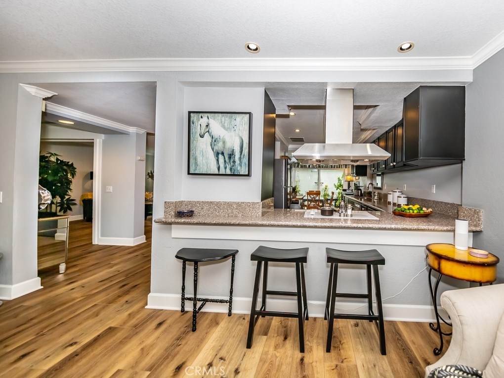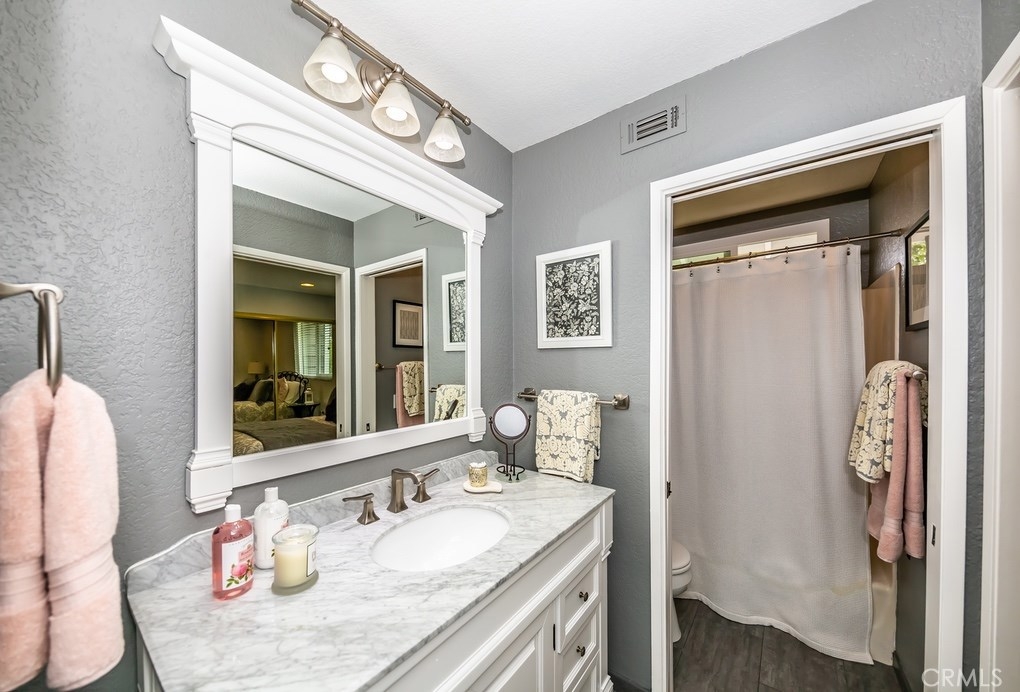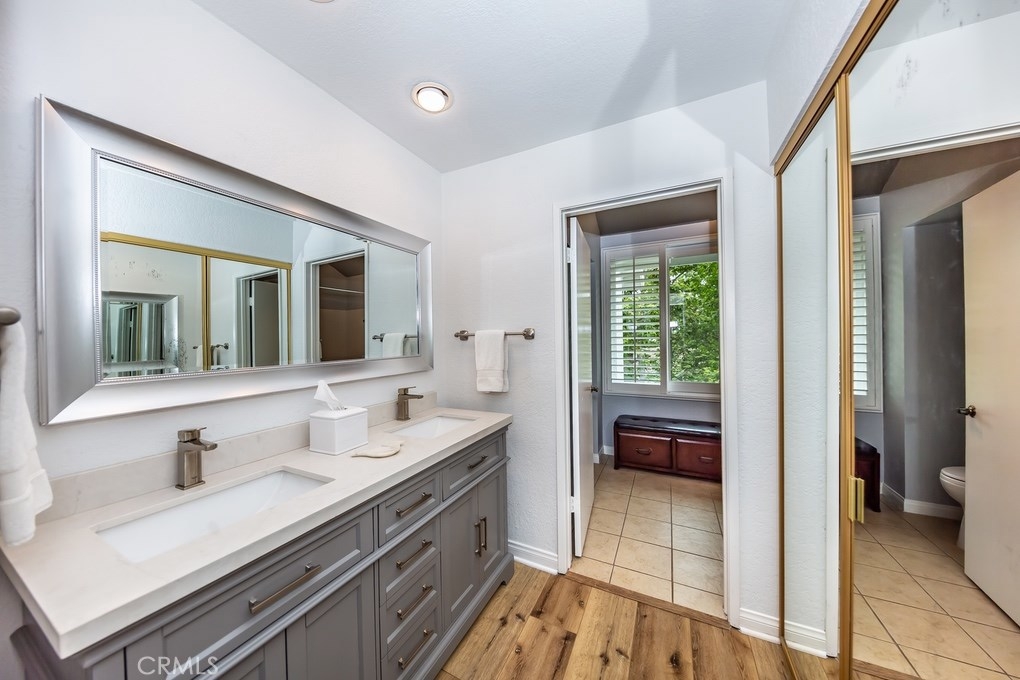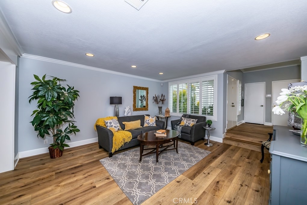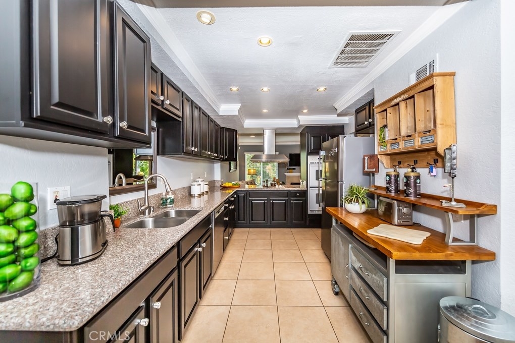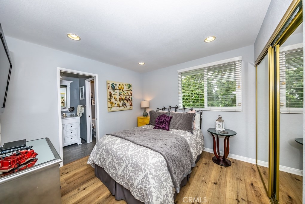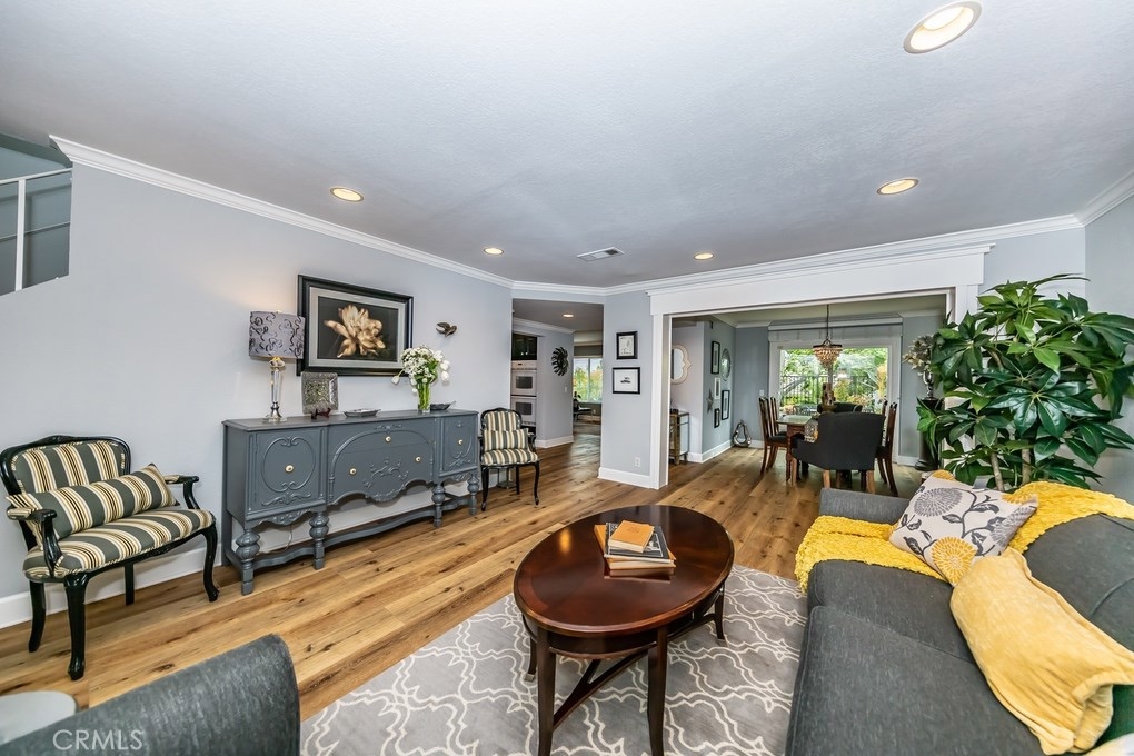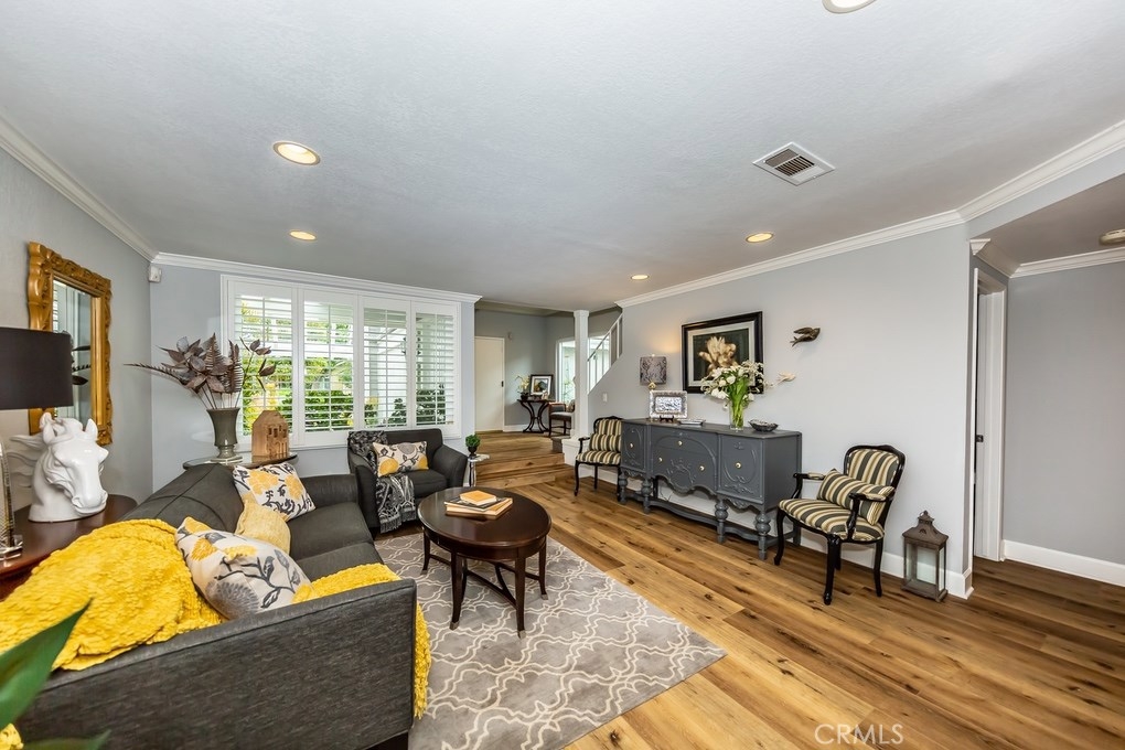 Beautiful turnkey home up in the hills of the Canyon Terrace community. This open floor plan features great living space which flows well together with elegant vinyl wood floors, recessed lighting, and custom baseboards and crown molding. The reconfigured kitchen features granite counters, custom cabinets, recessed lighting, double ovens, and walk-in pantry. The peaceful and private atrium off the kitchen nook brings in great natural lighting. Cozy family room with a welcoming fireplace. The grand dining area flows nicely into the living area. The private and roomy patio offers relaxing views of lush green trees and a peek-a-boo city lights view. The downstairs guest bathroom features marble counter and custom vanity. Continue upstairs to the sizable master bedroom with double door entryway, vaulted ceiling, recessed lighting, and walk-in closet. The master bathroom features dual sinks, quartz counters, custom vanity, and deep tub with shower. Other two additional spacious bedrooms share a Jack n Jill full bathroom with marble counters and custom vanity. From the upstairs hallway, you can walk up to the private balcony deck with nice relaxing views of the trees and neighborhood. Attached two car garage with direct access, epoxy floors, and pull-down storage space. Delightful community pool and spa with spectacular city lights and mountain views. Additional upgrades include a newer roof and windows. All within a short distance to top rated schools, restaurants, and shopping.