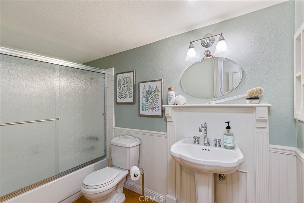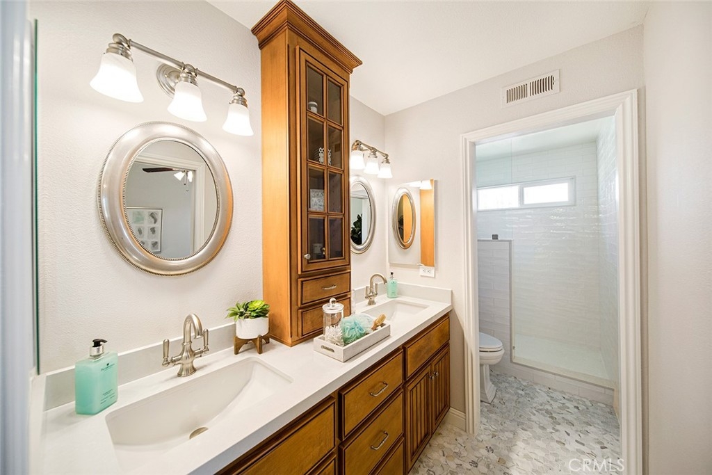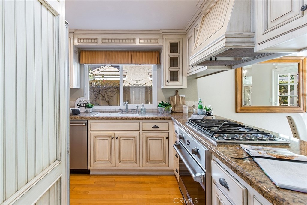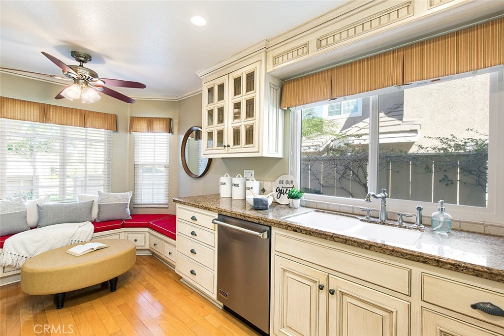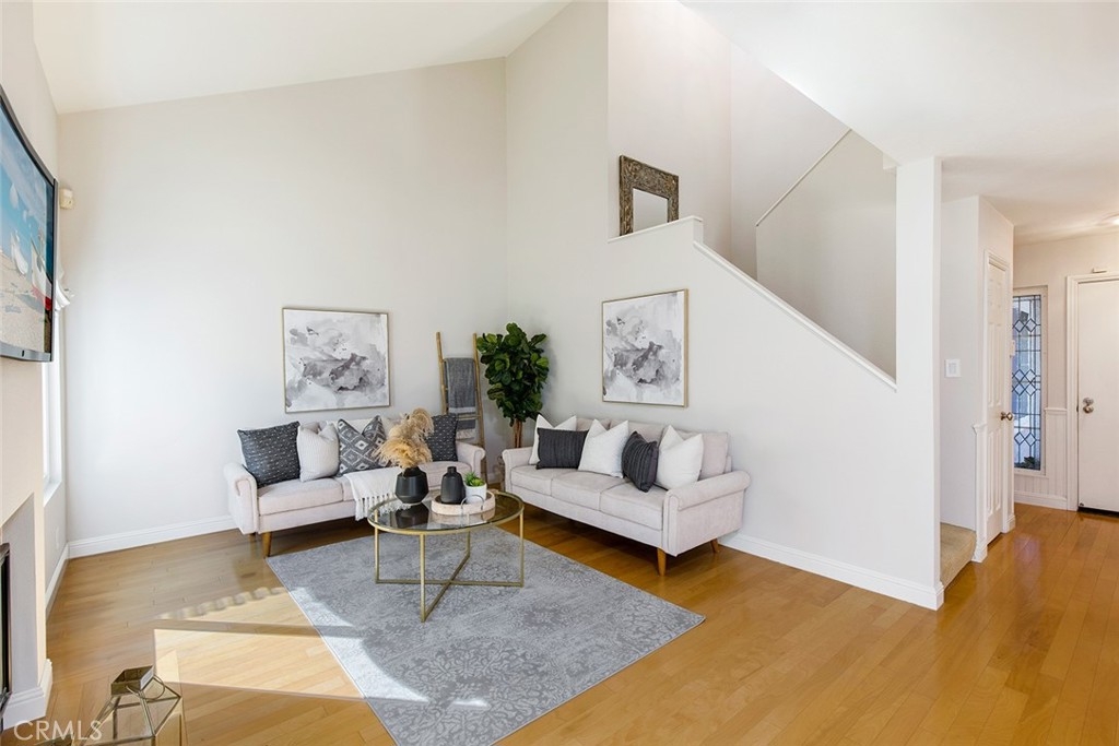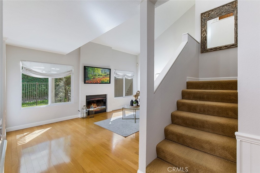 Located in the established Horizon Community in Anaheim Hills, this lovely two bed, three bath home has a bonus room on the first floor ideal for use as a den, office or even a third bedroom. Vaulted ceilings and wood floors with custom baseboards adorn the fireside living room opening to a dining area with sliding glass door access to the backyard. The kitchen opens to the dining area and features a Viking dishwasher and range with 5-burner stove, granite counters, stone backsplash and an abundance of custom cabinet space. There's also custom-made, built-in window seating providing personality, natural light and a great spot to hang out. On the second level are two spacious en-suites. The master has high ceilings and a luxuriously appointed bath with beautiful tiles, cabinetry, lighting and walk-in closet. Thoughtful upgrades throughout this property display great care and attention to detail: new windows, new light fixtures, wainscoting in the entry and bath, baseboards, security system and finished garage with epoxy flooring. Special to the home is an end unit location with generous wrap around yard, long private driveway and adjacent to the community pool and spa providing additional guest parking on the street.