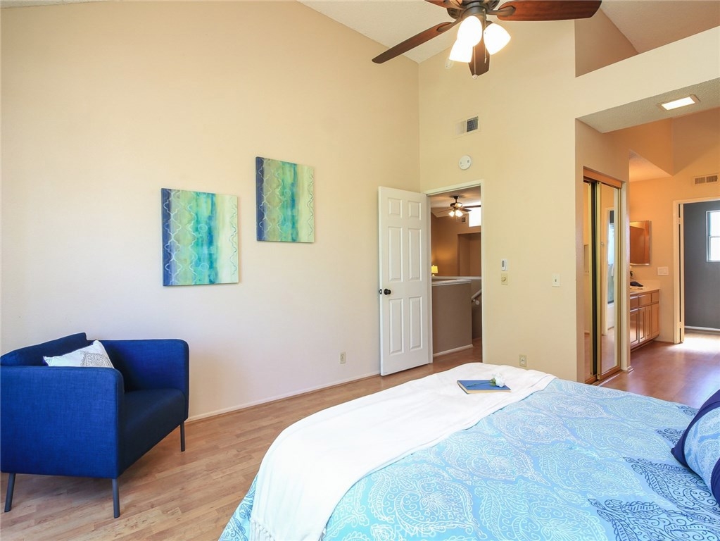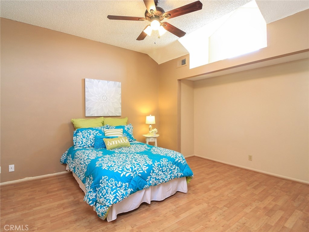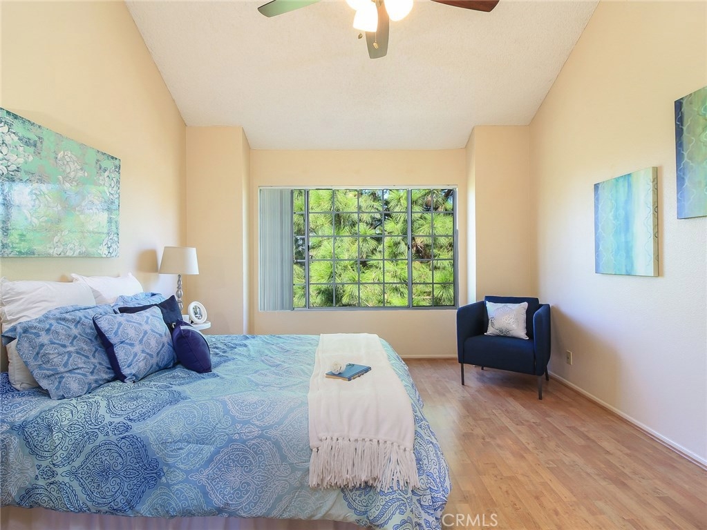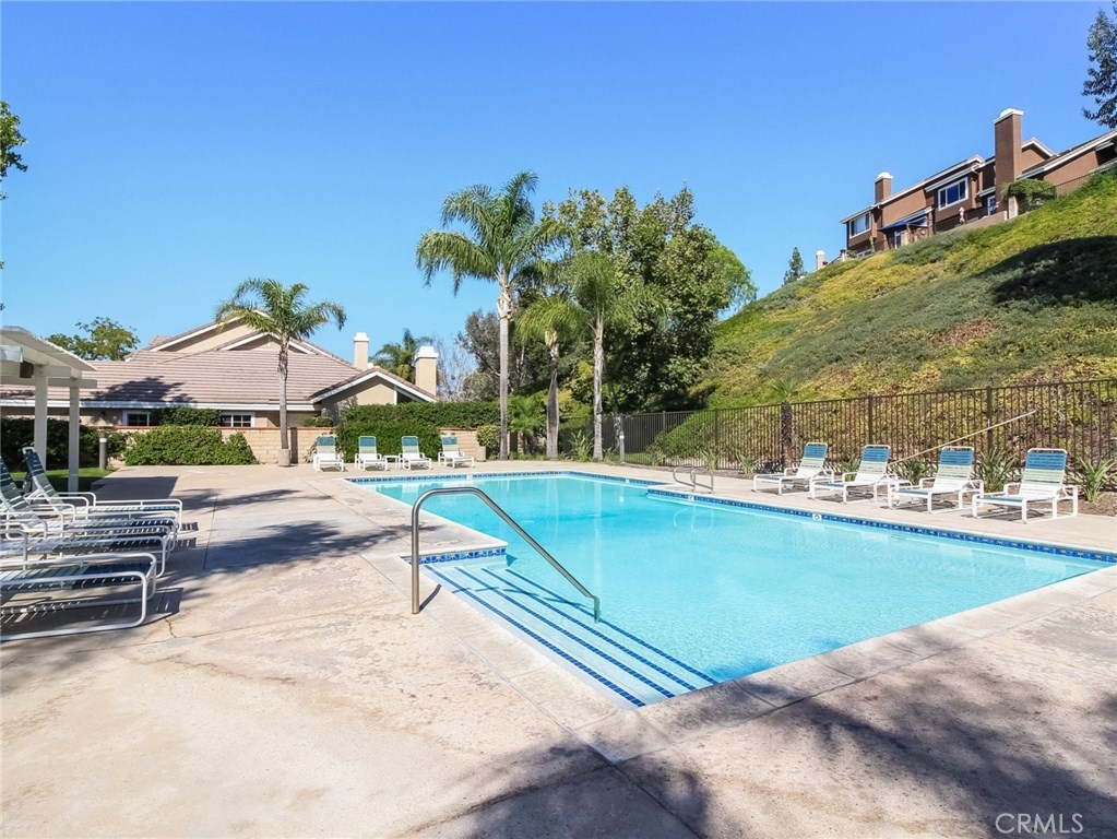 This inviting Horizons hills home is nestled among the pines. Open Floor Plan with lots of natural light and recessed lighting. Features 3 bedrooms including one spacious loft and one bedroom and bath downstairs. Vaulted ceilings in living room and master bedroom, cozy fireplace, sunny breakfast nook, dining room, large master bedroom en-suite with two mirrored wardrobes. Ceiling fans in breakfast nook, loft/bedroom and master bedroom. Private patio with partial view of mountains & city lights. Offers amazing walking panoramic views of Anaheim Hills Golf Course, city lights and mountains. Enjoy the cool night time breezes. This is your chance to own a lovely hilltop home!