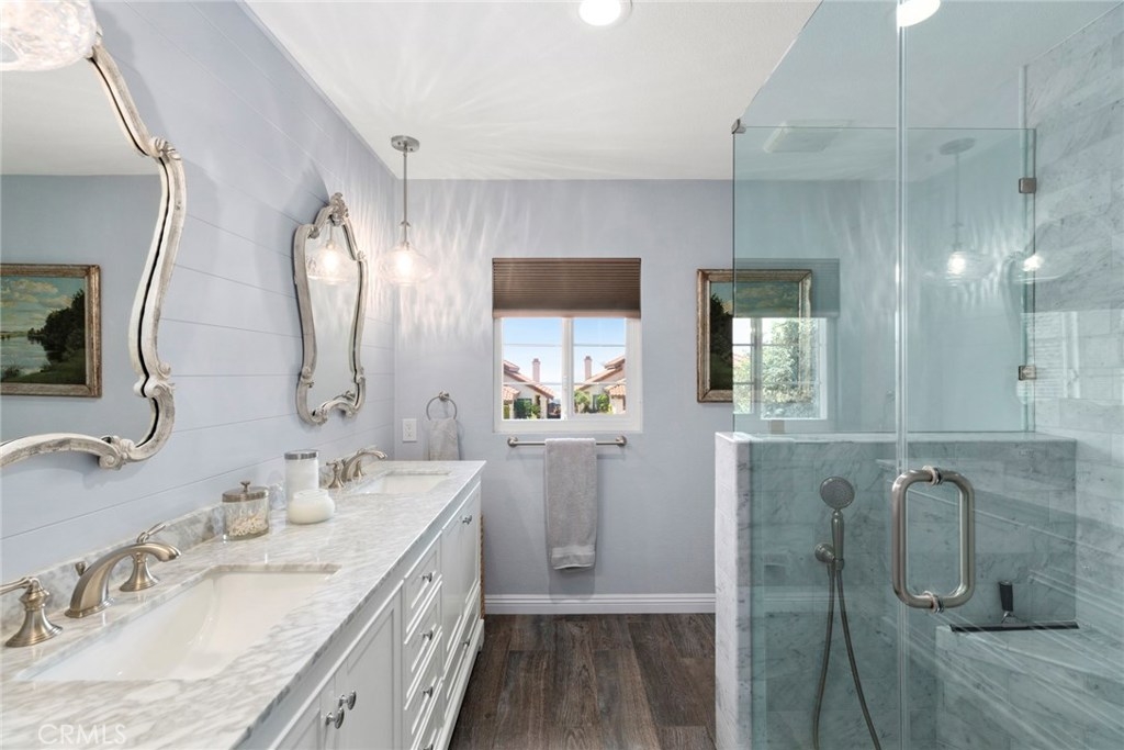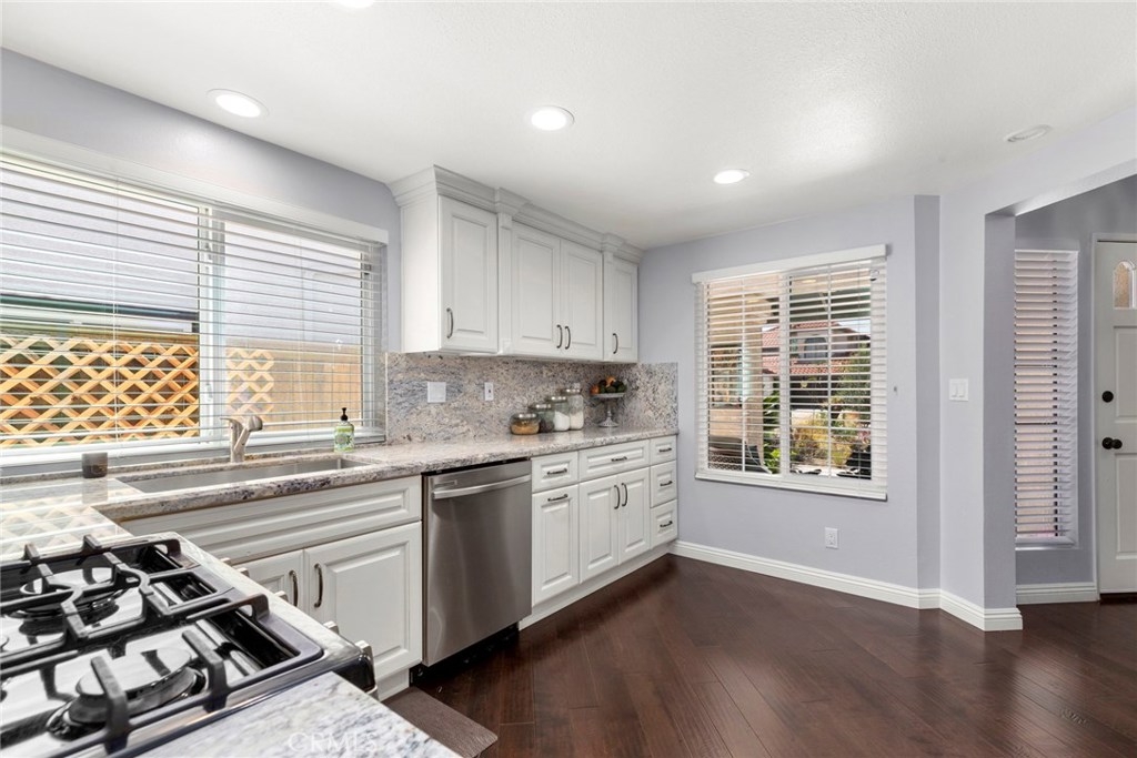 Welcome to your gorgeous, turnkey home in the beautiful, peaceful community of Kings Meadow - Anaheim Hills. California succulent landscaping offers great curb appeal while being both low maintenance & water conscious. Move in ready is what you experience when you enter this recently renovated 3 bed & 3 bath home. Hardwood flooring leads to a light & bright family room w/high ceilings & double paned windows. The stone fireplace is perfect for a chilly evening. Kitchen boasts elegant cream “soft close” cabinetry, beautiful granite counters & new stainless steel appliances, fixtures & recessed lighting. The dining & family rooms open to a colorful, fragrant patio garden teeming with Roses, Lilly, Hydrangeas & Bougainvillea. Hard to find main floor bed/bath offers a new vanity, granite counters, walk in shower, Kohler sink, plumbing & lighting fixtures. Upstairs bedrooms offer thick, plush neutral grey carpet. The Master Suite is generously sized with full wall mirrored wardrobe closets. Remodeled Master Spa utilizes White & Grey Subway Carrera Marble in large walk in shower w/sitting ledge & 2nd hand held fixture, thick seamless wrap around glass, double sink vanity, quartz counters, pendant lighting fixtures, custom “Chateau” mirrors & satin nickel plumbing fixtures. The flooring is a "wood" tile to complement downstairs hardwood. Direct garage access. Near walking trails, Oak Canyon, AHGC & close to dining, entertainment, freeway/toll + award winning schools.