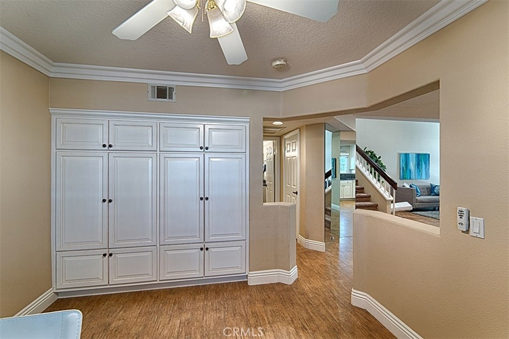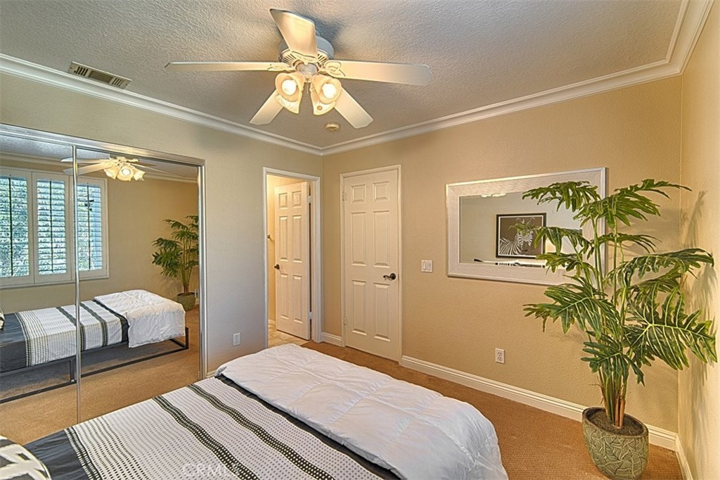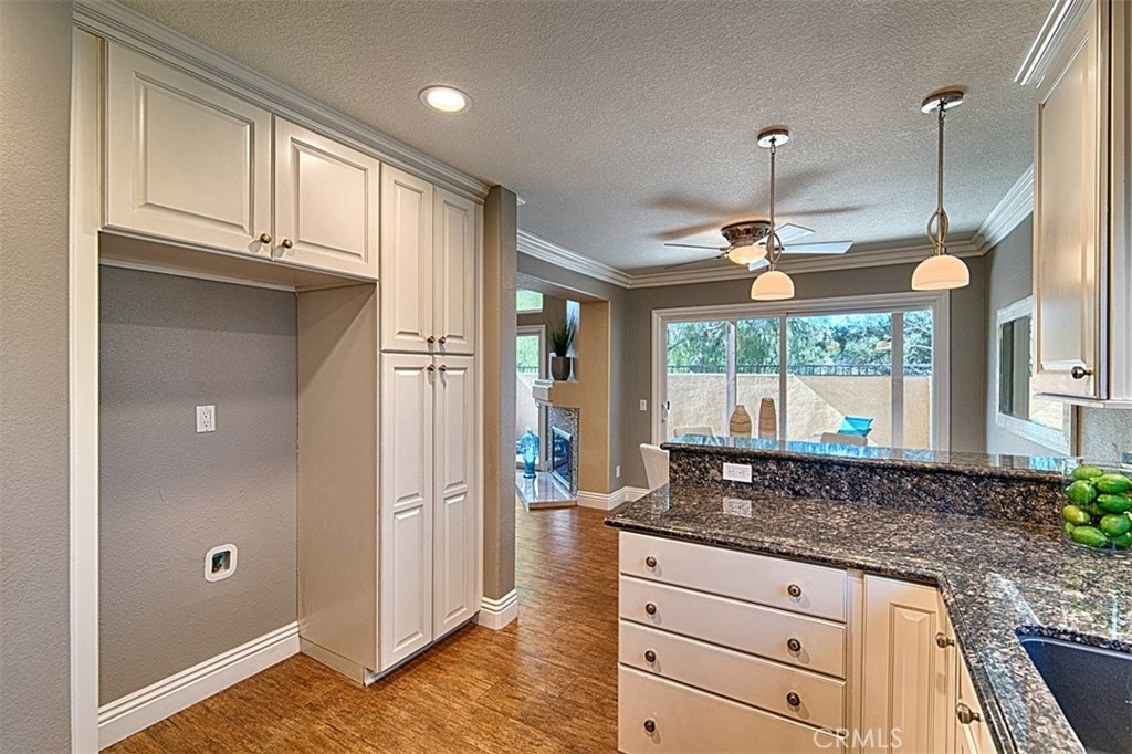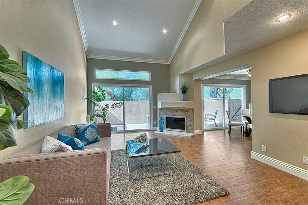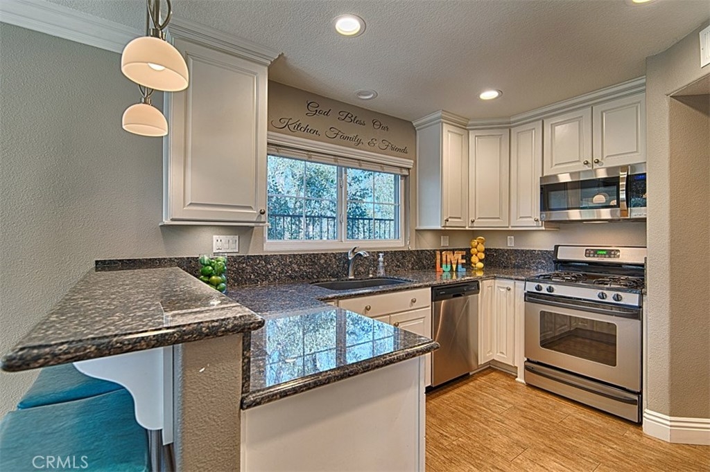 This highly sought-after end unit is the largest in the well-manicured Laurelwood community, w/no one behind you. Walk into an open concept floor plan w/two story ceilings in the light & bright living room w/recessed lighting, large white crown molding & baseboards, a gorgeous gas starter fireplace w/hearth & mantle which leads to the formal dining room. Both the dining & living rooms have large glass sliders to the relaxing, private backyard covered patio w/views of mature trees. Beautifully remodeled kitchen has lots of white, soft close cabinets & drawers, rich granite counter tops, stainless steel appliances, recessed lighting, a generous counter bar for seating, & a window over the sink. The downstairs bedroom is currently being used as an office & has a full wall of built in cabinets. The downstairs full bath has white cabinetry & granite countertop. The roomy master suite has a double door entrance, lush carpet, a huge walk in closet w/mirrored doors, & is attached to the spacious, light & bright bath w/rich dark cabinets & dual sinks, white quartz countertop & a linen closet. The second upstairs bedroom has a full-size bath & mirrored closet doors. Plantation shutters, lighted ceiling fans, large crown molding & baseboards; laundry room w/cabinets, an attached two car garage w/epoxy flooring & loads of storage round out this great property. The HOA has 2 pools & spas and generous amounts of guest parking. Private Showings Available.