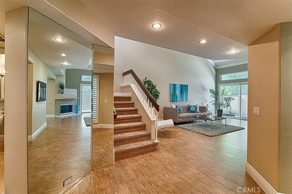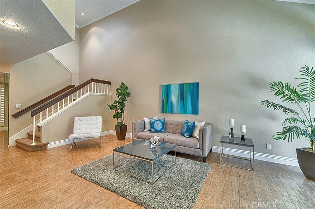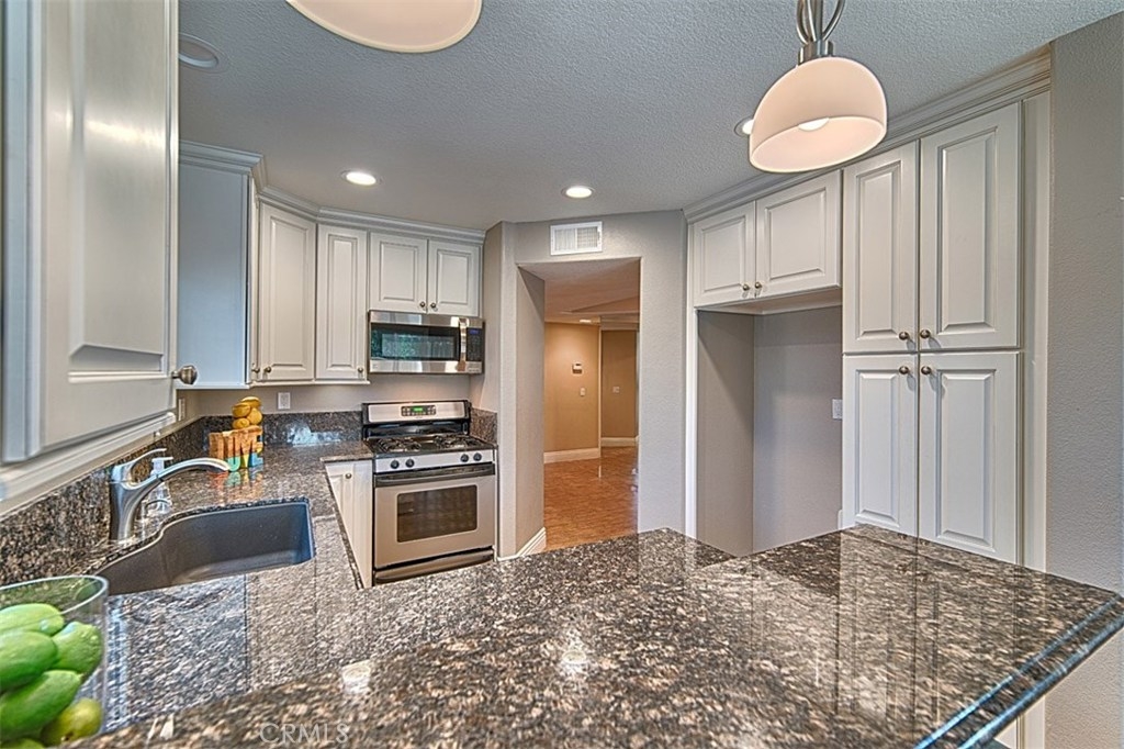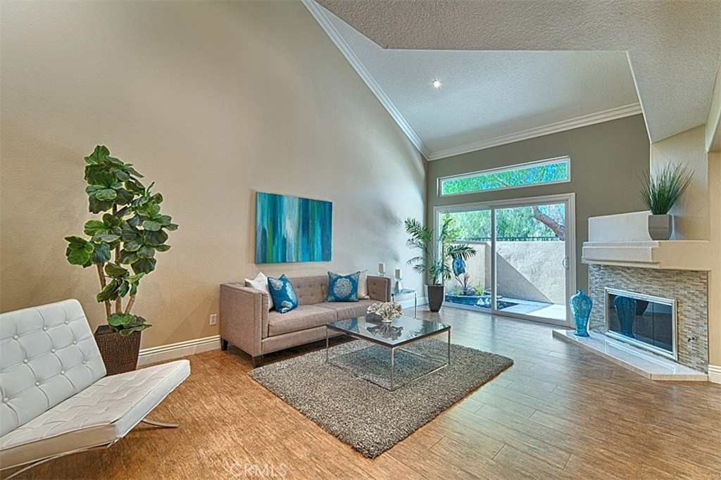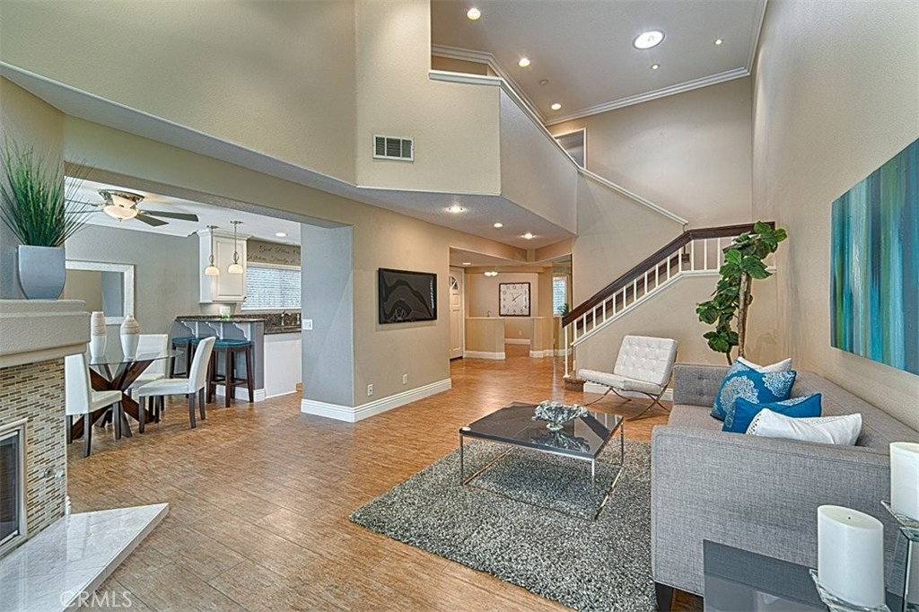 This highly sought-after end unit is the largest in the well-manicured Laurelwood community, w/no one behind you. Walk into an open concept floor plan w/two story ceilings in the light & bright living room w/recessed lighting, large white crown molding & baseboards, a gorgeous gas starter fireplace w/hearth & mantle which leads to the formal dining room. Both the dining & living rooms have large glass sliders to the relaxing, private backyard covered patio w/views of mature trees. Beautifully remodeled kitchen has lots of white, soft close cabinets & drawers, rich granite counter tops, stainless steel appliances, recessed lighting, a generous counter bar for seating, & a window over the sink. The downstairs bedroom is currently being used as an office & has a full wall of built in cabinets. The downstairs full bath has white cabinetry & granite countertop. The roomy master suite has a double door entrance, lush carpet, a huge walk in closet w/mirrored doors, & is attached to the spacious, light & bright bath w/rich dark cabinets & dual sinks, white quartz countertop & a linen closet. The second upstairs bedroom has a full-size bath & mirrored closet doors. Plantation shutters, lighted ceiling fans, large crown molding & baseboards; laundry room w/cabinets, an attached two car garage w/epoxy flooring & loads of storage round out this great property. The HOA has 2 pools & spas and generous amounts of guest parking. Private Showings Available.