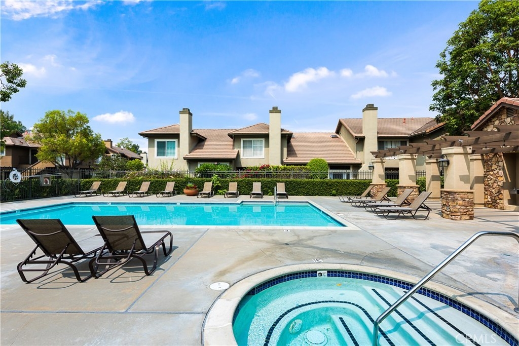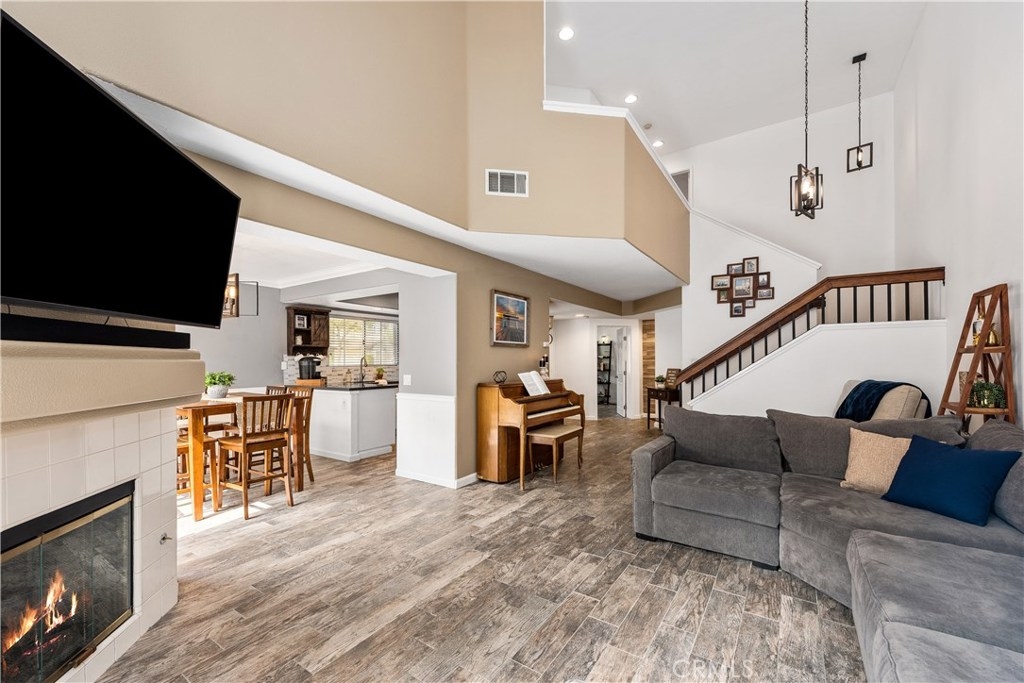 Located in a desirable community in Anaheim Hills, this stunning end unit includes 3 bedrooms and 3 bathrooms. Greeted by a well-manicured entrance you enter the front door into a bright, airy and perfectly fitted multi-level unit with gorgeous porcelain wood tile flowing throughout the home. The spacious living room features soaring ceilings and a large fireplace then flows seamlessly into a designer kitchen showcasing a stainless steel sink, custom cabinetry, quartz countertops and a spacious kitchen island bar. The fully upgraded kitchen and breakfast nook leads you outside to a spacious patio that is perfect for entertaining family and friends! Two beautifully designed bedrooms and bathrooms are located upstairs, including the Master with a gorgeous, bathroom featuring a double vanity and a walk-in closet. An additional bedroom and upgraded bathroom are located on the main level which offers an ideal layout for family living or work-from-home space. Resort-style amenities include an outdoor pool area with lounge chairs. Additional upgrades include new flooring throughout the unit, light fixtures, quartz countertops, and recessed lighting. This beautiful home is bound to go quickly – schedule a showing today!