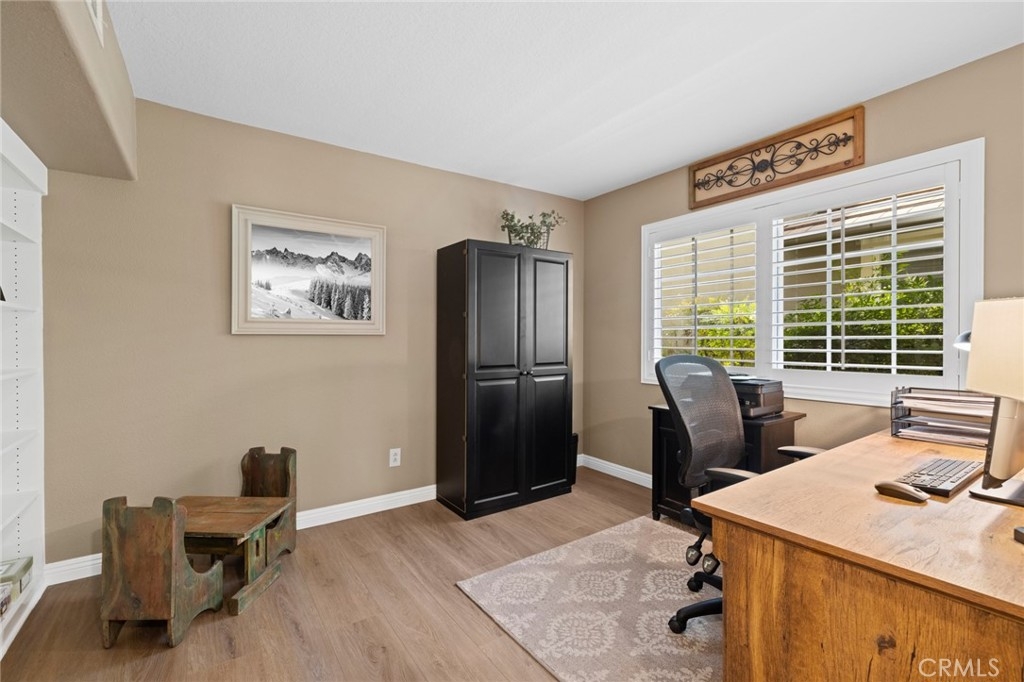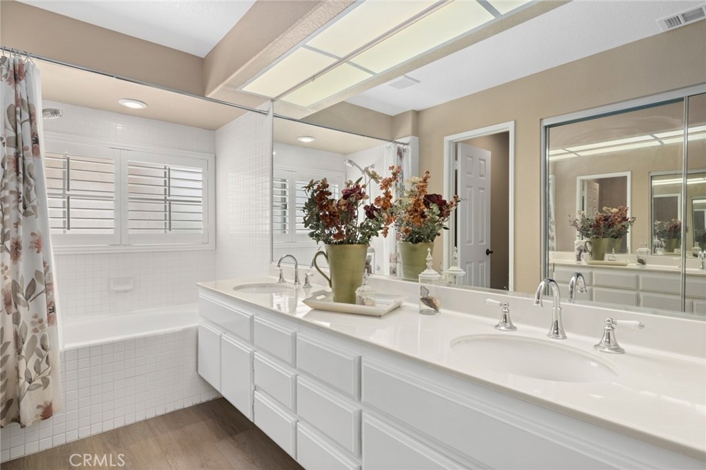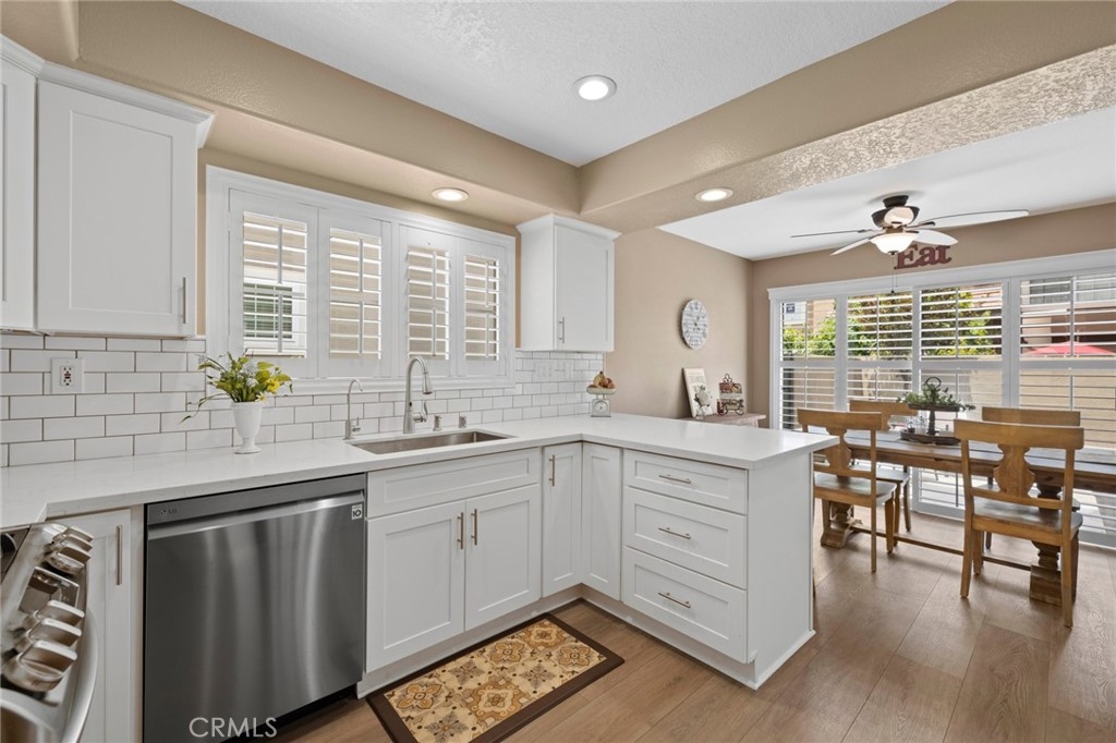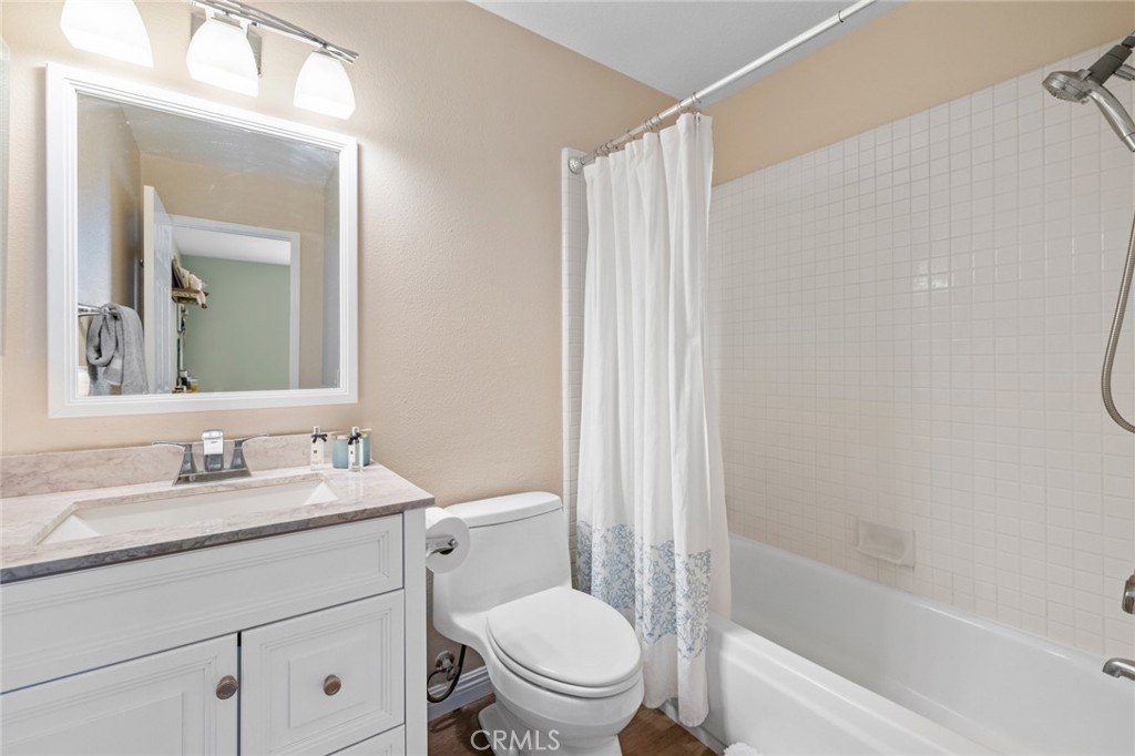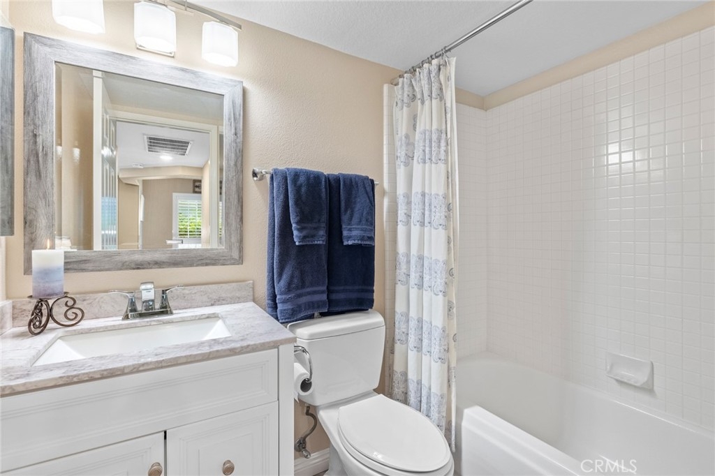 Ready to be impressed? This completely redone property boasts one of the largest 3-bedroom condo floorplans in all of Anaheim Hills, stylized with the latest in popular finishes and amenities. Step inside and fall in love! Luxury vinyl flooring spans throughout creating a light and airy flowing atmosphere. Sure to please is the newly completed kitchen with bright white shaker cabinetry with soft close doors & drawers, sleek quartz countertops with full subway tile splash, and top of the line LG appliances. The spacious living room offers two-story ceilings, a warming fireplace and generous slider that leads out to your own private sun-soaked patio. Dining area also features a second slider out expanding the versatility and functionality of this bright and open floorplan. Desirable downstairs bedroom is currently used as an open office, but can easily be closed in for privacy. A full downstairs bath plus laundry room finishes the lower level. Upstairs leads to the primary suite with oversized bathroom and generous walk-in closet. The second bedroom upstairs is finished with mirrored wardrobe doors and an en-suite full bath. Soothing neutral wall tones, rich plantation shutters, new hardware, and freshly painted throughout creates a "brand new home" feeling. As a bonus, the attached two-car garage, with FULL driveway, is finished with epoxy flooring and built-in storage.. Ideal location within this desirable community featuring two sparkling pools to enjoy!