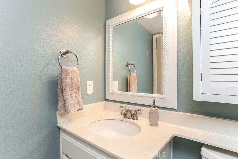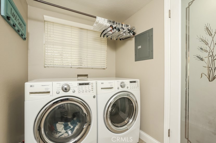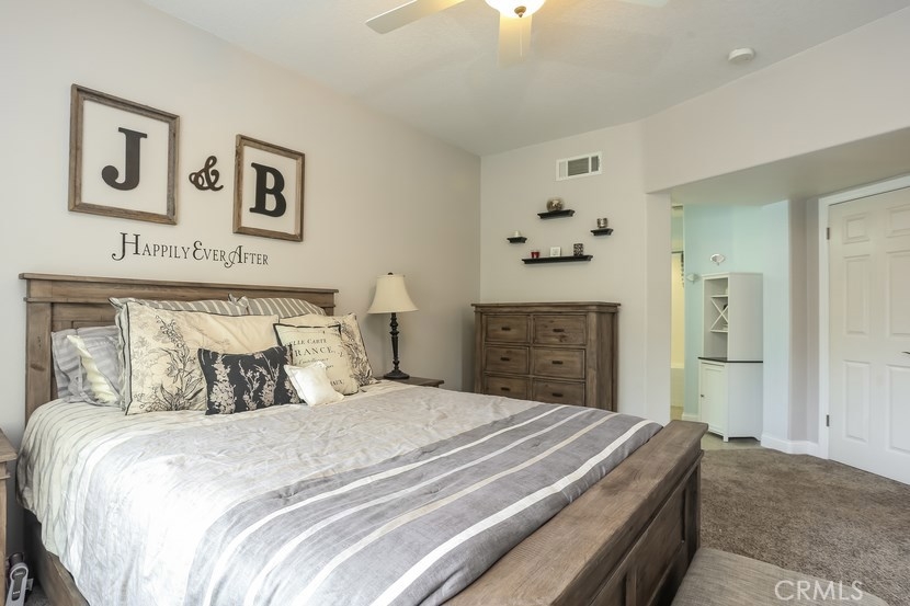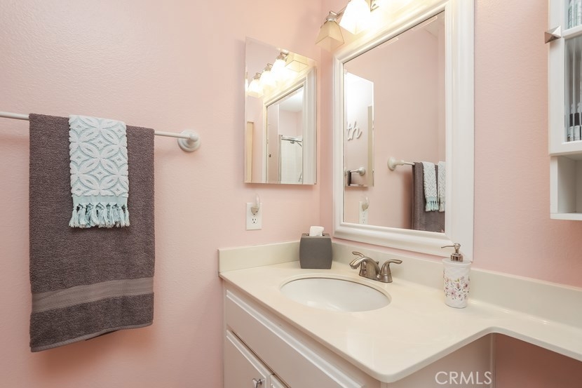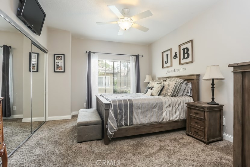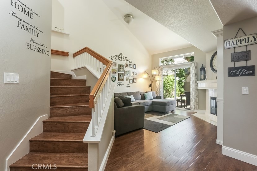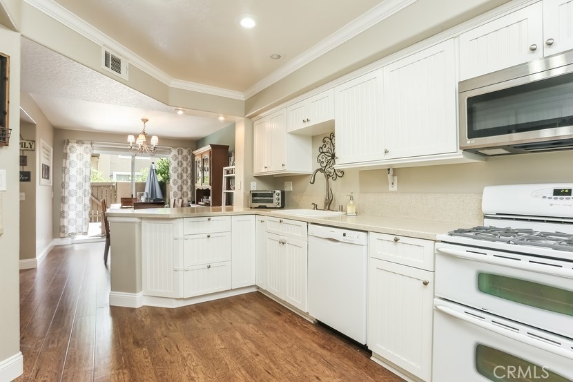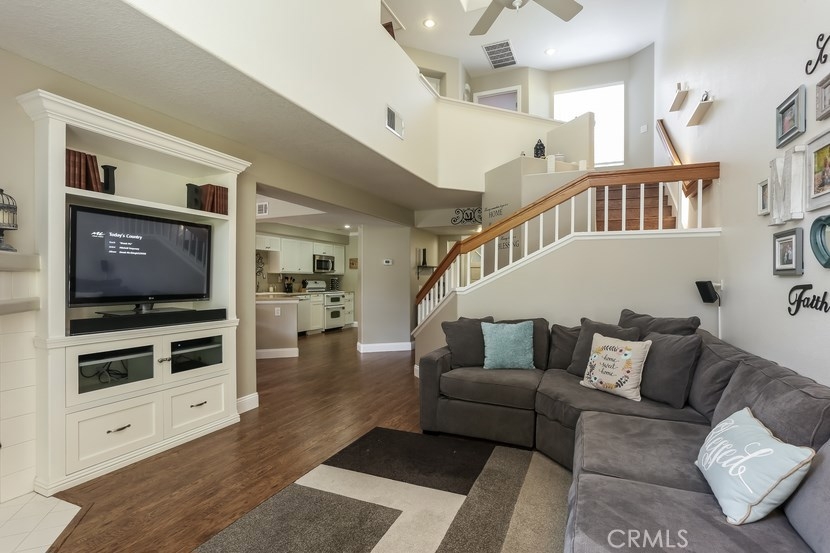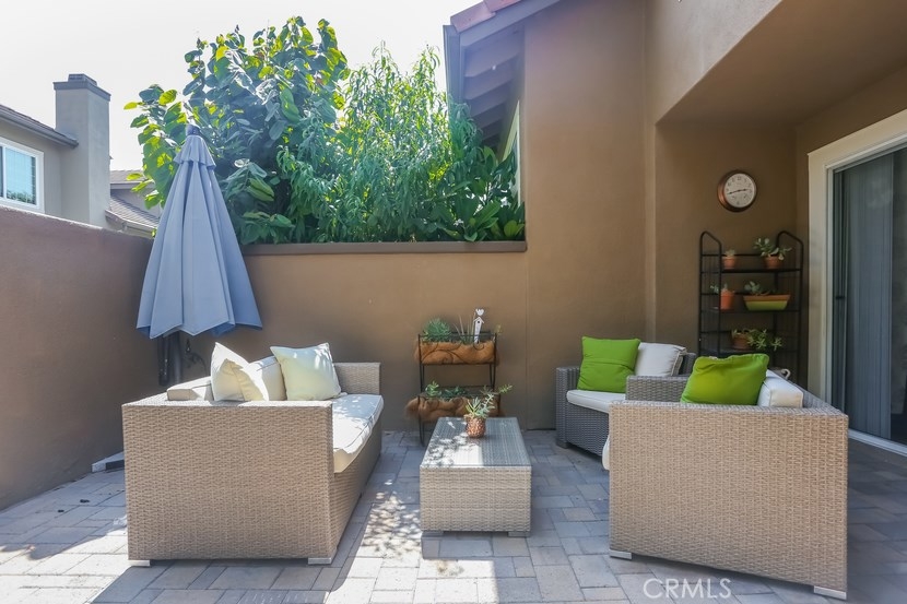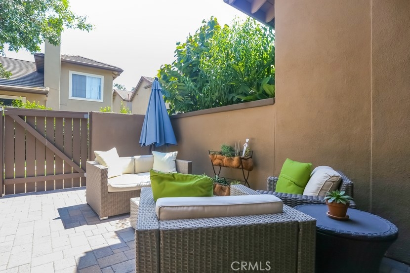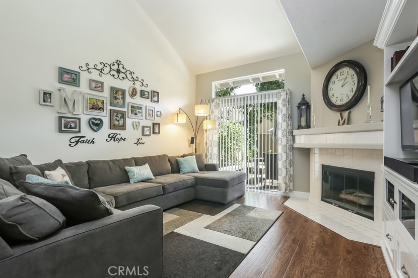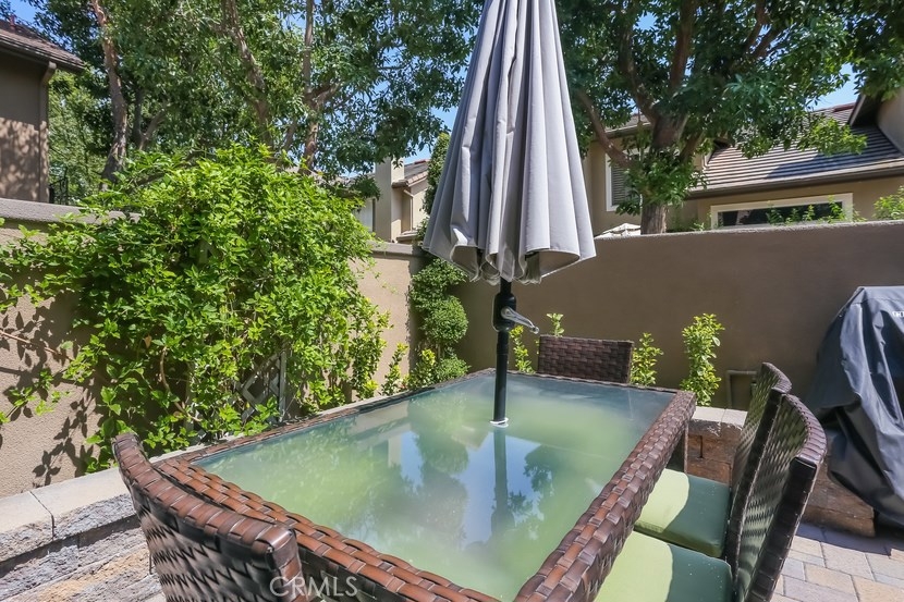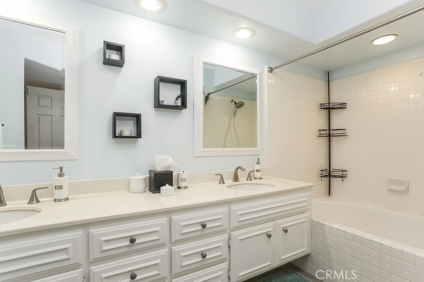 Charming updated 2 master bedrooms, 2.5 bath home in the prestigious community of Laurelwood. Beautiful greenbelt, two community pools and jacuzzi. Upon entering the home, you will love the open, light and bright living room with high vaulted ceilings, cozy fireplace, built-in entertainment wall unit. Gourmet kitchen is upgraded with corian counters, white modern cabinets with soft close and pull-outs, deep sink with brushed nickle faucet, oven/range with warmer, dishwasher & microwave. Step into the spacious dining room great for entertaining. Home offers recessed lighting, designer wood laminate flooring, newer paint, custom 5" floor boards, ceiling fans, large entry closet with storage. Individual laundry room with built-in large cabinet for storage. Master Suite has a spacious dressing area, dual sinks with ample counter space, oval soaking tub for relaxing w/shower, large mirrored wardrobe custom designed closets in both bedrooms. This home has two entries to the extensive upgraded private back patio with pavers, brick seating area and more... Perfect patio location to pool/spa. Two car garage with direct access to home, space for a workshop, with rare-to-find 2 car driveway for guest parking, community guest parking, Walk to shopping center with grocery, restaurants and more, park, walking trails , top-rated schools,and pre-schools, close to freeway access.