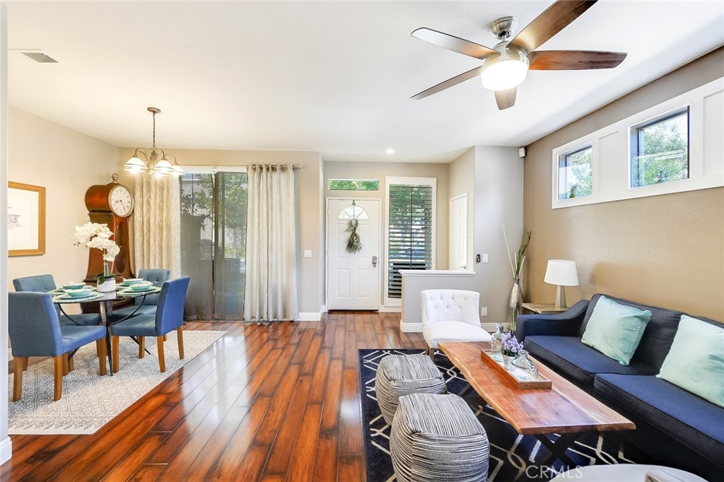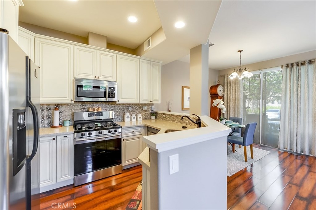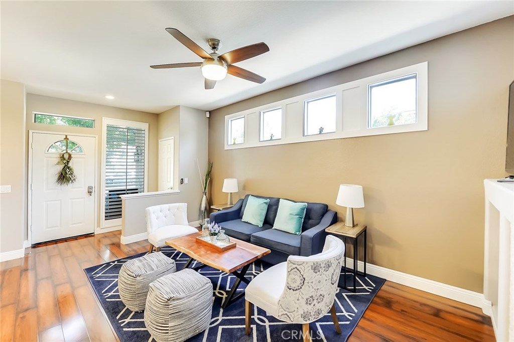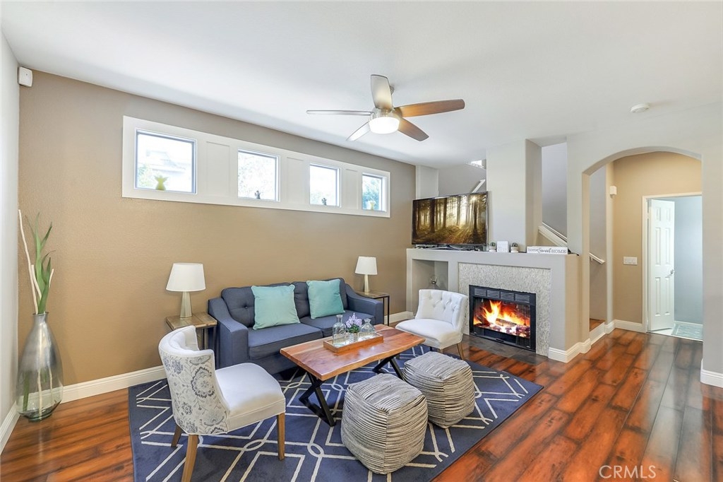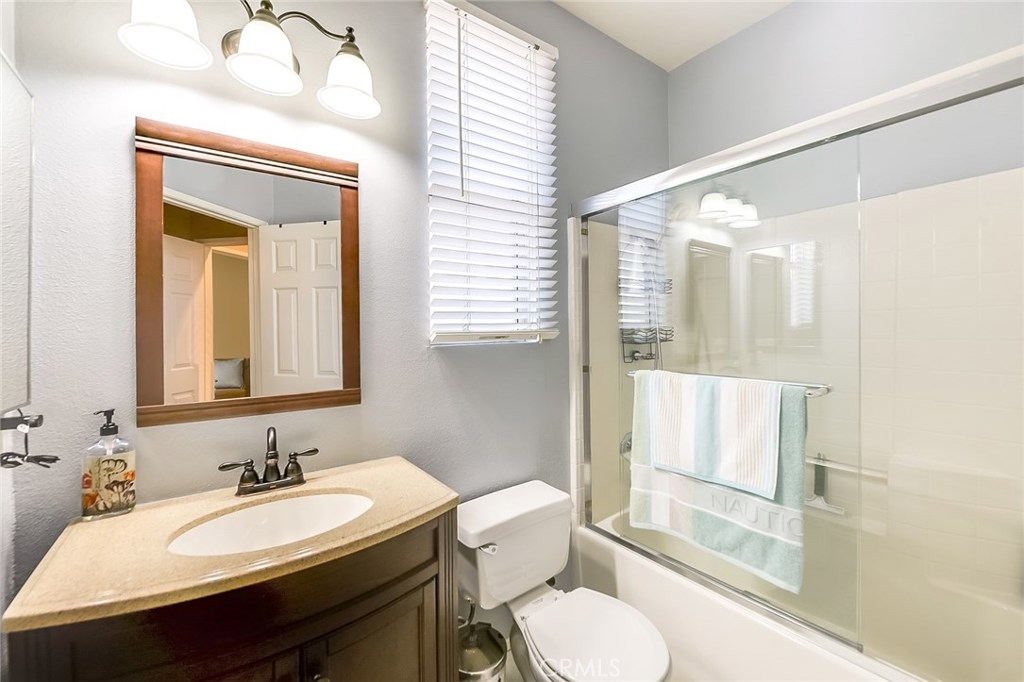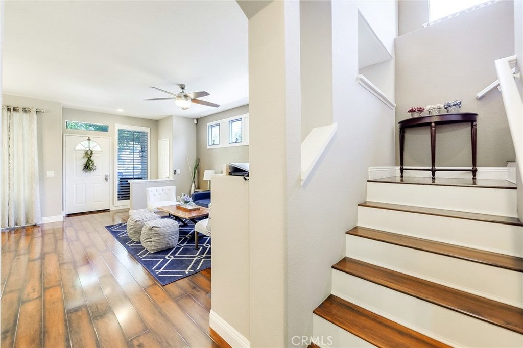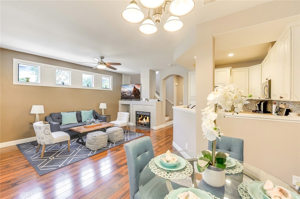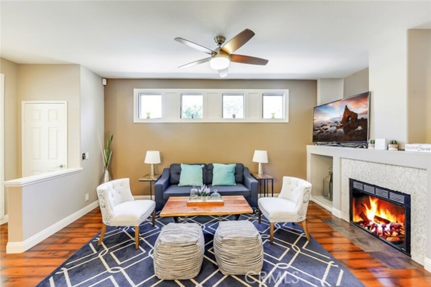 Nestled in the serene Monaco community of Anaheim Hills is this freshly remodeled 2-story end-unit! Perfectly sized for your family with 2 bedrooms and 2 full bathrooms upstairs and an additional bathroom downstairs for guests. The kitchen has been updated with granite countertops and stainless steel appliances, and all 3 bathrooms newly updated with modern fixtures as well. Living room features a cozy gas-burning fireplace. Have your morning coffee on the patio off the dining area, and enjoy the fresh air out on the master bedroom deck. Inside laundry and direct access from a 2-car garage! Laminated wood floors throughout and accent stairs and custom paint. Brand new AC system, less than a year old. Plenty of natural light throughout! Highly sought-after neighborhood with resort-style pool & spa, barbecues, tennis courts, fitness center, clubhouse, and low HOA fee!