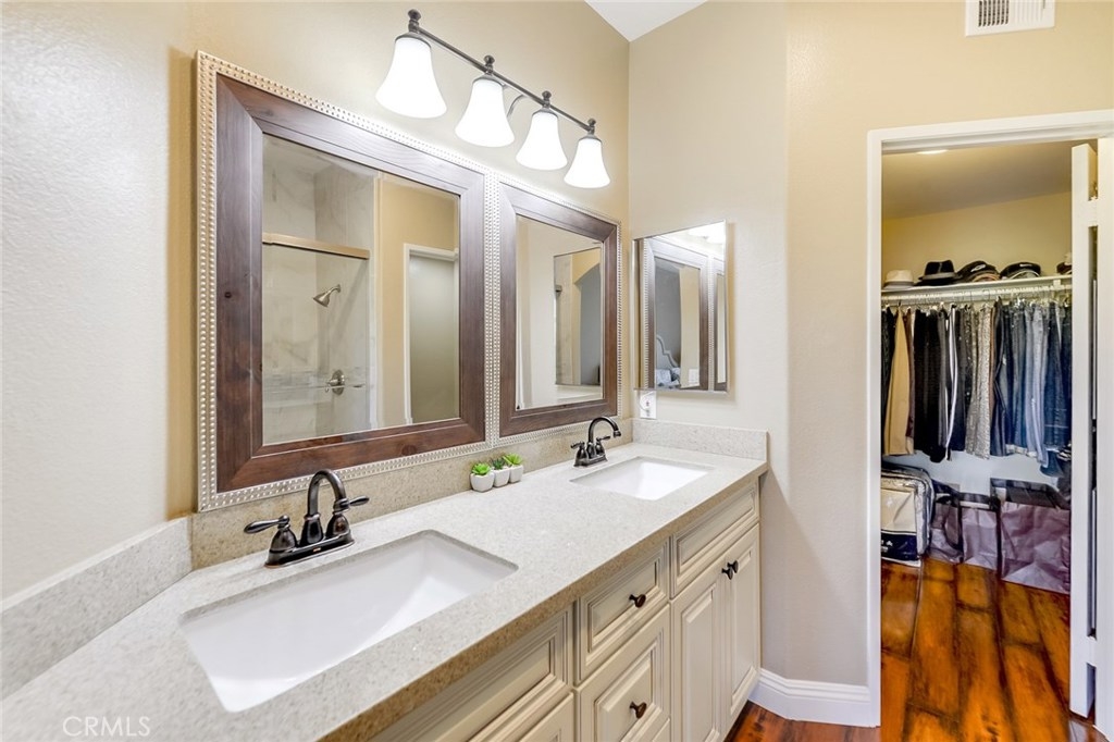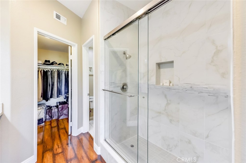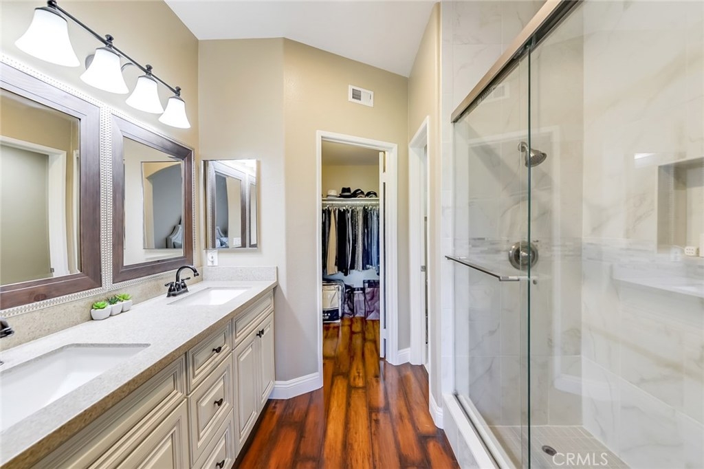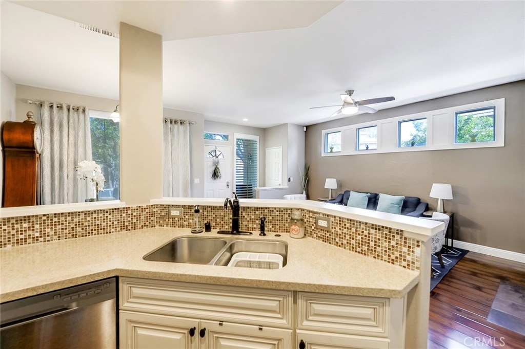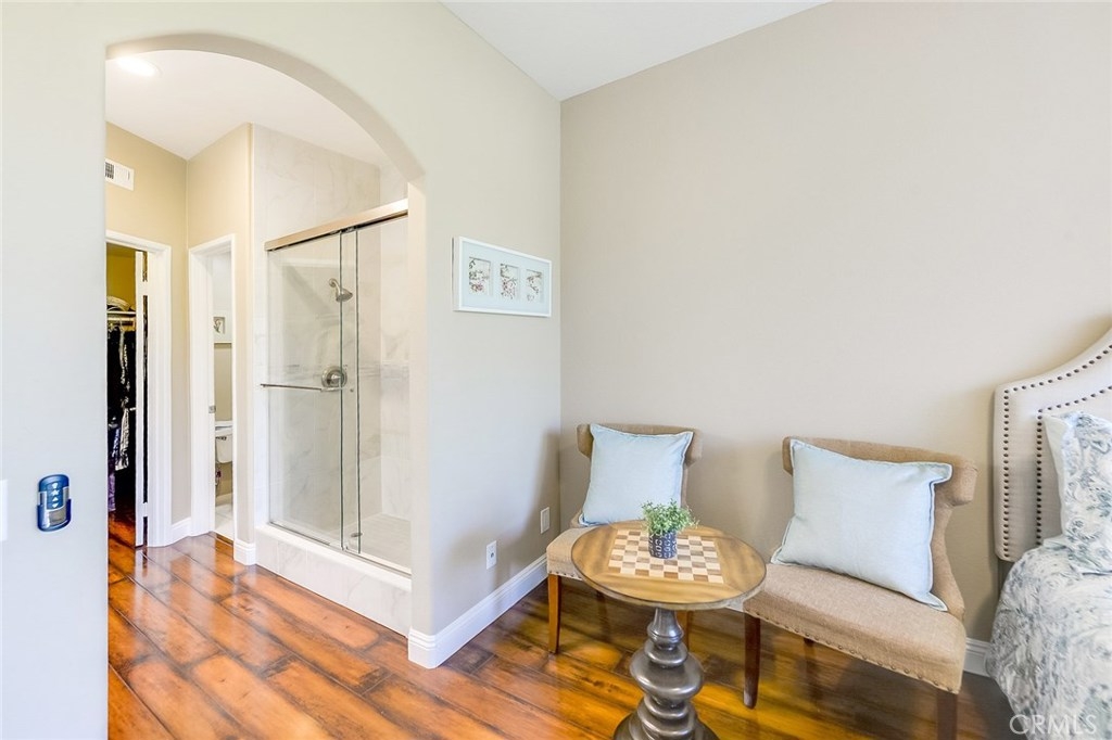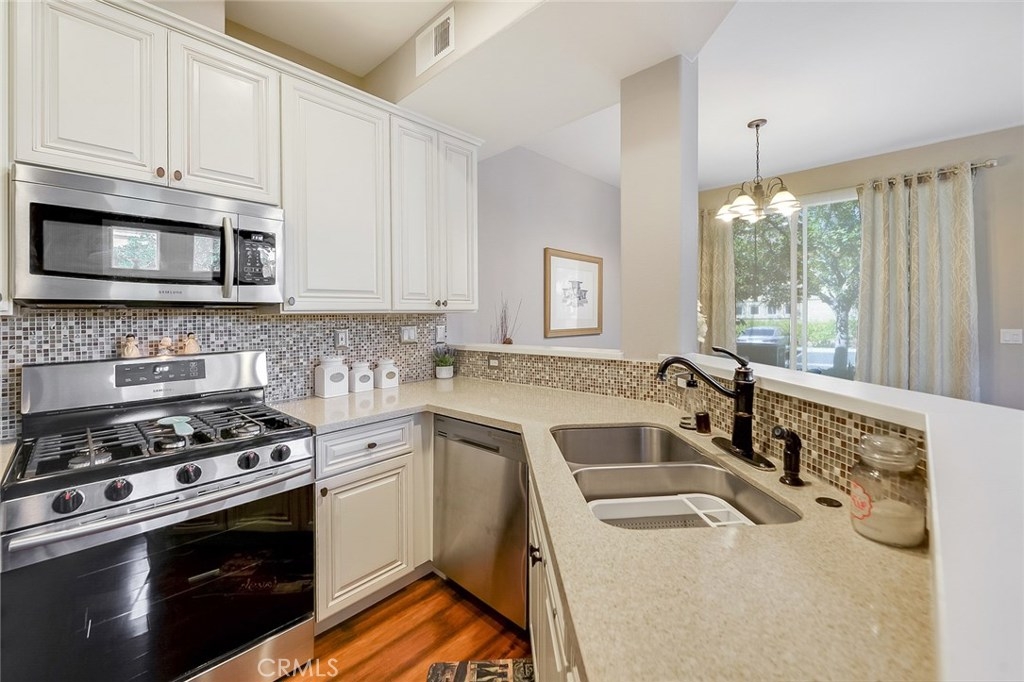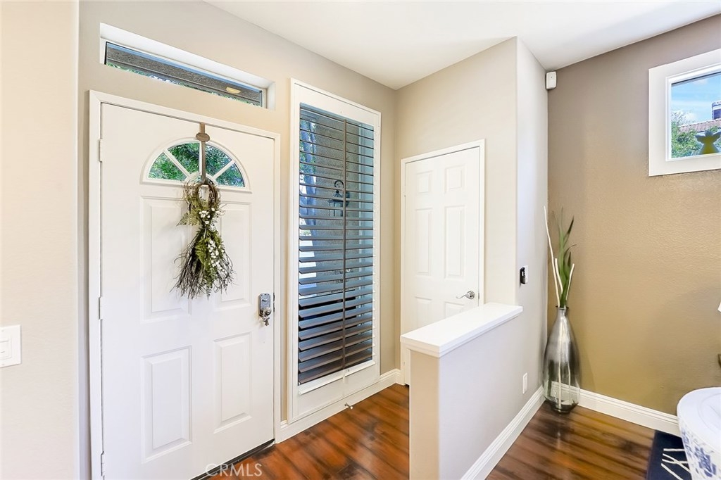 Nestled in the serene Monaco community of Anaheim Hills is this freshly remodeled 2-story end-unit! Perfectly sized for your family with 2 bedrooms and 2 full bathrooms upstairs and an additional bathroom downstairs for guests. The kitchen has been updated with granite countertops and stainless steel appliances, and all 3 bathrooms newly updated with modern fixtures as well. Living room features a cozy gas-burning fireplace. Have your morning coffee on the patio off the dining area, and enjoy the fresh air out on the master bedroom deck. Inside laundry and direct access from a 2-car garage! Laminated wood floors throughout and accent stairs and custom paint. Brand new AC system, less than a year old. Plenty of natural light throughout! Highly sought-after neighborhood with resort-style pool & spa, barbecues, tennis courts, fitness center, clubhouse, and low HOA fee!