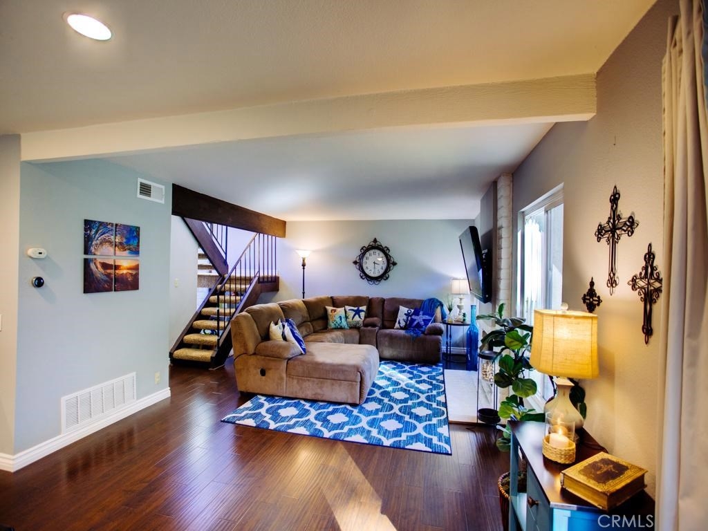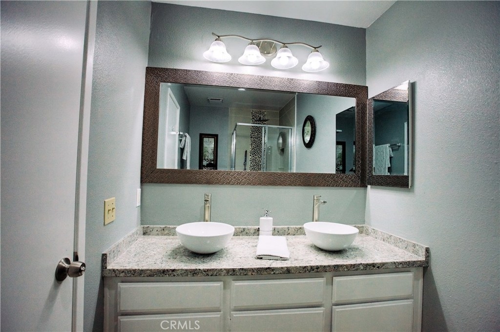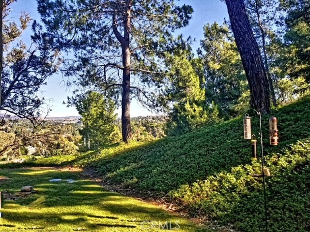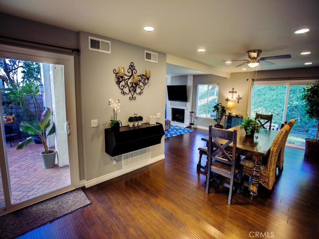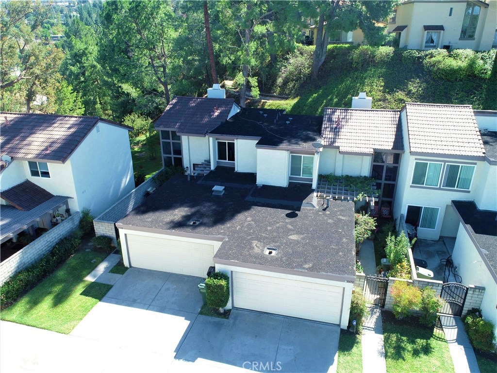 PRICED TO SELL! UPGRADED PRIVATE, QUIET OPEN FLOOR PLAN CORNER UNIT in Anaheim Hills 2 bdrm, 3 bath, 2 story townhouse nestled among trees w/ VIEWS of CITY LIGHTS, HILLS, TREES and MOUNTAINS. LARGE FRONT PRIVATE PATIO with Herringbone brick great for barbecuing & entertaining. NATURE LOVERS, THIS IS THE ONE FOR YOU! Upgraded dual pane windows in living room with wide plank dark laminate hardwood floors downstairs, brick gas fireplace for those wintry nights, freshly painted in gray tones, remodeled half bath downstairs with new tile floor, new vanity, new granite counter, new mirror, new light fixture. Entertain guests in the extra large dining area with new remote controlled ceiling fan -- large enough for a formal dining table. Dual pane sliders lead to greenbelt area where you can sit & enjoy the LUSCIOUS TREES and VIEWS. Upgraded kitchen with white shaker cabinets, granite counter tops, crown molding, recess lights, newer stainless steel appliances with trees view from kitchen window. TWO MASTER BEDROOMS w/ ensuite bathrooms. BOTH MASTER BEDROOMS HAVE VIEWS! Larger master has dual closets. Remodeled master bath has a new custom mirror, new tile floor, new dual bowl sinks, new Formica counter (looks like granite) new hardware, walk-in shower with custom tile work. SECOND MASTER bedroom has city lights view, upgraded vanity w/ large bowl sink, new tile floor, new mirror & Formica counter. Views from floor to ceiling window brings in NATURAL LIGHTING. Great location!