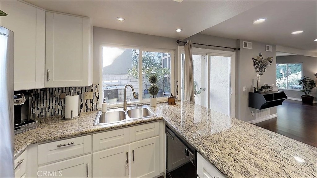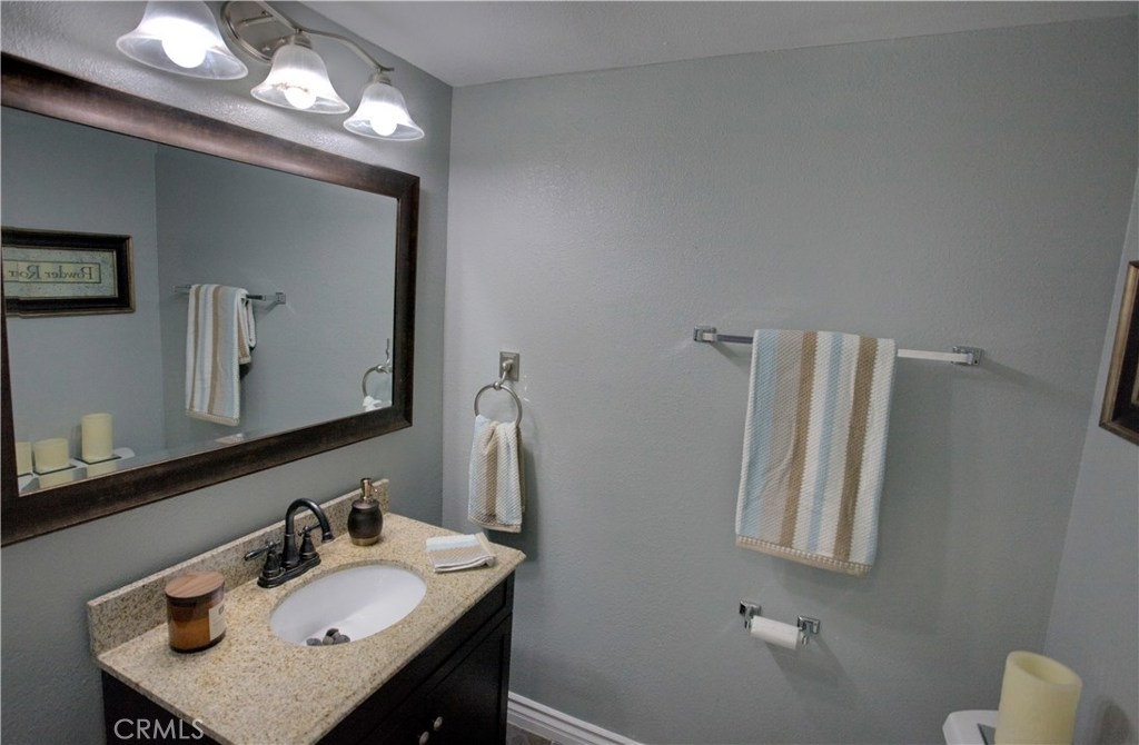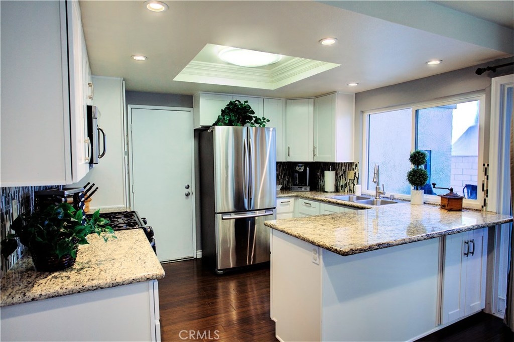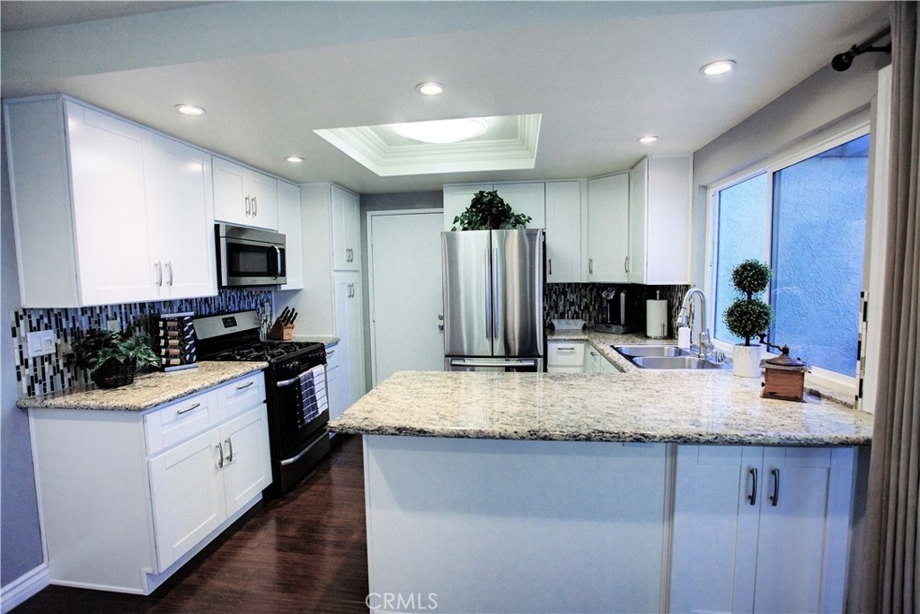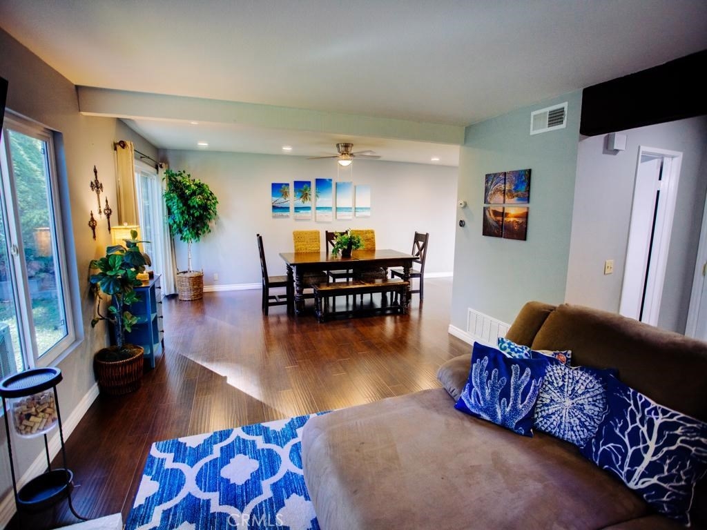 PRICED TO SELL! UPGRADED PRIVATE, QUIET OPEN FLOOR PLAN CORNER UNIT in Anaheim Hills 2 bdrm, 3 bath, 2 story townhouse nestled among trees w/ VIEWS of CITY LIGHTS, HILLS, TREES and MOUNTAINS. LARGE FRONT PRIVATE PATIO with Herringbone brick great for barbecuing & entertaining. NATURE LOVERS, THIS IS THE ONE FOR YOU! Upgraded dual pane windows in living room with wide plank dark laminate hardwood floors downstairs, brick gas fireplace for those wintry nights, freshly painted in gray tones, remodeled half bath downstairs with new tile floor, new vanity, new granite counter, new mirror, new light fixture. Entertain guests in the extra large dining area with new remote controlled ceiling fan -- large enough for a formal dining table. Dual pane sliders lead to greenbelt area where you can sit & enjoy the LUSCIOUS TREES and VIEWS. Upgraded kitchen with white shaker cabinets, granite counter tops, crown molding, recess lights, newer stainless steel appliances with trees view from kitchen window. TWO MASTER BEDROOMS w/ ensuite bathrooms. BOTH MASTER BEDROOMS HAVE VIEWS! Larger master has dual closets. Remodeled master bath has a new custom mirror, new tile floor, new dual bowl sinks, new Formica counter (looks like granite) new hardware, walk-in shower with custom tile work. SECOND MASTER bedroom has city lights view, upgraded vanity w/ large bowl sink, new tile floor, new mirror & Formica counter. Views from floor to ceiling window brings in NATURAL LIGHTING. Great location!