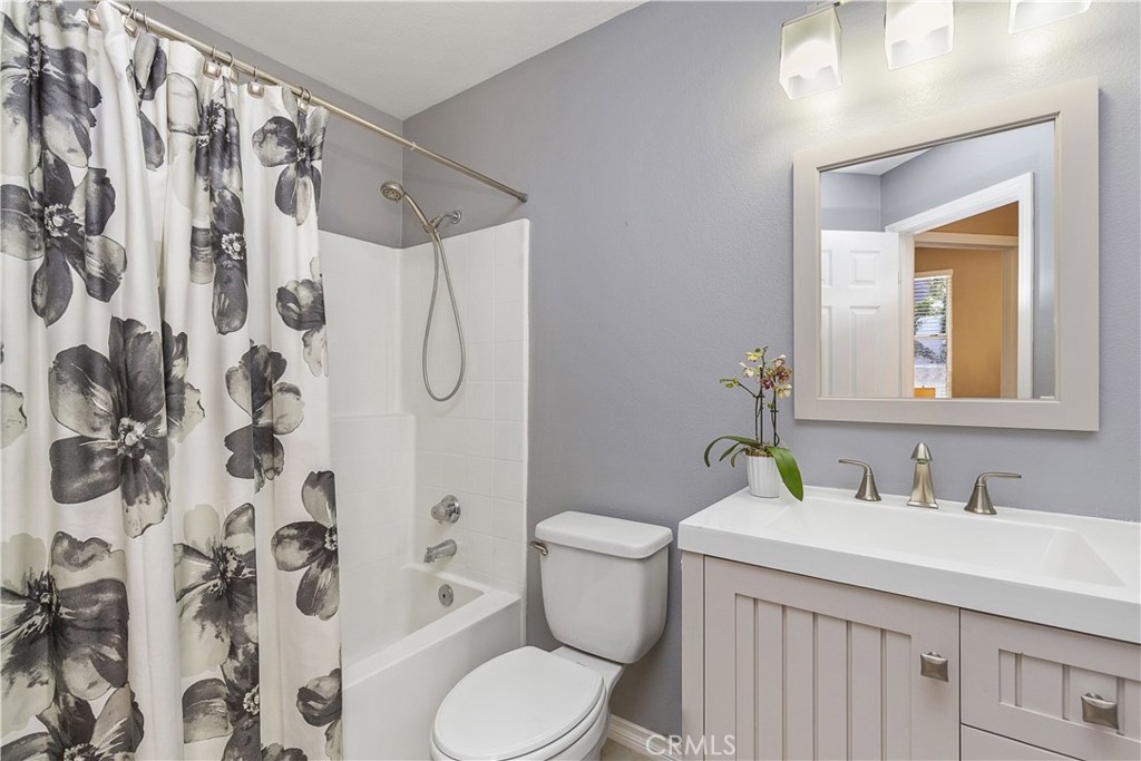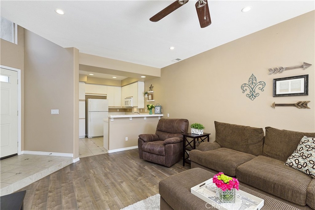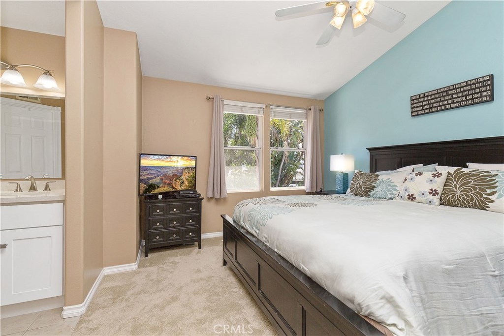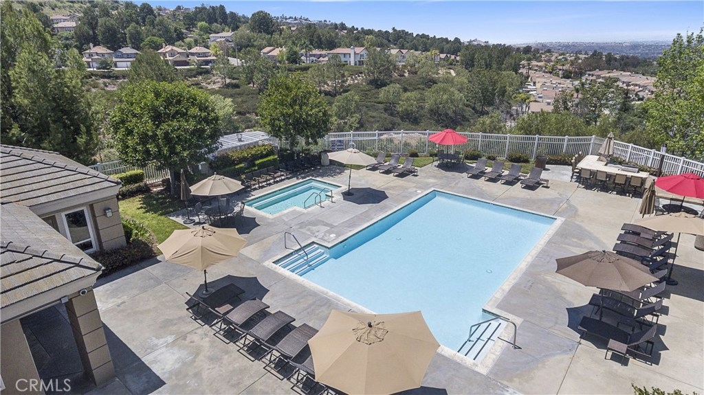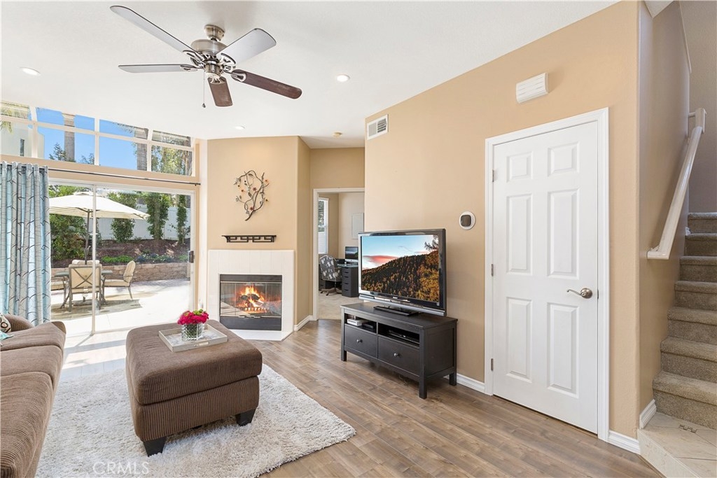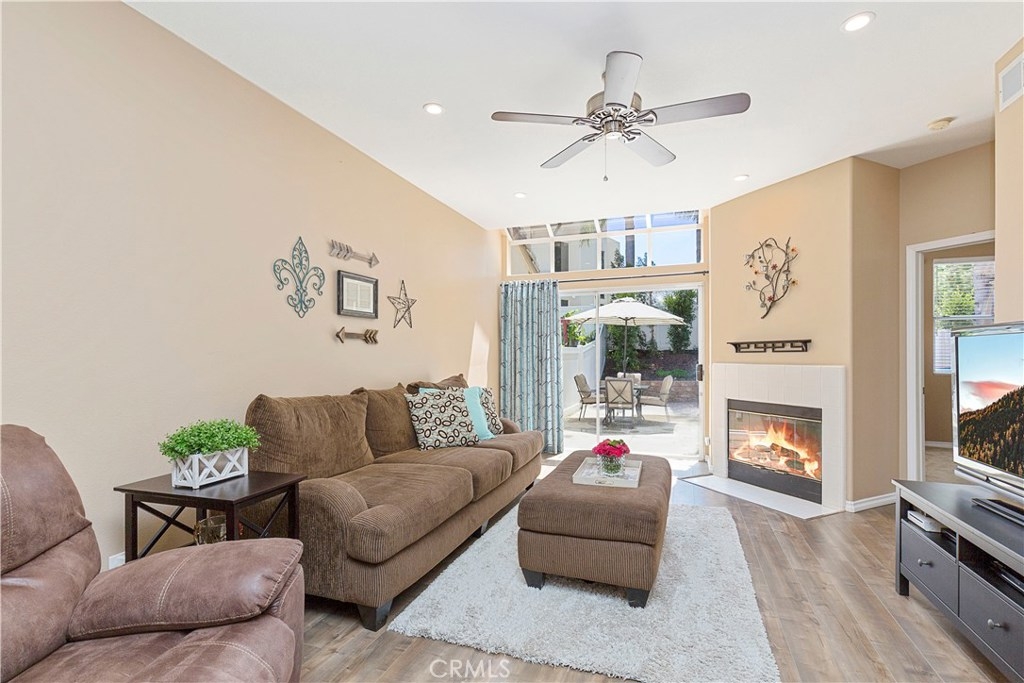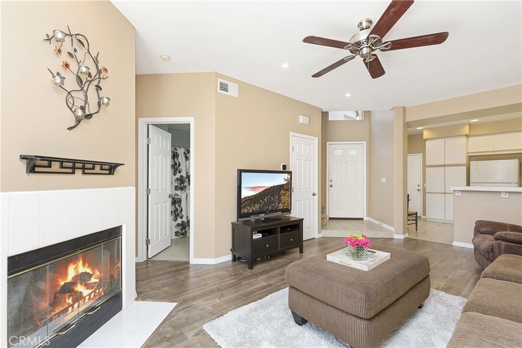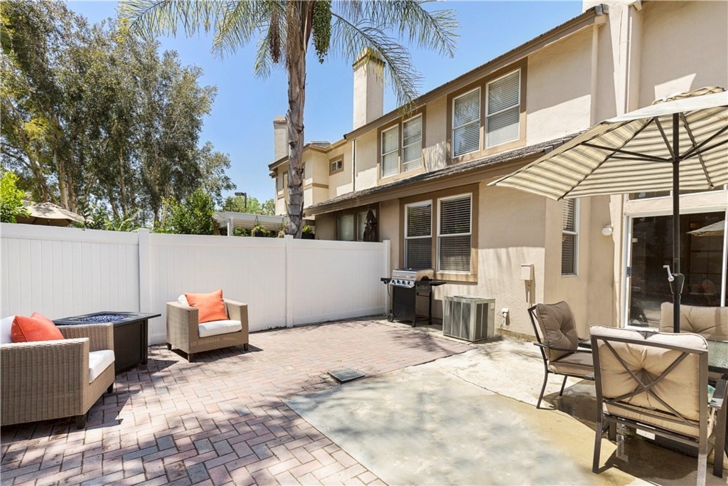 Welcome to Summit Court! This desirable plan has 3 Bedrooms with 3 Bathrooms and tons of natural light! 1 Bedroom and a Bath are located Downstairs. Once you enter this home, you are welcomed into the well lit living room with wood flooring, neutral paint, recessed lighting, ceiling fan and a fireplace. From living room and kitchen, you'll enjoy the view to your own back yard with tons of room to entertain, play games or simply relax. The kitchen has a gas stove-top and oven, dishwasher and microwave with ample cabinet space for all your kitchen needs. Kitchen has access to attached garage with inside laundry area. Upstairs the Master Bedroom features ceiling fan, wooden window blinds and a view of your own lush green backyard. The master bathroom has been upgraded with gorgeous Quartz Counters and Vanity with his and hers sinks, a shower over a tub, a walk in closet and private toilet room. The additional upstairs bedroom has a ceiling fan and it's own bathroom with a walk-in shower. Upgrades include recessed lighting, custom wooden window blinds, ceiling fans, quartz counters, Ecobee thermostat and so much more. The Summit Court community amenities include gated pool and spa with lounge chairs and umbrellas, gas bbq's, gated playground, private gym, and clubhouse. This home is located close by Running Springs Elementary School, numerous hiking trails, Ronald Reagan Park, Tons of Shopping, Restaurants, Library, 91 Freeway and 241 Toll Road.