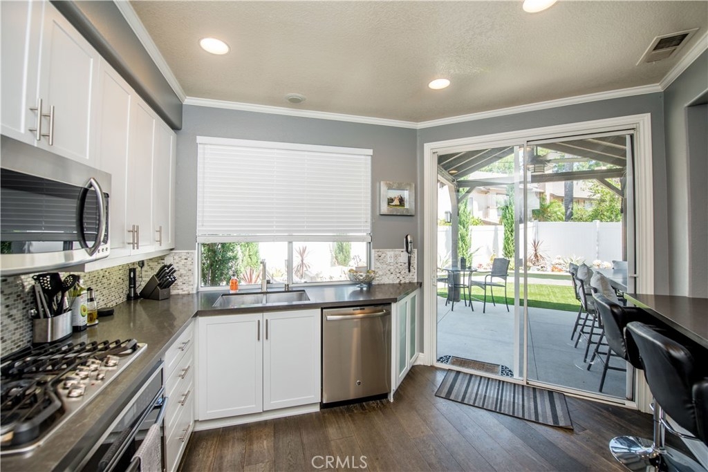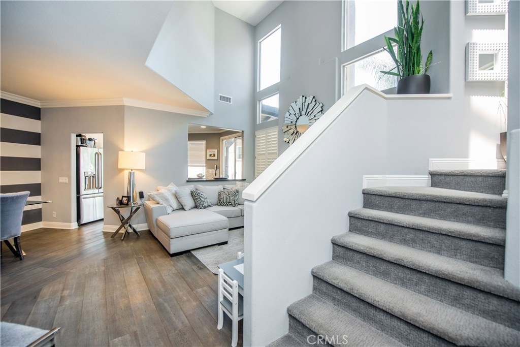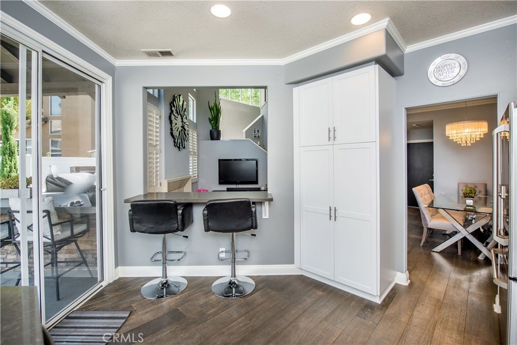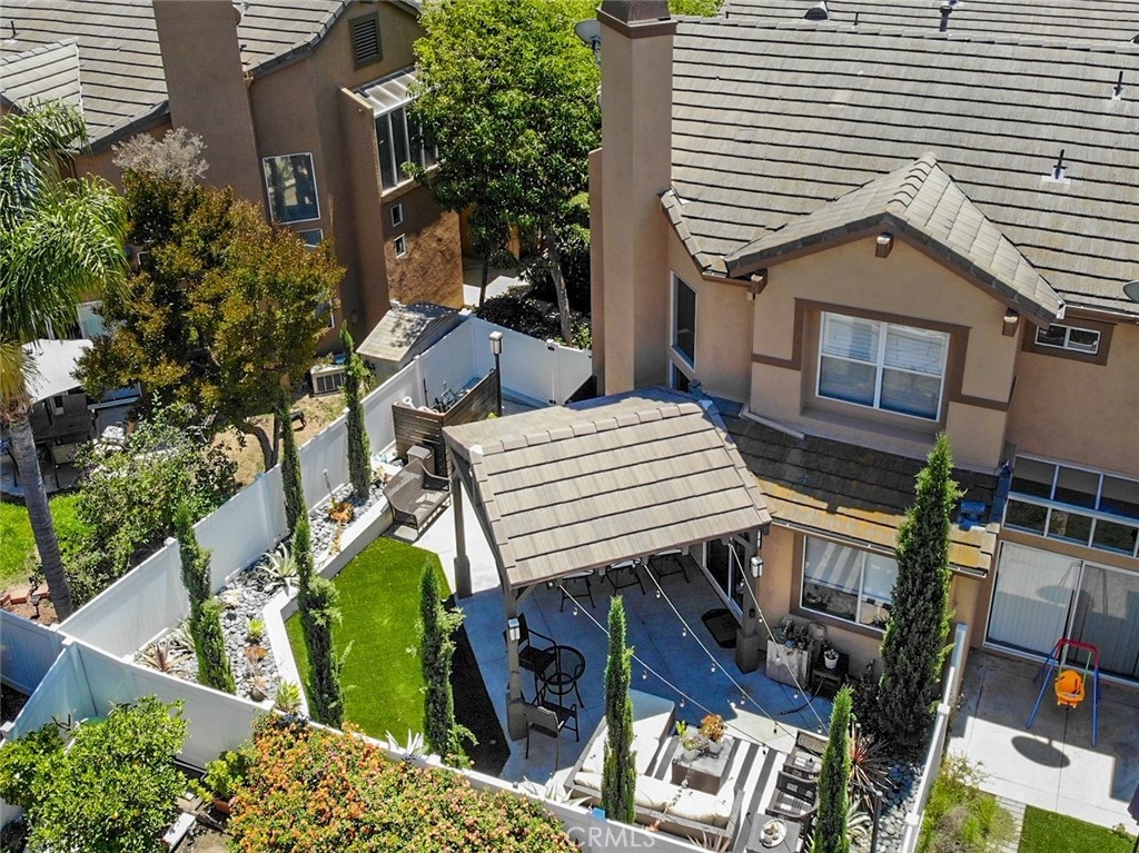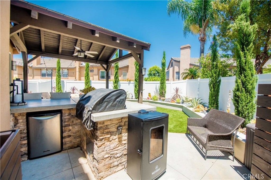Entertainer’s Delight! In Anaheim Hills’ Summit Court, 3-bedroom, 2.75-bath home. With a side-by-side two-car garage with direct access to the home. As you walk into the home, you will notice the beautiful flooring and the open concept to give it a spacious feel, and the amazing sandstone surrounding the fireplace, luxurious baseboards, and crown molding make the main living room area elegant. Plantation shutters in most rooms. Recessed LED can light in two of the bedrooms will save on energy costs while providing ample lighting. The kitchen has been upgraded with all newer GE appliances, exquisite white cabinets, undercabinet lights, tile backsplash, and Caesar Stone countertops. One of the bedrooms features a built-in desk for a private and quiet home office area perfect for remote work. The laundry room has convenient modern cabinets with hamper drawers. The Master bathroom has been upgraded with a beautiful, framed mirror, walk-in tiled shower with glass doors, modern cabinets, and Caesar Stone countertops with a tile backsplash. The backyard area is perfect for entertaining. Amazing concrete tiled patio cover and a ceiling fan will keep your guests comfortable as you entertain and cook on the built-in BBQ island with refrigerator and concrete countertops. Stained wood fencing around the trash cans and AC put a finishing touch to the backyard. Easy to maintain backyard with artificial turf and concrete so very little yard work required.