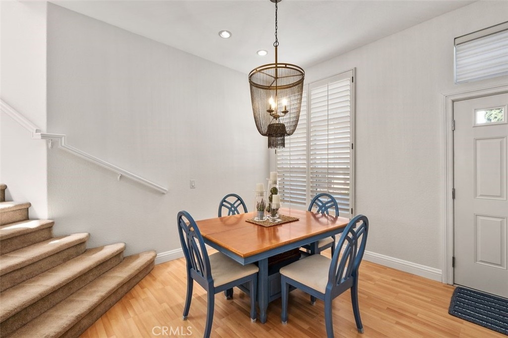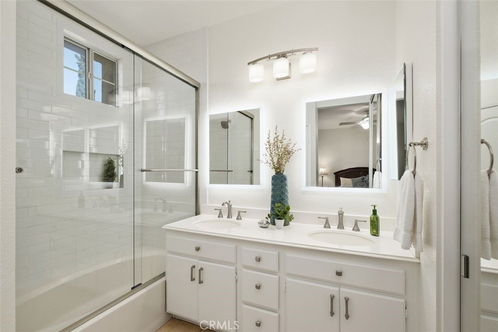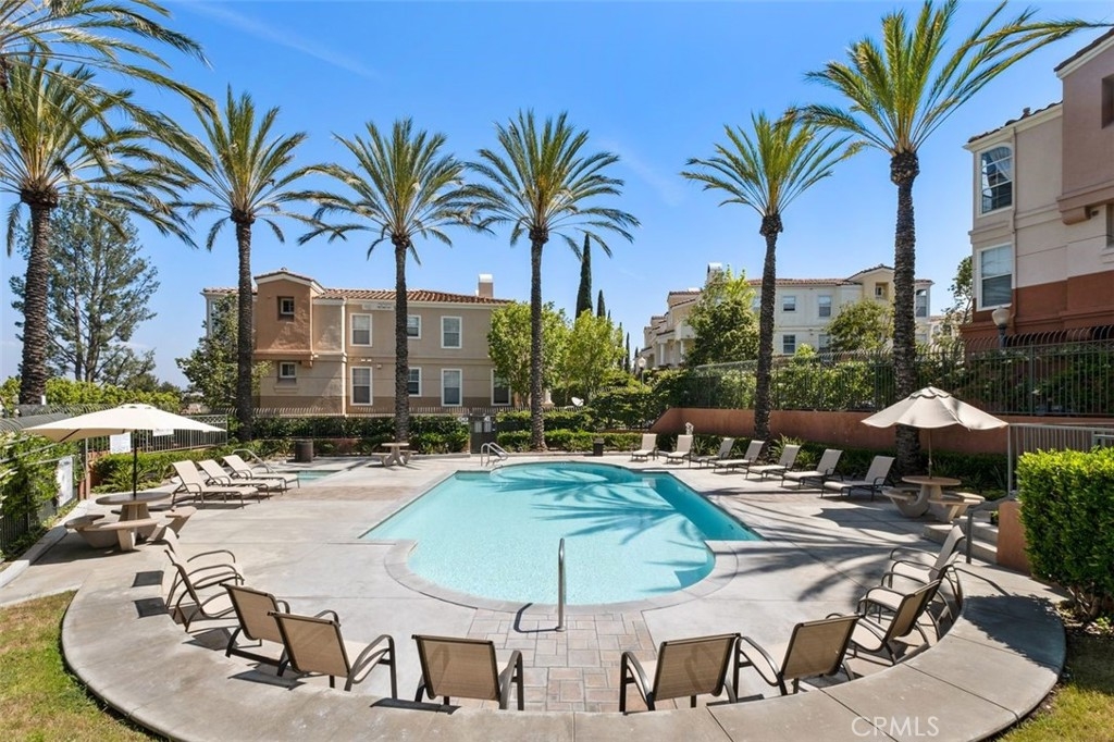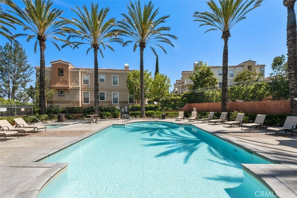 This brilliantly updated condominium is situated in the prestigious Summit Renaissance community of Anaheim Hills. Meticulously cared for, this three bedroom, three bathroom home is ready for you to call home. As you approach, you are greeted by the open patio with white vinyl fencing and manicured landscaping. Once inside, the crisp white walls, laminate wood flooring and open concept invite you in with open arms. The living room features a fireplace filled with blue crystal highlights, plantation shutters and canned lighting. Opening to the dining area and kitchen you have the convenience of enjoying conversation with company or a peaceful night inside. The kitchen features light cabinetry, neutral Corian countertops and white appliances. Off the kitchen is the downstairs bedroom currently used as an office with access to a full bath with a walk-in shower. Upstairs is the master bedroom featuring an en-suite bathroom with an updated shower and vanity. Across the hall is the upstairs guest room with an en-suite bath. Enjoy the privacy of the attached two-car garage with direct access, as well as a community pool, spa and gym. Top schools include Canyon Rim Elementary, El Rancho Charter and Canyon High. All in proximity to the festival shopping center, wonderful restaurants and convenient access to the 91 and 241 freeways.