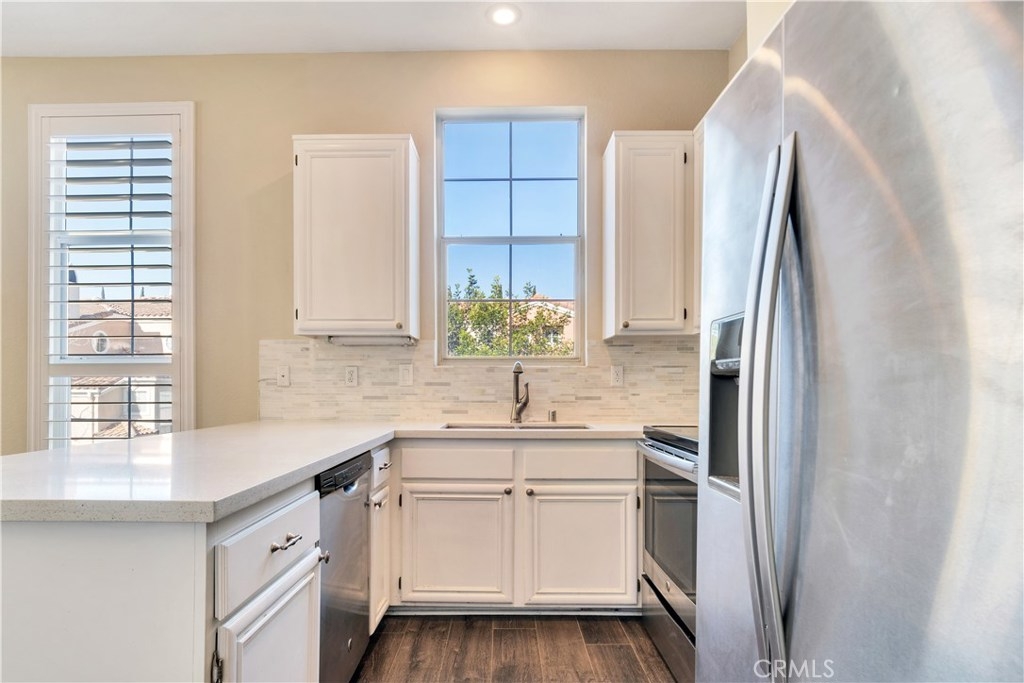 Located in the stunning gated community of Summit Renaissance, this end unit is located at the back of the complex and has views of the hills. Privacy and serenity surround this location and a fantastic patio to sit and relax. This 3 bedroom, 2.5 bath, unit boasts neutral interior paint, laminate flooring at entry and kitchen and throughout the downstairs area. Stainless Steal kitchen appliances, quartz counter tops and white cabinets. The kitchen offers a breakfast counter that overlooks the family room. Living room flows into the dining area, with lots of windows for a very bright and open floor plan. Neutral colors throughout. Dual sided fireplace between the living and family rooms with stone surrounding both sides. High volume ceilings. Master bedroom with views of the hill and trees. 2 car garage with direct access into the home.!!