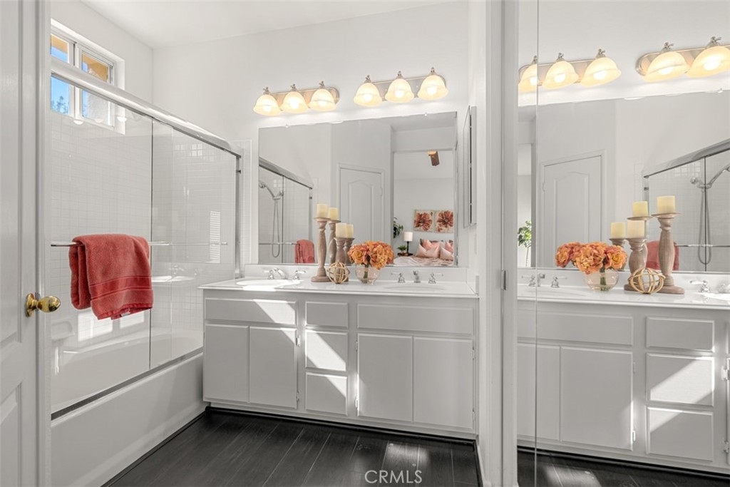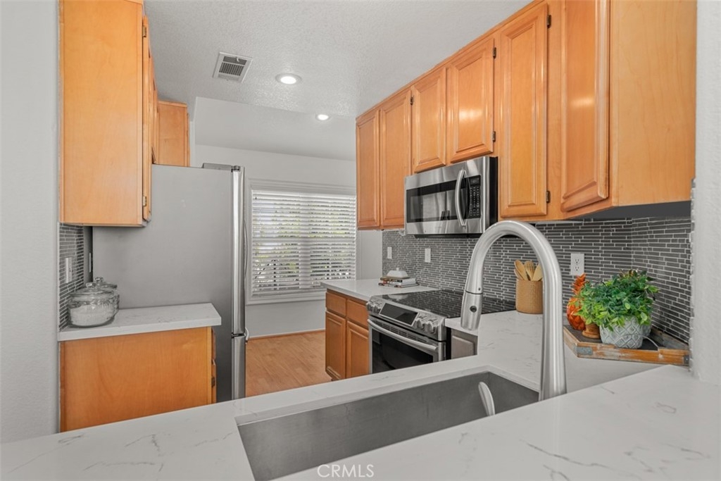 Nestled in the Venetian-inspired community of Summit Renaissance, this tri-level design home has plenty to offer. Upon entry, the open concept floor plan boasts high ceilings, laminated hardwood flooring and fresh interior paint throughout. The living room features a cozy fireplace with custom entertainment built ins. Updated kitchen consists of quartz counter tops with glass-tiled backsplash, recessed sink, updated stainless steel appliances and plenty of functional cabinet space. This unique and versatile floorplan offers a bedroom with connecting bathroom on the main level, along with 2 additional bedrooms upstairs, also featuring their own connecting private baths. Master bedroom features high ceilings, laminated hardwood flooring and custom ceiling fan. Master bathroom offers a dual sinks vanity w/ mirrored closet doors to access the walk in closet. The spacious 2 car garage features the laundry area and plenty of space for storage cabinets. This property is ideally located at the back of the community and offers a larger private patio area facing the serene and quiet hillside (The perfect place for that morning coffee or weekend BBQ!). Community amenities includes a nicely landscaped pool and spa area, along with a community gym. Summit Renaissance is perfect for those of an active lifestyle, offering plenty of walking and biking trails close by. Other great nearby activities include Oak Canyon Nature Center, AH Golf Course and the Walnut Canyon Reservoir. Also located within the highly sought after Orange Unified School District, this property is walking distance to nearby Canyon Rim Elementary. Minutes from top restaurants and retail stores like Target, Costco and Home Depot. Fwy access to the 91 and 241 freeways just down the street. This home is a Must See!