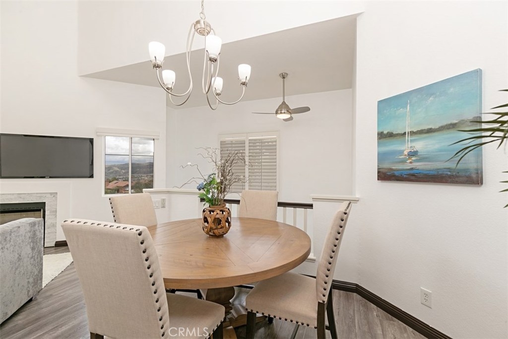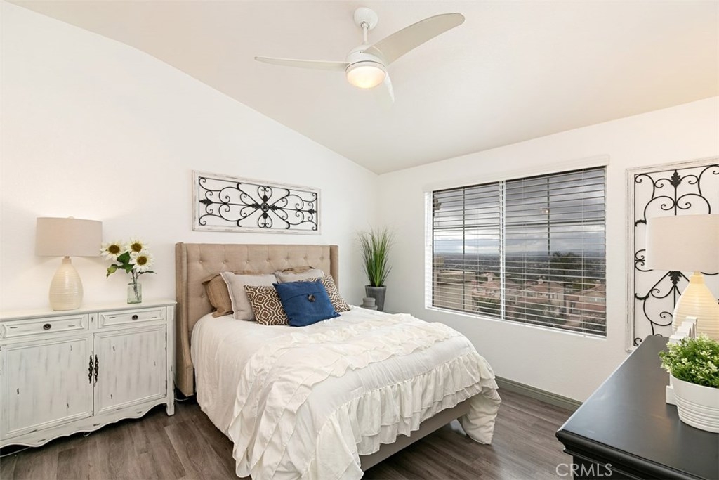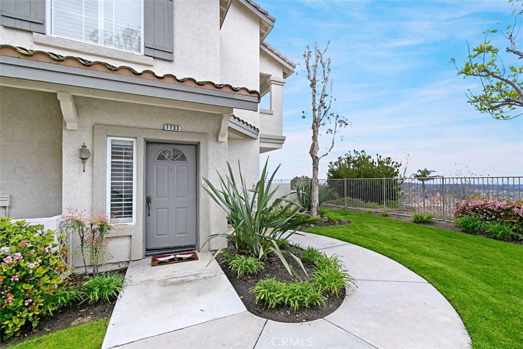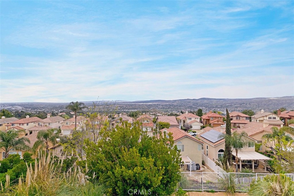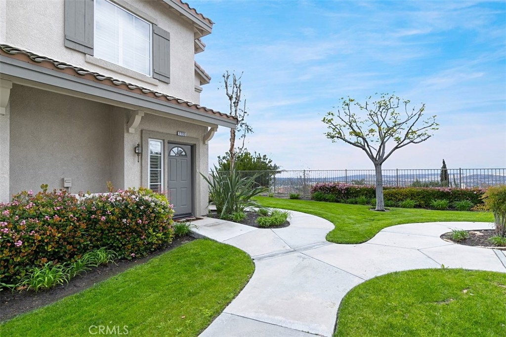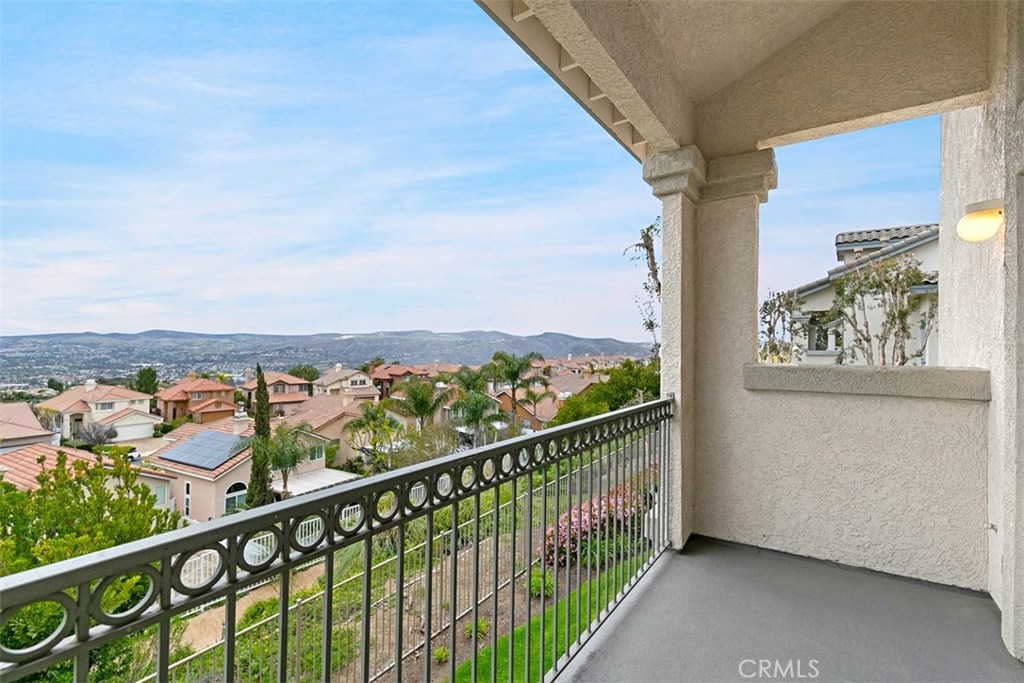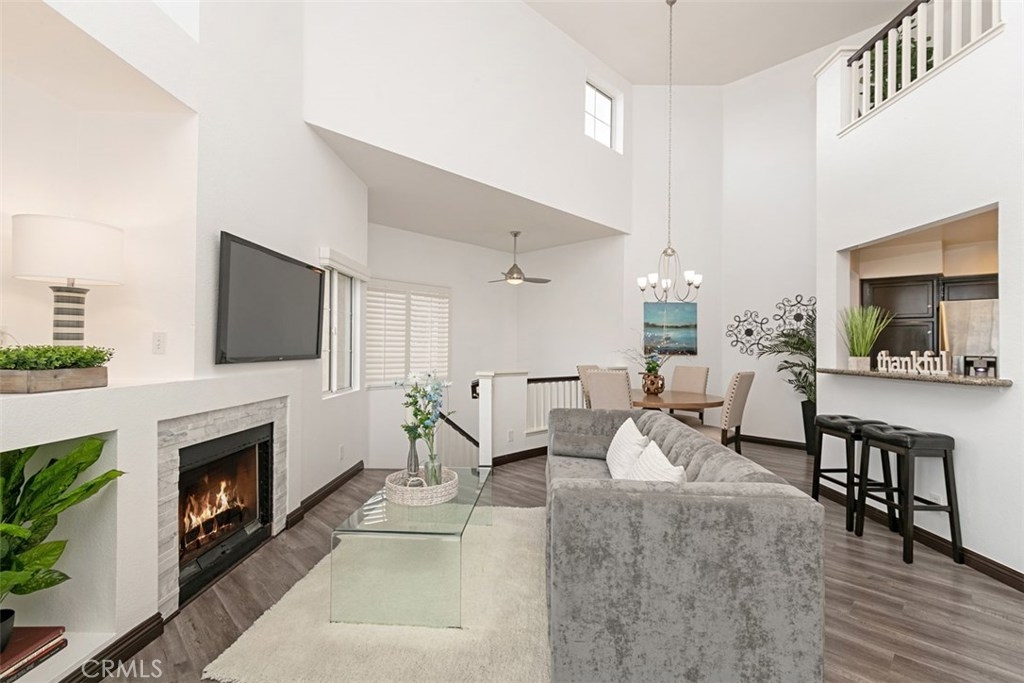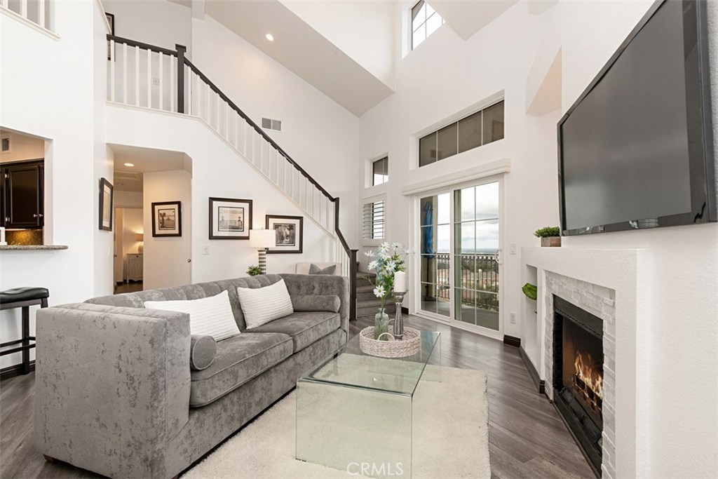 Welcome to this beautifully upgraded home with breathtaking city light and mountain views that can be enjoyed from almost every room! This turnkey 2 bedroom, 2 bathroom condo with 2-car attached garage also features a loft, perfect for a home office. As you enter, you will notice stunning laminate flooring and soaring ceilings, providing a bright and airy space. The living room, with a cozy marble stone surround fireplace, opens to the dining room and kitchen, perfect for entertaining. Walk through the sliding doors and admire the million dollar view from your private balcony. The kitchen features stainless steel appliances, granite countertops and dark cabinetry. As you walk down the hall you will find a spacious secondary bedroom, a full bathroom with granite countertops and dark cabinetry, and a laundry room with overhead cabinets. The master bedroom features a walk-in closet with built-in organizers, an attached full bathroom with dual sink vanity and quartz countertops. Additional features include newer carpet on stairs and custom paint. Located in the charming community of Viewpointe North in Anaheim Hills, this home is in close proximity to award-winning schools, shopping, freeways and toll roads. This gorgeous home is a must see!
