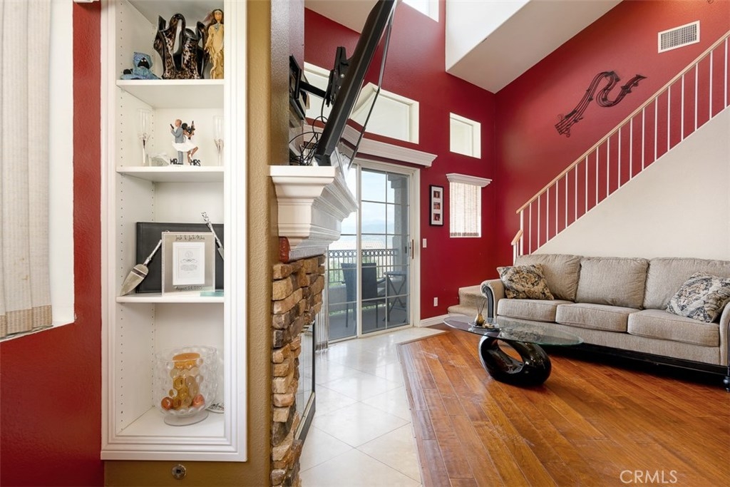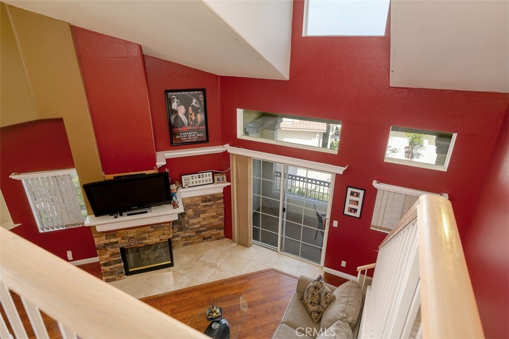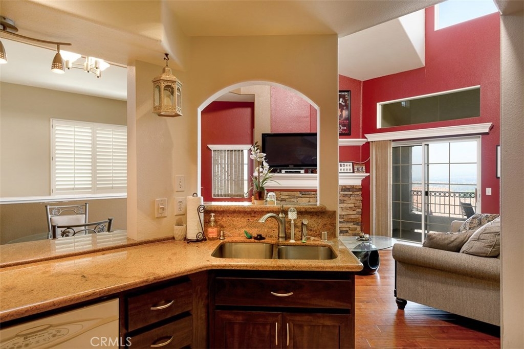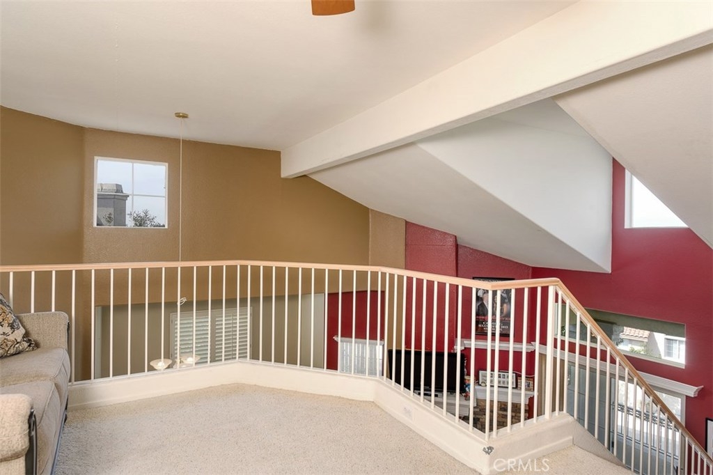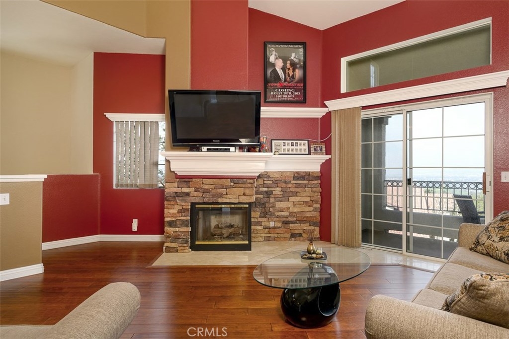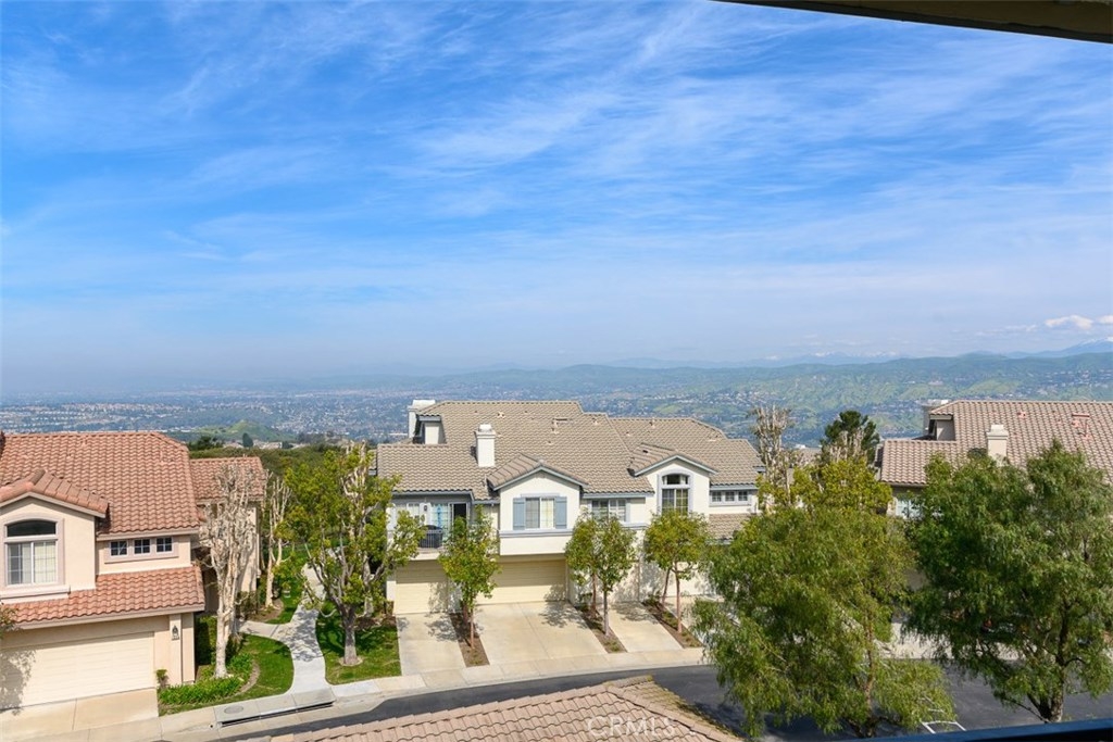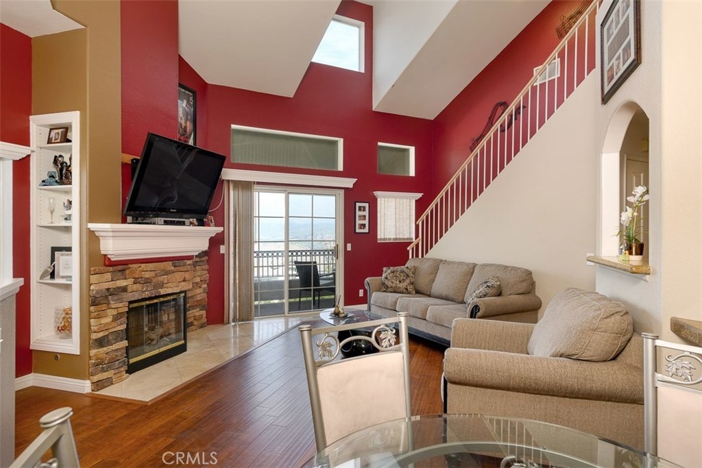 Enjoy spectacular city lights and sunset views from this upgraded two bedroom plus loft, two bath home in Viewpointe North. The upgraded kitchen with a built in breakfast bar has granite counters, travertine flooring, Stainless Steel appliances and is open to the Family room with a Stone Fireplace. The Dining room is adjacent to the kitchen with a built-in granite topped buffet which provides additional storage and has space for a wine refrigerator. Cathedral ceilings and abundant windows make this living area very light and bright. Sliding glass door in the family room open to the Large VIEW balcony. There is an oversize loft above the family room with ceiling fan, built ins and storage, that can be used as an office, game room, additional bedroom, or gym. The master bedroom with ceiling fan has a slider that opens to another VIEW balcony and the master bath has granite counters and dual sinks. There is an inside laundry closet that can accommodate full size washer & dryer. The home has wood flooring in the living areas and plantation shutters. There is a 2-car attached garage with direct access to the home, that has epoxy coated floors and built-in storage cabinets. Full size driveway accommodates 2 extra cars for a total of 4 personal parking spaces.This a gated community with pools, spas, and clubhouse. The community has lots of greenbelts , trees and plenty of guest parking across the street.