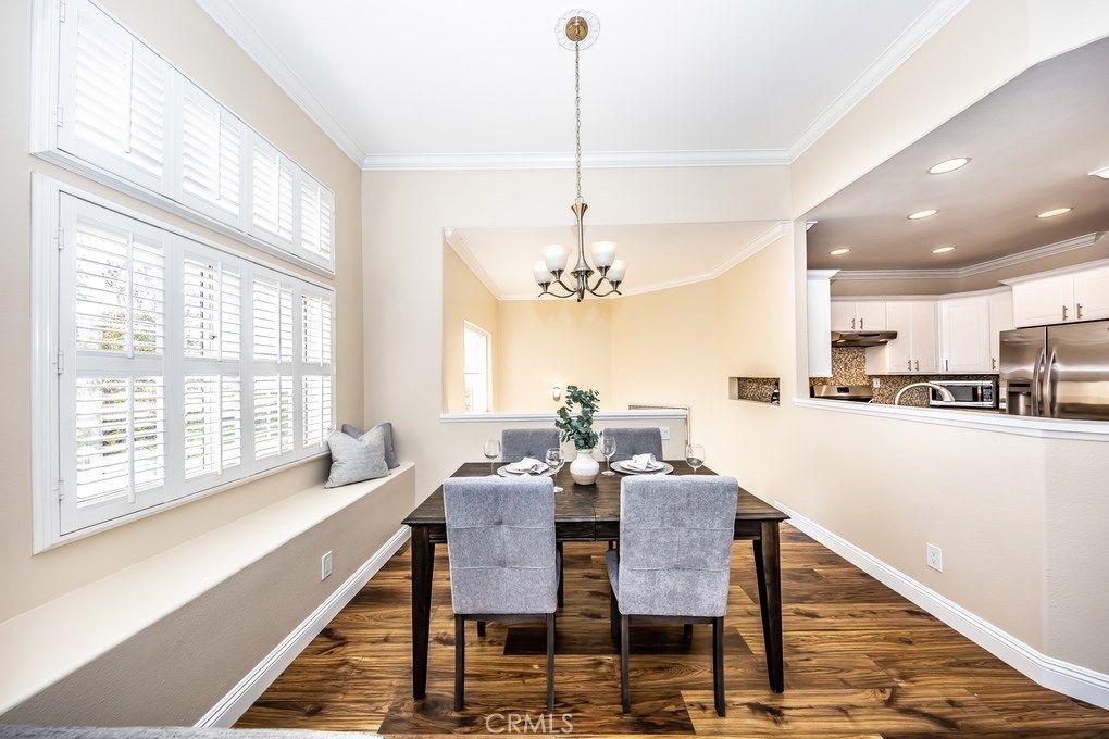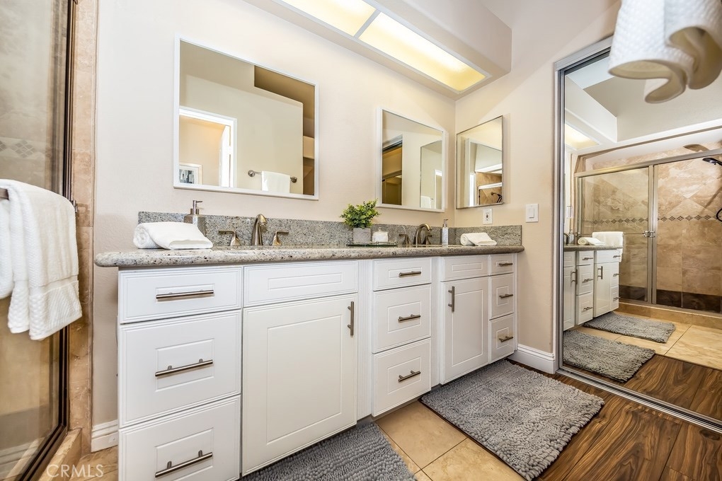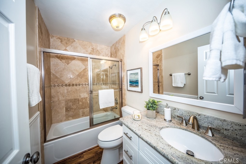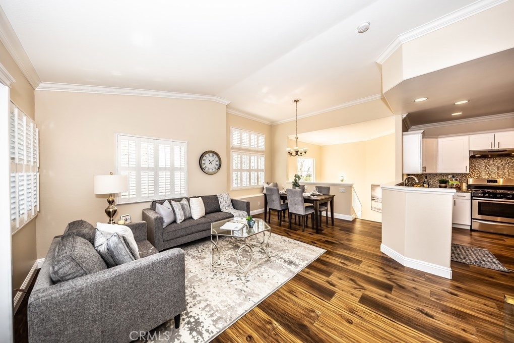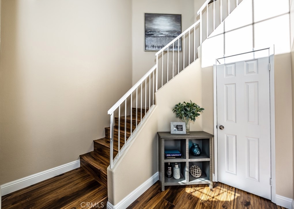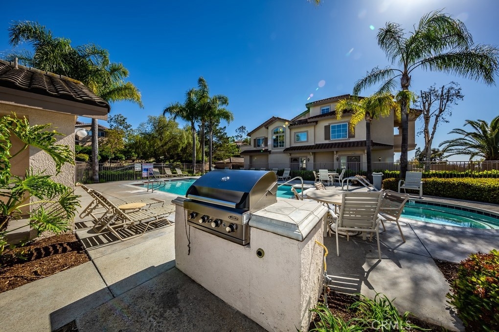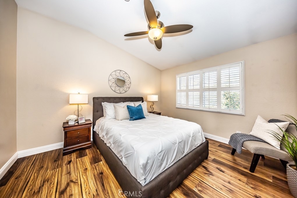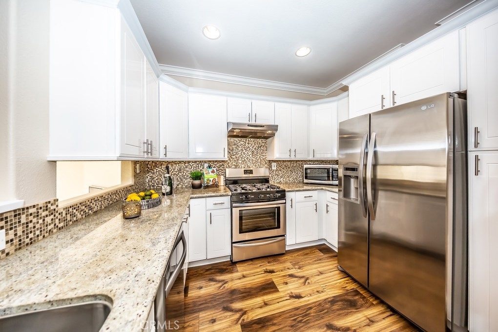 Viewpointe North just got a little sweeter! This end-unit 2 bedroom, 2 bath townhouse has been beautifully upgraded w/no one above or below you! New paint, wood floors & a stacked stone gas fireplace welcome you. Enjoy the view from your built-in window seat! Light & bright white kitchen cabinets w/grey granite counter tops & custom backsplash, along w/soft-closing drawers makes 4 easy meal prepping. Don't forget all the stainless steel appliances (refrigerator, dishwasher, microwave & brand new gas range) are included! Stylish wainscoting & recessed lighting are throughout as well. Double door entry to the master bedroom invites you to mirrored wardrobe doors & new upscale ceiling fan fixture. The master bathroom offers a vaulted ceiling, upgraded natural travertine shower & granite countertops w/double sink vanity. The built-in Murphy Bed cabinetry surrounds the second bedroom wall...all it's waiting for is your bed! The electric washer & dryer are included & wooden shutters close for reducing noise. There's an attached 1-car garage w/direct home entry w/auto door opener, as well as a long driveway & carport, providing space for 3 cars! Viewpointe North is a gated community w/2 pools, 5 spas, clubhouse, BBQ areas & greenbelts throughout. HOA also includes cable service. Great location near dining, shopping, entertainment & easy access to 91, 55, 241 & 57 FWYS make this the ideal, turnkey Anaheim Hills home. Are you ready to move in? It's just waiting 4 you to call it yours