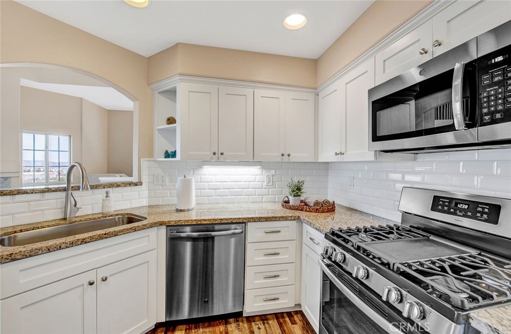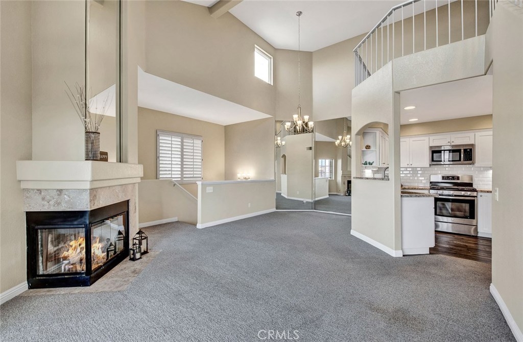 Spectacular panoramic views from all rooms in this beautifully remodeled upper end unit. Located on the sought after Viewrim Drive in the gated community of Viewpointe North. Desirable floor plan offers two bedrooms, two bathrooms, and a large open loft. Soaring cathedral ceilings and many windows add to the bright atmosphere of home. Remodeled kitchen with newer soft close shaker style cabinets, granite countertops, recessed lighting, extra deep stainless steal sink, and stainless steel appliances. Kitchen opens to living room which includes fireplace, private balcony, and access to the loft above. Spacious loft is perfect for additional entertaining or a home office. Dining room offers mirrored walls, custom chandelier, and is open to living room. Down the hall is the master bedroom with double door entry, vaulted ceilings, and private balcony. Master bathroom is remodeled with soft close shaker style cabinets, granite countertops, and recessed lighting. Guest bedroom with mirrored closet door and vaulted ceiling. Guest bathroom is remodeled with soft close shaker style cabinets and granite countertops. Laundry closet is conveniently located upstairs and is suitable for full sized washer and dryer. Two car attached garage with direct access to home. Viewpointe North is located near the top of Anaheim Hills and includes two gated entrances, two pools, five spas, and a clubhouse.