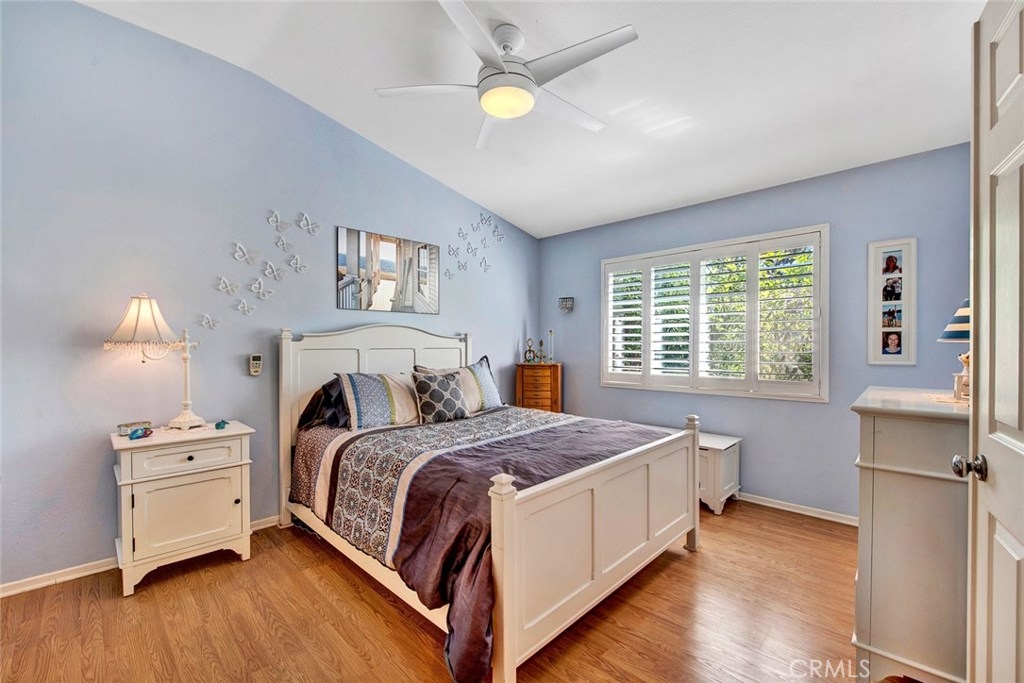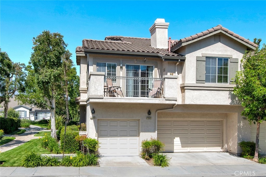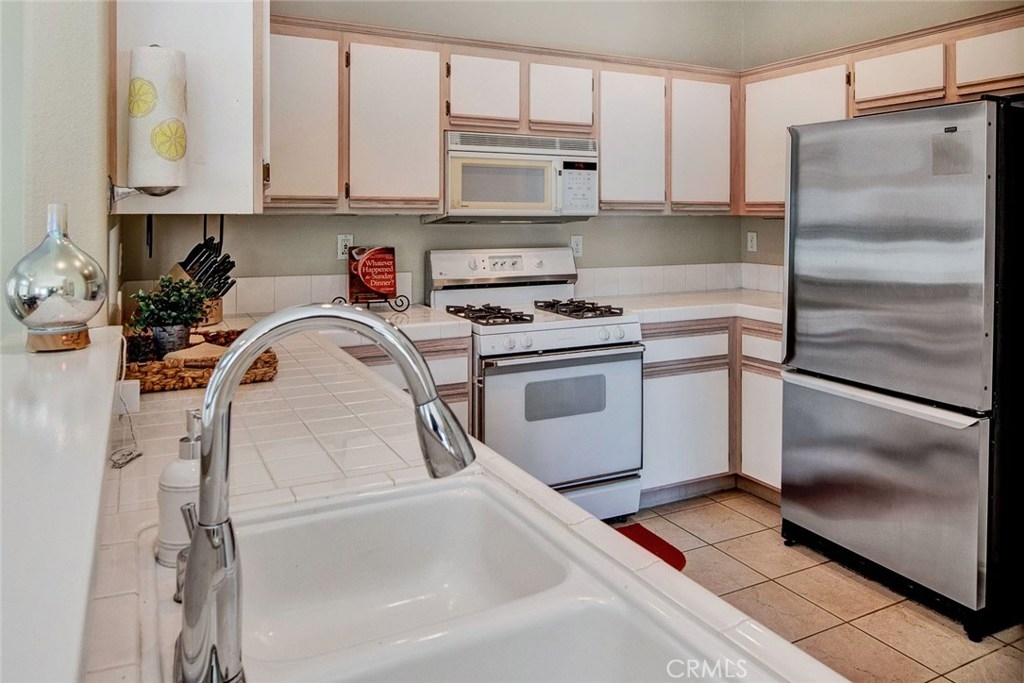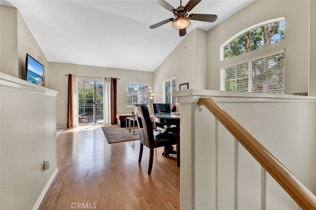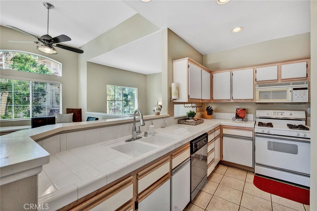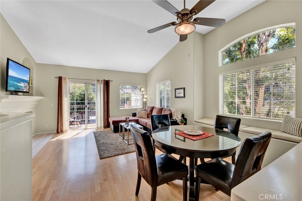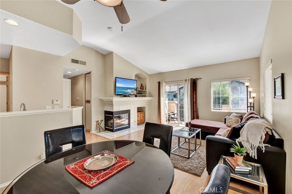 Desirable upper end unit with two bedrooms and two bathrooms located in the gated community of Viewpointe North. Popular floor plan with no one living above or below you. One car attached garage with direct access to home and one car covered carport nearby, Vaulted ceilings and many windows create a light and bright atmosphere in home. Spacious kitchen with white cabinets, pantry, recessed lighting, and is open to living and dining rooms. Dining room includes ceiling fan and window seat which is perfect to sit on and enjoy the views. Open living room includes laminate wood flooring, with fireplace and private balcony. Double door entry into master bedroom with laminate wood flooring and ceiling fan. Dual sink vanity in master bathroom with large shower and two closets with mirrored doors. Sizable guest bedroom and full guest bathroom. Convenient laundry closet is located upstairs and suitable for full size washer and dryer. Viewpointe North includes two pools, five spas, club house, and is a gated community walking distance to parks and award winning elementary school.