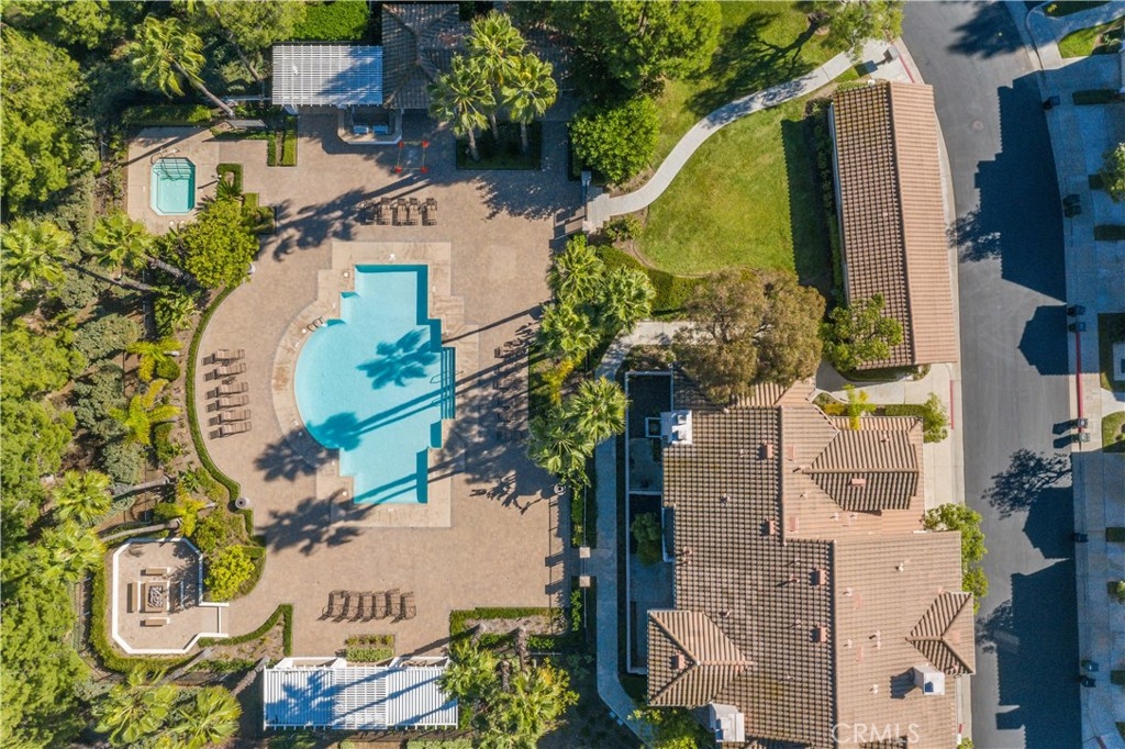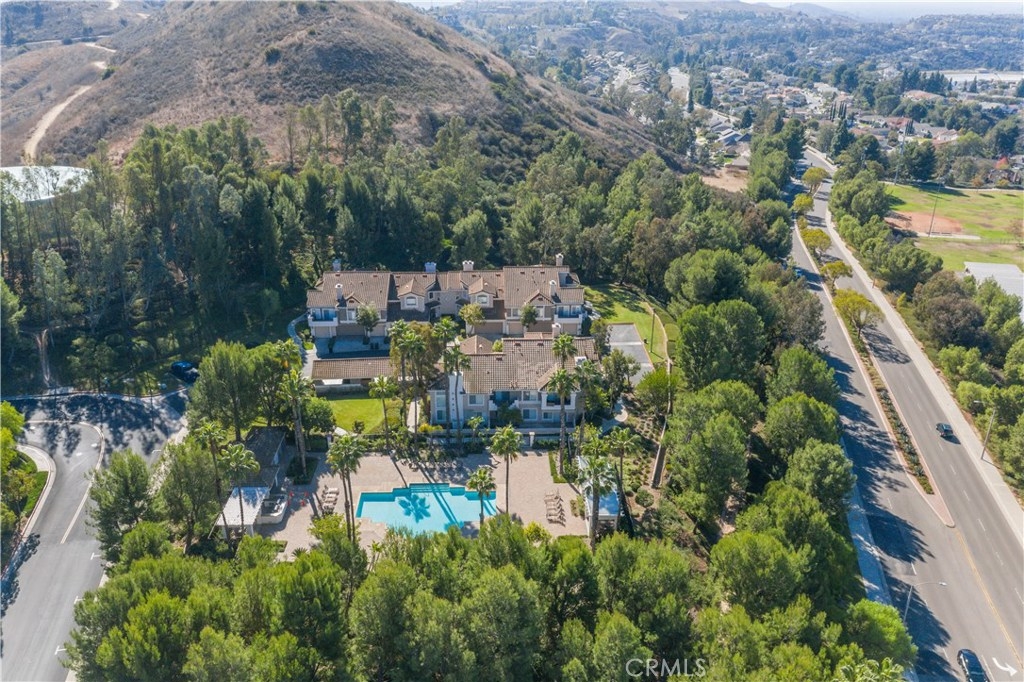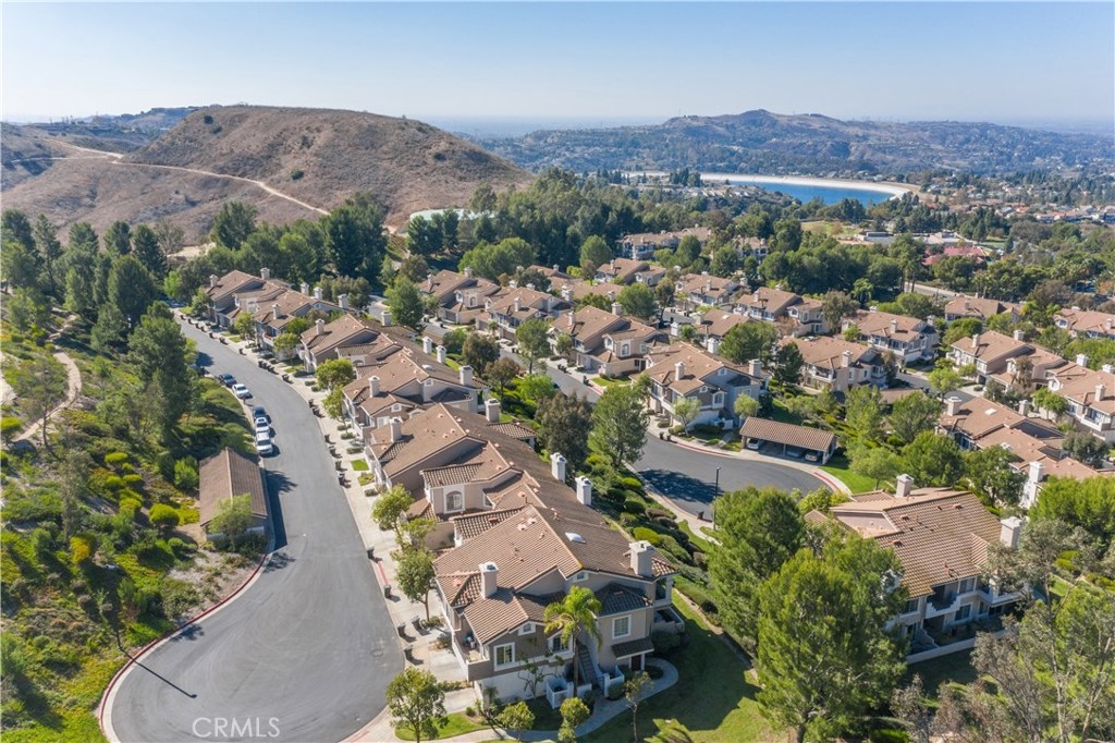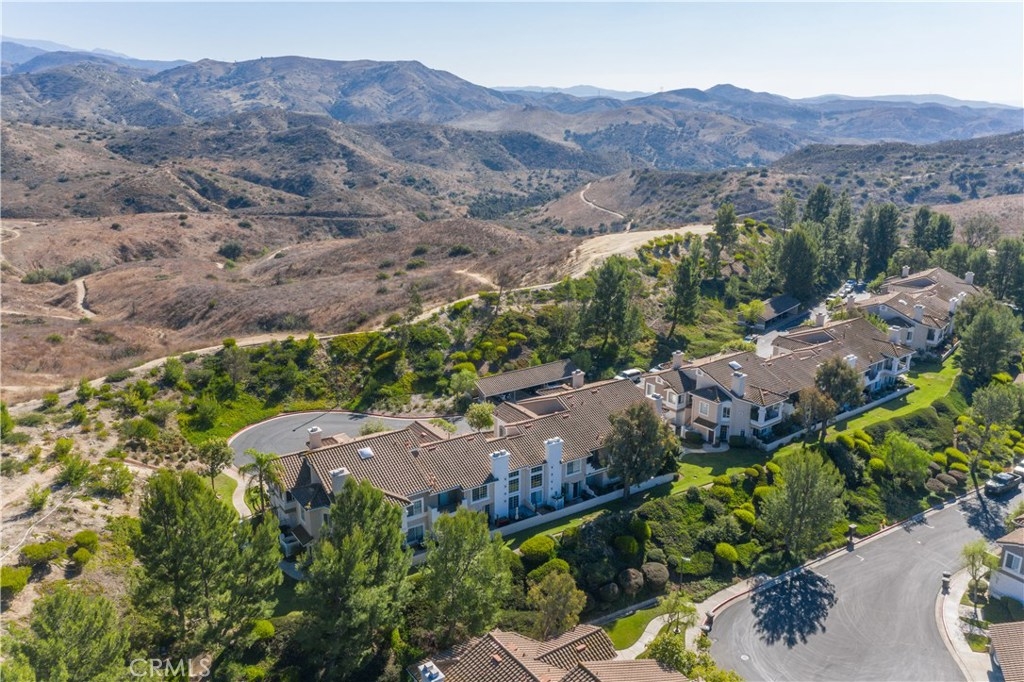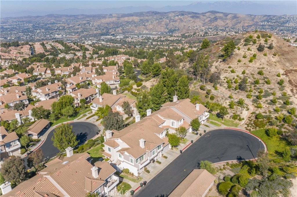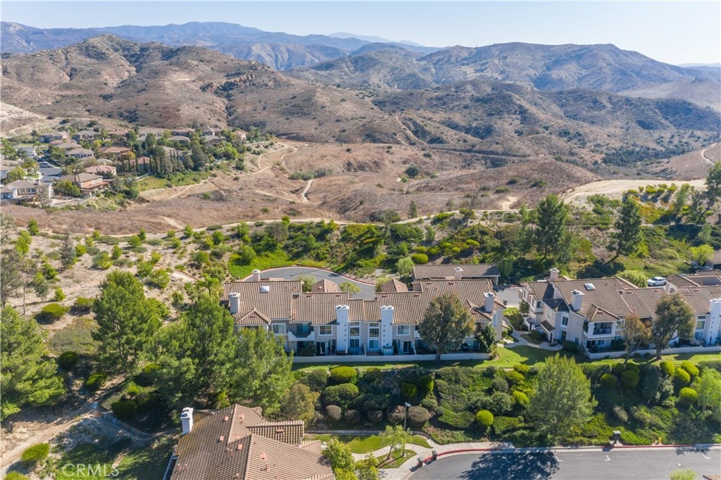 Amazing view of valley, mountains, and North Orange County city lights without ever leaving this lovely 2 bedroom 2 bath condo located on the highest street in desirable Anaheim Hills Viewpointe gated community. Kitchen remodeled in 2019 has quartz counter tops, birch cabinetry with self-closing doors/drawers and lazy susan corner unit, Laminated wood floor, inset lighting, gas stove, microwave, stainless dual sink and pass-thru opening to dining area. Cozy living area has corner gas fireplace and view-facing sliding glass door to covered patio. Spacious master has view-facing sliding glass door to the patio, mirrored wardrobe, huge walk-in shower, Dbl sink vanity, and built-in med cabinet. Guest bedroom/office has ceiling fan and view-facing window. Inside laundry closet with both gas and electric dryer hook-ups. 2 large storage closets. Plantation shutters. Laminated wood entry and hallway. Carpeted living and bedrooms. Beautiful custom inset tile flooring in bathrooms. Covered patio runs the length of the unit facing the spectacular view & has private gas BBQ. Workbench & cabinets attached garage for hobbyists and tinkerers. Both a single car garage and an additional assigned carport space comes with the unit. Gorgeous security gated community use area has pool, spa, covered outdoor kitchen/grilling & eating area, and fire pit. Irvine property located directly behind with miles of hiking and biking trails for the outdoor enthusiast.