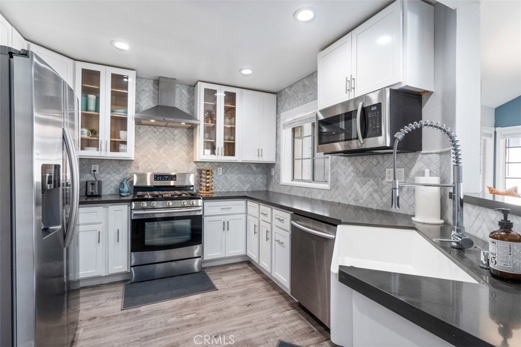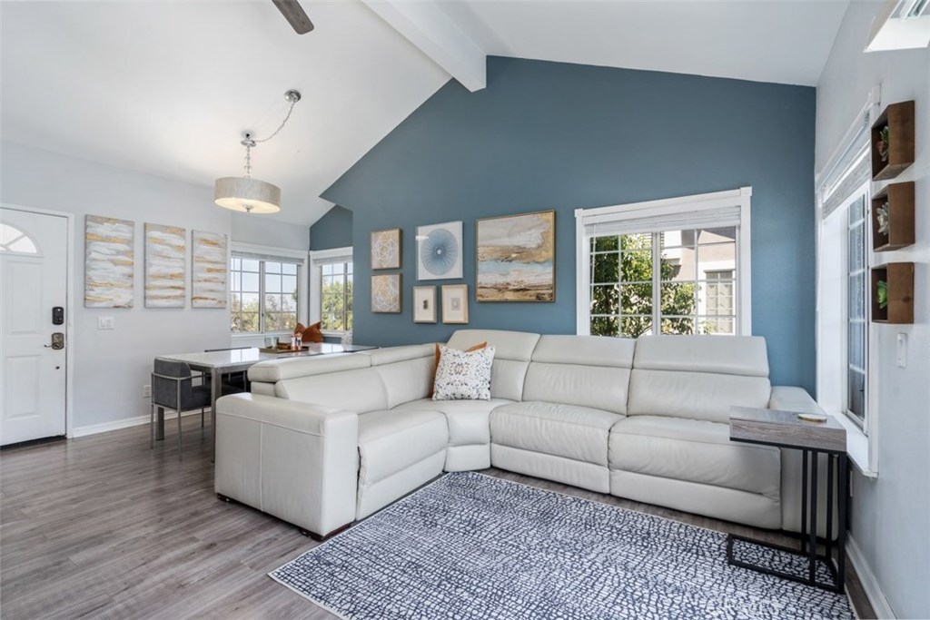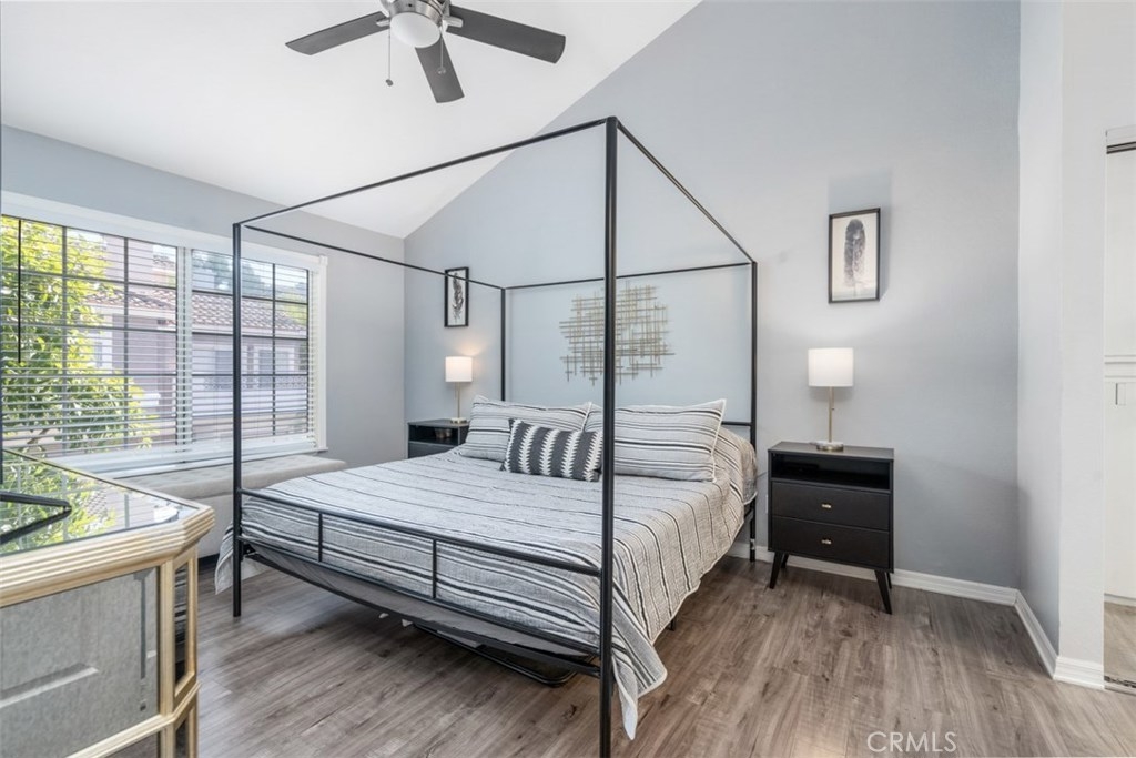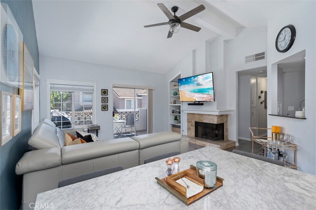 Nestled on a hilltop within the private community of Viewpointe, this upgraded home is an absolute Must See! Upon entry, this floorplan boasts high vaulted ceilings, large open windows, and a true light and bright environment. The open living and dining area feature hardwood flooring, new custom ceiling fan and an updated stone fireplace. Highly upgraded gourmet kitchen offers plenty of quartz counter tops with larger cabinets, stainless steel appliances (which includes a custom stainless hood over the range), along with a chef-style drop down sink & faucet.Master bath features large vanity w/ his & her sinks,updated tile backsplash, a large mirrored closet, a brand new shower enclosure and a state-of-the-art light fixture, w/ built-in Bluetooth speaker! Other great features include Keyless front door entry, private balcony off the living room, attached garage directly underneath unit (nobody above or below you), separate carport parking and a peak-a-boo hill view off the dining area! Community amenities include a remodeled pool and spa area, firepit, BBQs,covered eating areas & security patrol. Viewpointe is perfect for those looking for an active lifestyle with its local parks and trails for biking, running and walking (Take advantage of nearby Walnut Canyon Reservoir for an evening stroll!). Also, Highly rated OCSD!