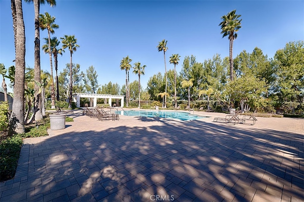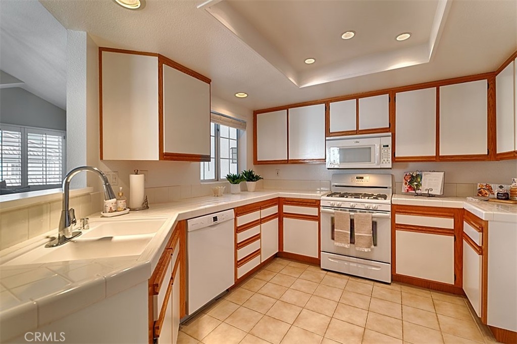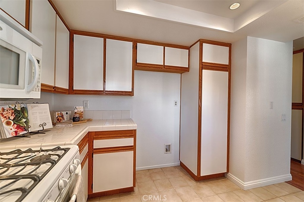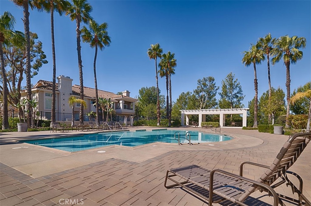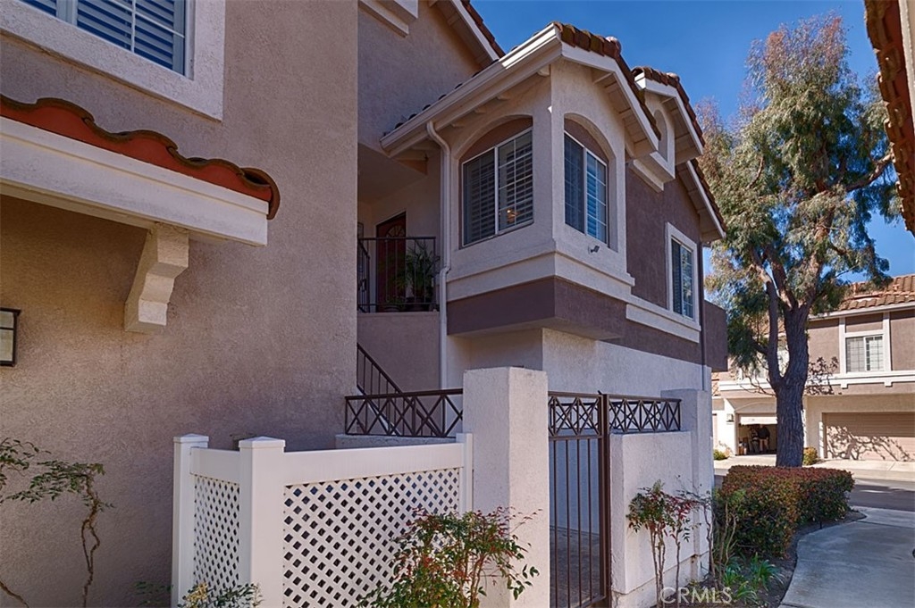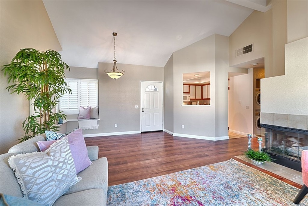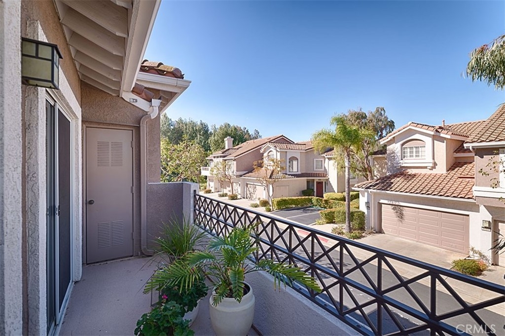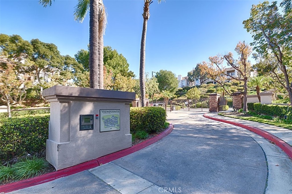Viewpointe Gated Community. This is a turnkey property with 2 bedrooms, 2 bathrooms, 1 car garage along with an assigned covered parking space right out the front door. No neighbor above or below. Built over garages, all living space is on 'one level'. Nice balcony off the living room, with neighborhood views. Enter to living room with fireplace, dining area and open to the kitchen. Shutters in the living areas, and new blinds in the bedrooms and kitchen. Cathedral ceiling in living and dining rooms. Master bed/bathroom with large closet, double sink vanity, linen cabinets, and walk in shower. Unit has new PEX plumbing. Laundry area is in the hallway of the unit with washer/dryer included. Fresh paint, new bathroom appointments, along with newly painted garage interior. Private end unit. Walk to gorgeous pool, spa, and awarded Canyon Rim Elementary School. Orange Unified School District. Parks and ball fields are nearby. Hiking trails and nearby reservoir for jogging are all dog friendly. Built in the hills, yet on a flat street.