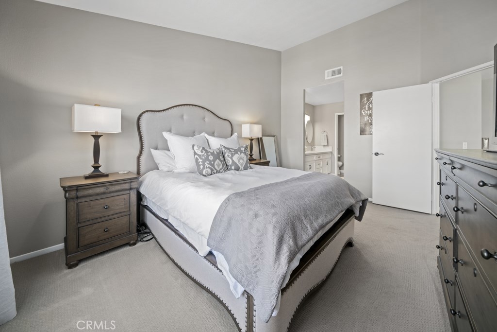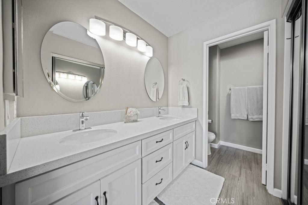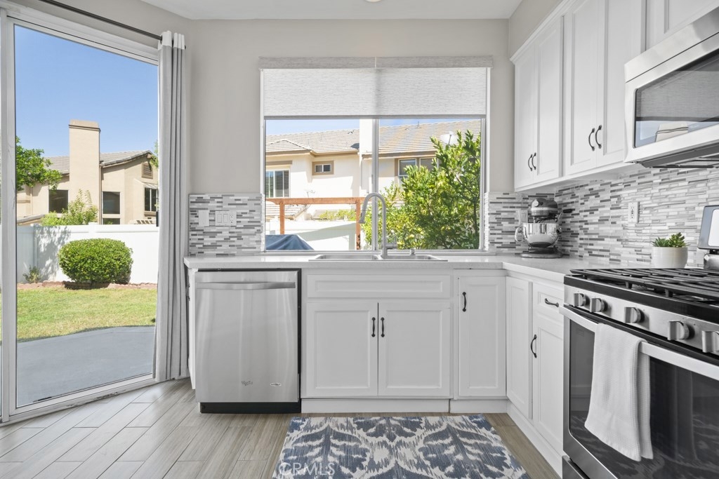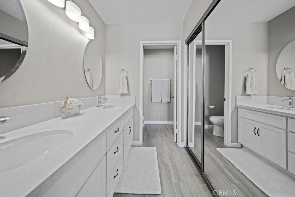 Absolutely Stunning 3 bedroom, 3 bathroom, 1,248 sq. ft. townhome located in the coveted Summit Court community. End-unit, no one above or below, has been remodeled and has a thoughtful layout with so many windows and light! The property has an attached two-car garage. On the main level, clean and light paint colors, neutral gray "wood look" tile floors and large dining room with updated light fixture, first floor laundry area, updated kitchen with quartz countertops, tile backsplash, stainless dishwasher, gas stove & microwave, white cabinets and drawers with soff-close feature!! Also on the main floor is a bedroom with double-door entry, a full bathroom with walk-in shower that has been updated with gorgeous carrera marble tile, white vanity and quartz countertop. The entry flows into the main living area/family room with many windows, custom plantation shutters, vaulted ceilings and gas fireplace. Recently updated with a Nest thermostat. The second floor consists of two master bedrooms, each with its own en-suite bathroom with updated white vanities and quartz countertops, and one with dual sinks and walk-in-closet. In addition to all this living space, this townhome has a private fenced backyard! The association features include, community pool/spa with BBQ area, club house, fitness room, and children's tot-lot. The community features include, local walking and mountain biking trails and fast access to 91, 241 and 55 freeways. This luxurious home is a must see!!!