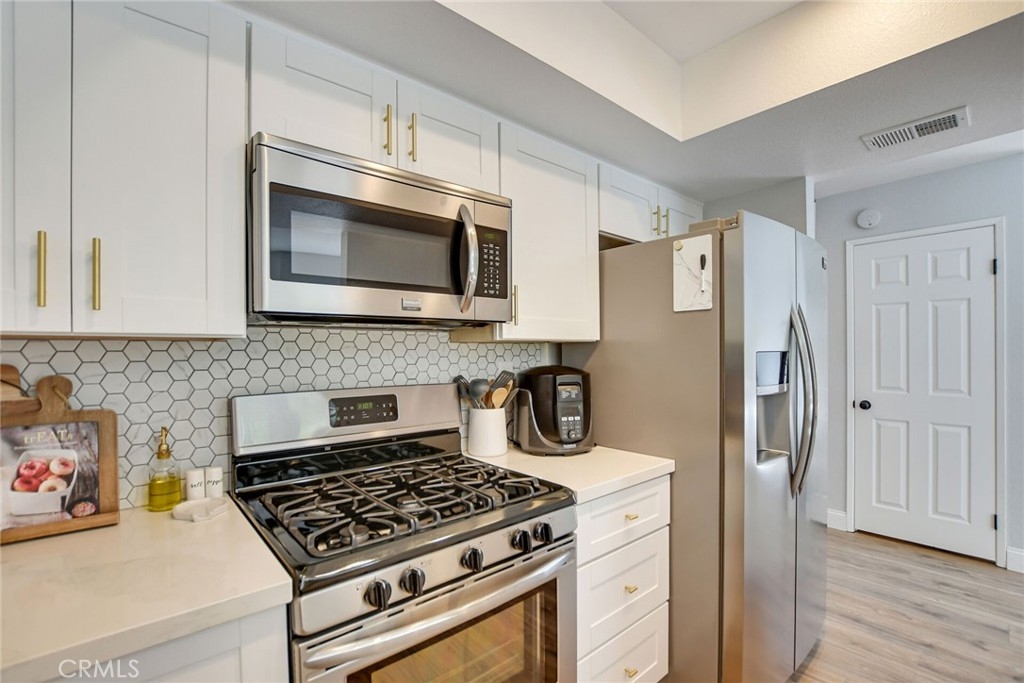 BEAUTIFUL, BEAUTIFUL, BEAUTIFUL! This home has TWO large primary bedroom suites AND an office/den! The home was completely REMODELED a few years ago! Sellers spared no expense! NEW kitchen, NEW bathrooms, NEW flooring, NEW light fixtures....the list goes on! The kitchen is light and bright with new white shaker cabinets and quartz countertops. The flooring throughout the home is a lighter oak waterproof luxury laminate. All three bathrooms have designer tile as their flooring. Each bathroom has new vanities and quartz countertops. Upgraded canned lighting throughout the home as well as new light fixtures in all bathrooms. New chandelier in the front entry way as well! Both bedrooms have walk-in closets and ceiling fans. Make sure to check out the upgraded coat closet, it was made into a fantastic pantry! The large TWO car garage with direct access has a 220 amp outlet compatible for EV charging. Private patio off the dining room, for nice quiet nights of relaxing! The family room has high vaulted ceilings. Close to the main freeways for easy commuting, yet it is in a gated community so you have your privacy.
