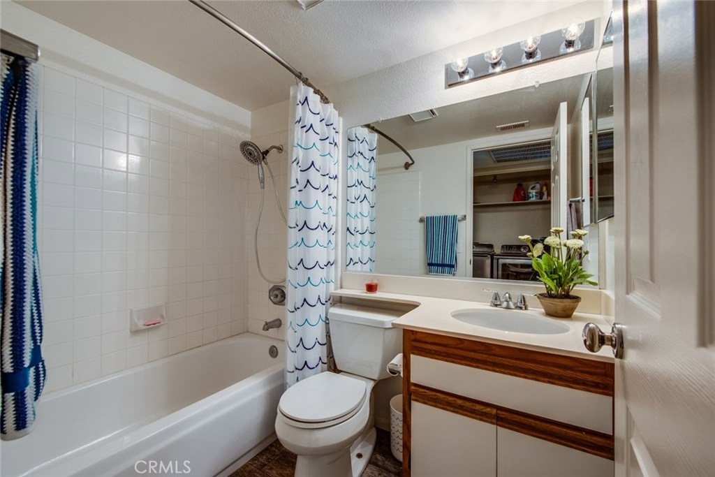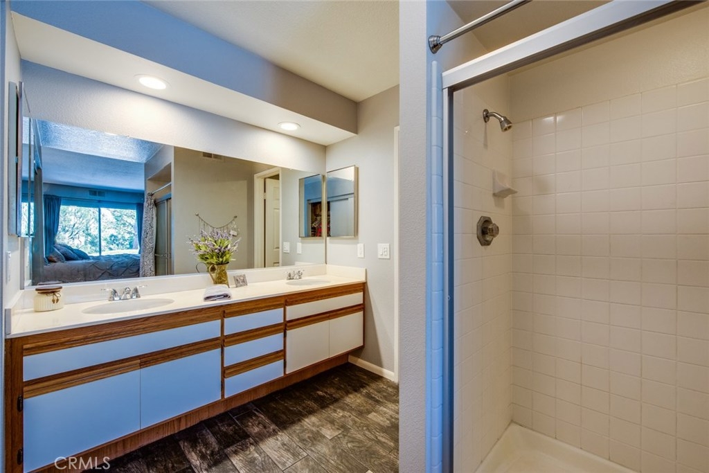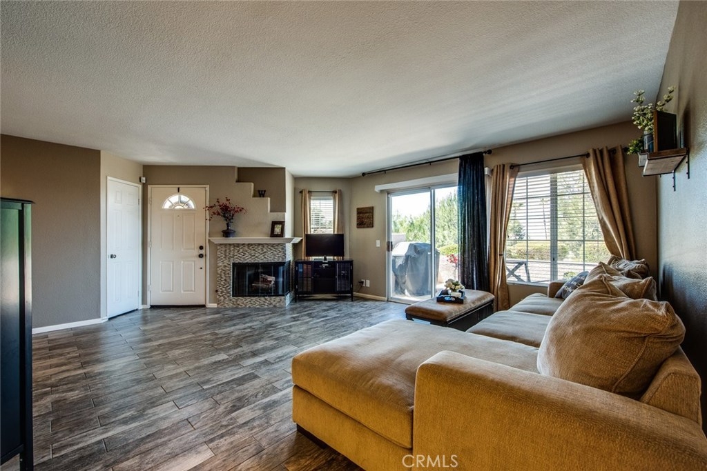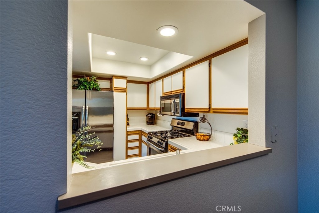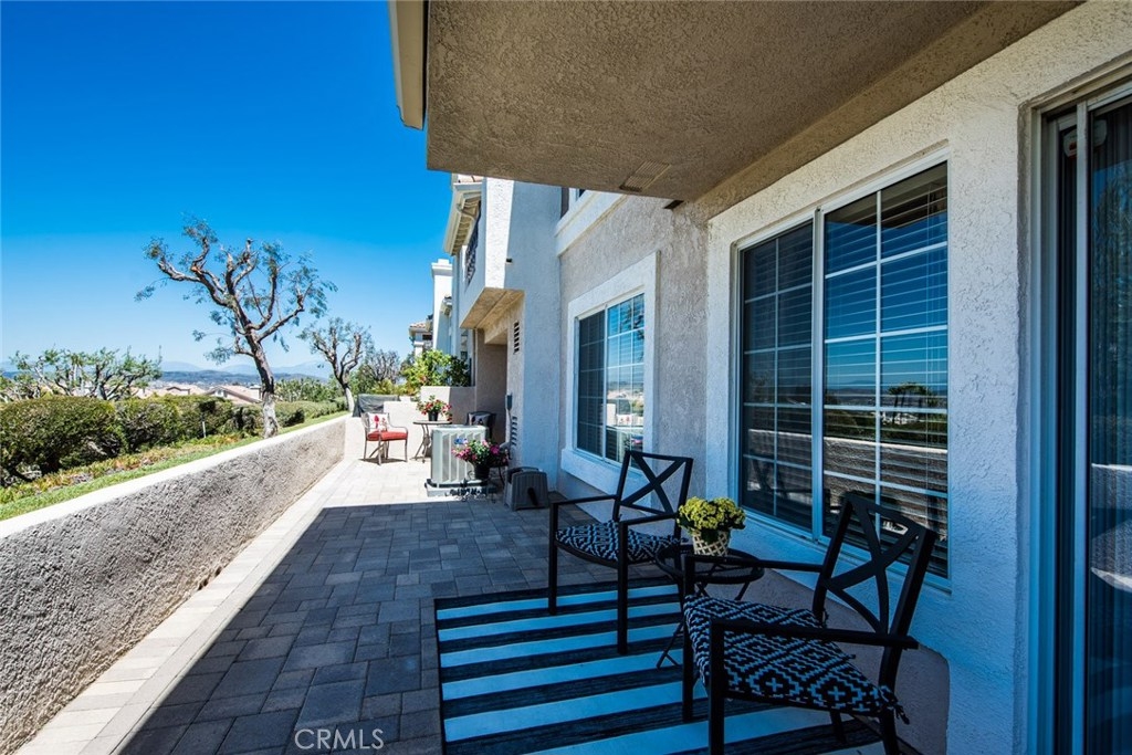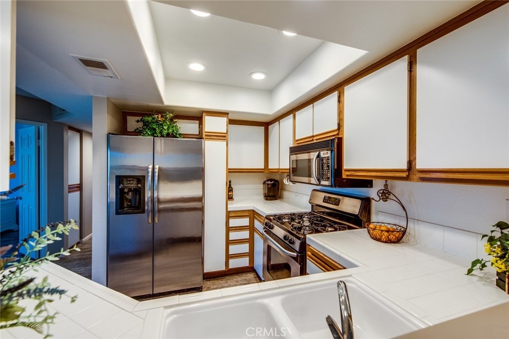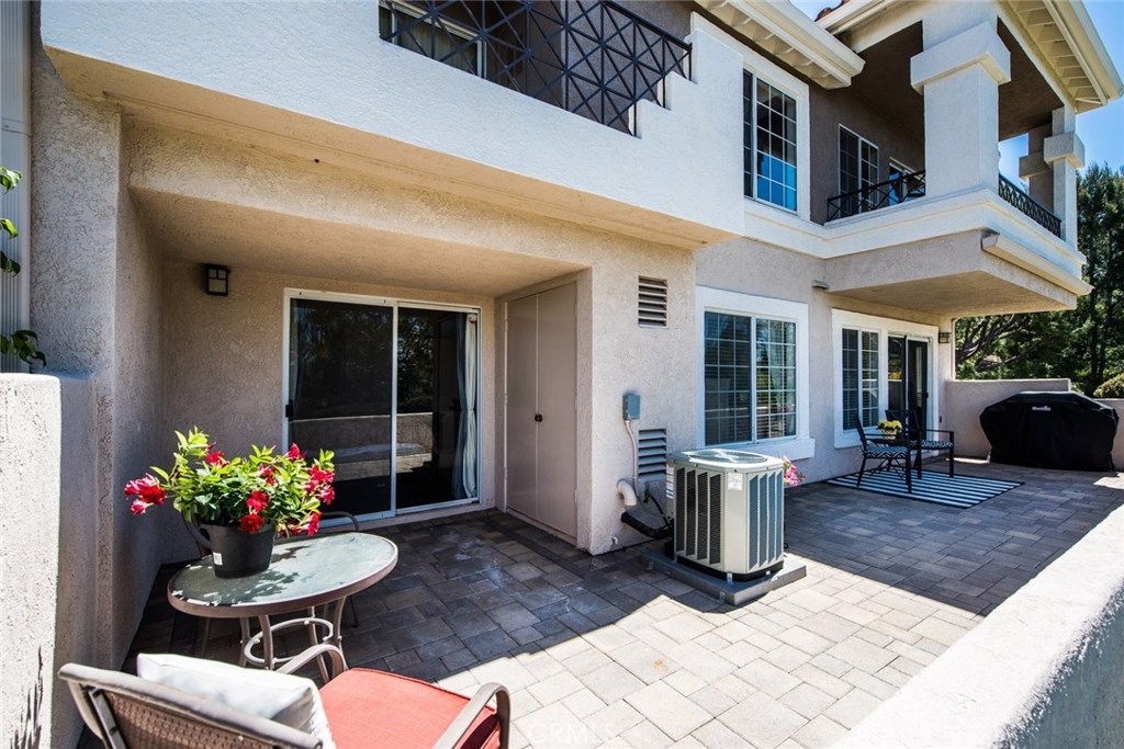 The VIEW of lights, hills, mountains, trees and greenbelt is just one of the many features of this ground level condo located in the gated “Viewpointe” Community. This turnkey home has an open floorplan and features new tile/wood-look flooring throughout, recessed lighting, fireplace with mantel in Living Room plus lots of closet space. The kitchen with stainless steel dishwasher, gas range and microwave opens to the living room and separate eating area. The master bedroom has a view and a sliding door leading to the patio. There are also double sinks and a large stall shower in the Master dressing area. The view is also visible from the second bedroom. The hall bath has a shower over the bathtub. There is a laundry area in the hallway with gas & electric hookups. The large patio that runs the full length of the home, with access from the living room and the master bedroom, has been upgraded with gorgeous stone pavers. The VIEW from the Patio, living room and both bedrooms is great – the sunsets are awesome! The attached one car garage has direct access into the home and also has a 4’ x 8’ Overhead Storage which will hold up to 600 lbs. There is an also a reserved covered parking space for this home. All this plus newer toilets; Also, the Air Conditioning Unit and the Furnace are approximately two years old!