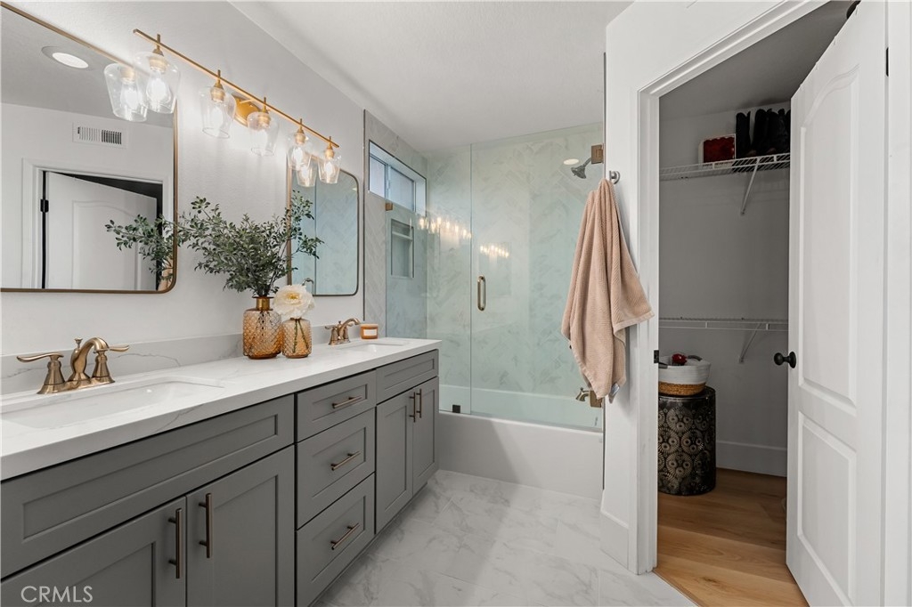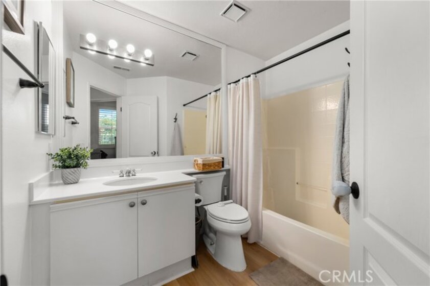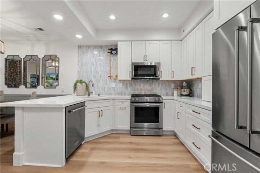 Welcome to 1370 S. Country Glen Way, a beautifully upgraded two-story townhome located in the desirable Summit Court community of Anaheim Hills. This 3-bedroom, 3-bath residence offers 1,216 square feet of thoughtfully designed living space with no neighbors above or below and a private backyard patio. The fully remodeled kitchen features white cabinetry with soft-closing doors and drawers, quartz countertops, tile backsplash, recessed lighting, stainless steel KitchenAid appliances, a lazy Susan, and additional cabinetry for extra storage. The kitchen opens seamlessly to the dining area and family room, highlighted by luxury vinyl flooring and a stunning river rock fireplace. A sliding glass door leads to the backyard patio, perfect for outdoor dining and entertaining. A main-level bedroom with plantation shutters and a full bath provides flexibility for guests, a home office, or multi-generational living. Upstairs, the spacious primary suite boasts high ceilings, beautiful mountain views, a walk-in closet, and a completely remodeled ensuite bath with dual sinks, quartz countertops, soft-close cabinetry, updated lighting and mirrors, custom tile shower, and frameless glass shower doors. The secondary bedroom is generously sized and includes plantation shutters, with a nearby hall bath featuring a shower and single sink. Additional highlights include a single-car garage with storage racks and direct access, laundry located in the garage, upgraded windows and sliding glass door, new HVAC system, new water heater, new electrical outlets, automatic blinds on the slider, upgraded interior doors, new baseboards, and fresh interior paint throughout. This move-in-ready home combines modern upgrades with comfort and style in a highly sought-after location. Close to award winning schools, restaurants shopping and freeway access