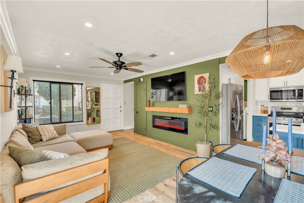 Experience the perfect fusion of style and comfort in this beautifully upgraded two-story home located in the highly sought-after Anaheim Hills community. With a modern aesthetic that feels like it’s straight from a magazine, this residence impresses from the moment you enter. Inside, the stylish design features a stunning wood wall that adds character to the living area, complemented by elegant wainscoting in the hallway for a touch of sophistication. The dining room is highlighted by a chic light fixture, making it ideal for intimate meals and lively gatherings. Enjoy the benefits of a brand new AC system and fresh flooring throughout, creating a clean and inviting atmosphere. The kitchen is a chef's dream, boasting luxurious quartz countertops and a new dishwasher that makes cooking a pleasure. A dedicated indoor laundry area adds to the home's convenience. The living room is enhanced with recessed lighting and a stylish electric fireplace, providing a warm and welcoming vibe. The primary suite features a recently installed custom closet that maximizes storage efficiency, ensuring every inch of space is utilized. Step outside to a genrerously-sized, low-maintenance backyard adorned with lush turf, perfect for entertaining or enjoying peaceful evenings under the stars. This home also includes a two-car garage that is attached through the backyard plus access to two community pools, perfect for relaxation and socializing. With its prime location near top-rated schools, scenic trails, and parks, this property is an ideal choice for families and outdoor enthusiasts alike. Seize the opportunity to claim this designer home as your own!