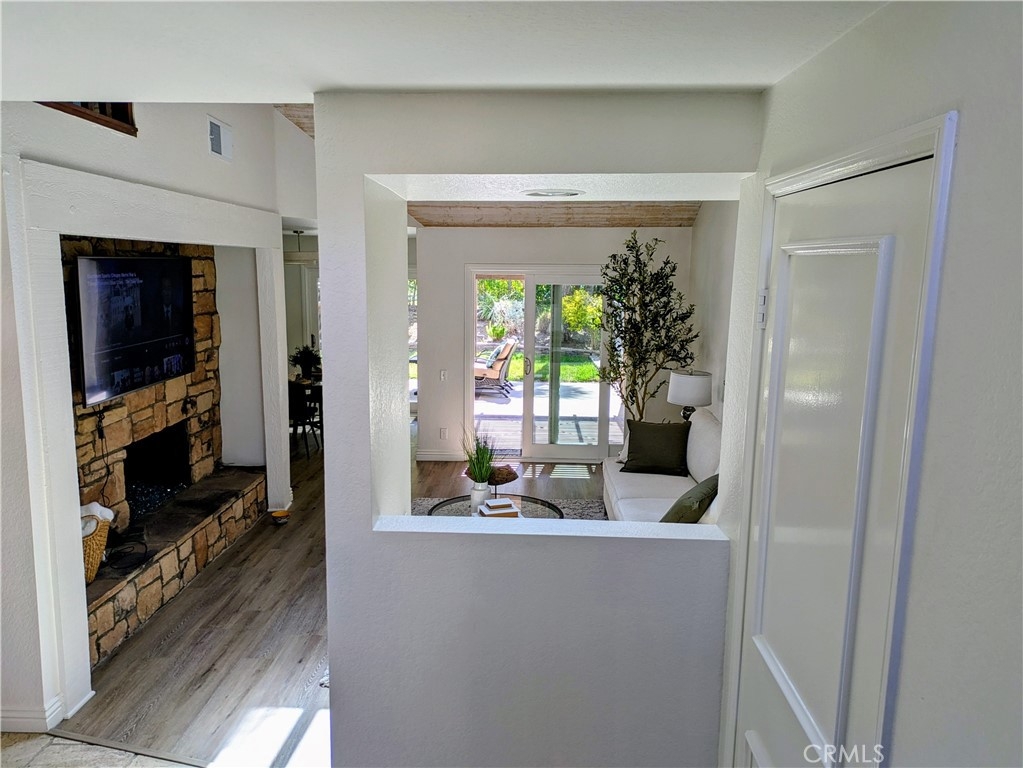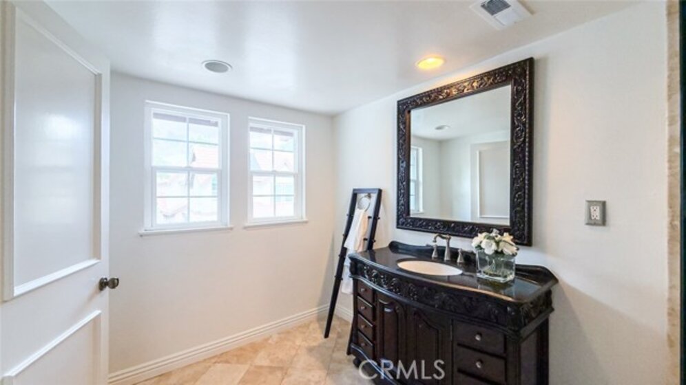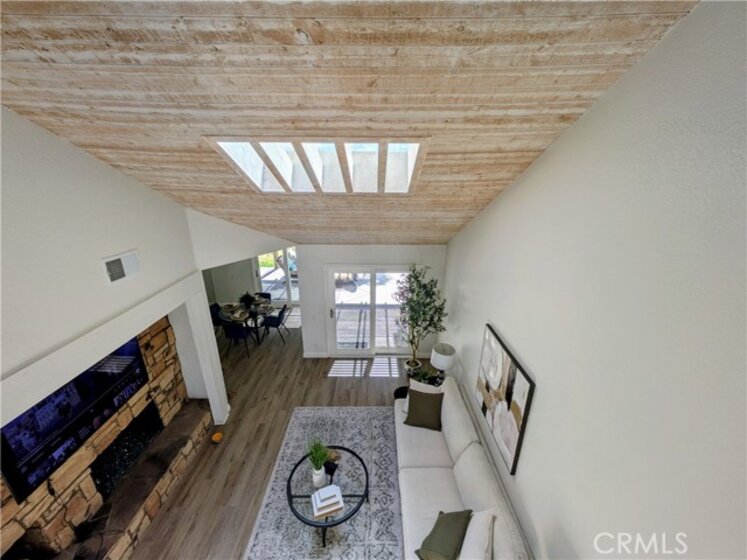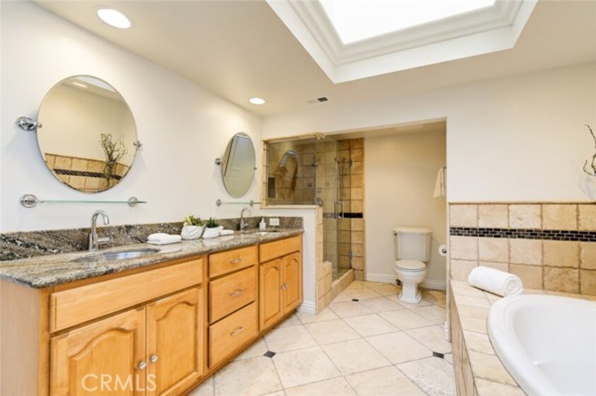 Welcome to 6164 E. Morningview Drive in Anaheim Hills. With approximately 1,967 square feet of living space, this home boasts a bright and open floor plan enhancing the beautiful wood ceilings. The skylights, windows and sliding glass doors flood the home with natural light. A travertine floor entryway leads into the living room with an impressive stacked stone fireplace and hearth. Upstairs shows off two huge primary bedroom suites, each with a large private bathroom. The primary suite bathroom boasts a skylight, jetted tub, walk-in shower with glass door, dual vanities, granite counter, travertine flooring, and closet space. The second bathroom suite features a walk-in closet, travertine flooring with custom glass walk-in shower. Both bedrooms have ceiling fans, vaulted ceilings and lots of windows. The impressive kitchen boasts granite counters, recessed lighting, cooking island, abundant cabinetry and counter space, along with a breakfast bar and eating area. The kitchen, dining room and living room offer sliding glass doors to the expansive backyard with a large covered patio, grass area, landscape lighting, fountain, lemon tree, and soaring palms. Enjoy a serene and peaceful setting in your backyard. A half bathroom is located downstairs. A separate laundry room leads to a two car garage. Dual pane vinyl windows, new flooring, and fresh paint are some of the many upgrades. This home sits on a quiet cul-de-sac street in the Royal Circle Village Community. Centrally located near top rated schools, shopping, dining, Saddle Club, golfing, parks and hiking trails, and easy freeway access, this is wonderful place to call home.
