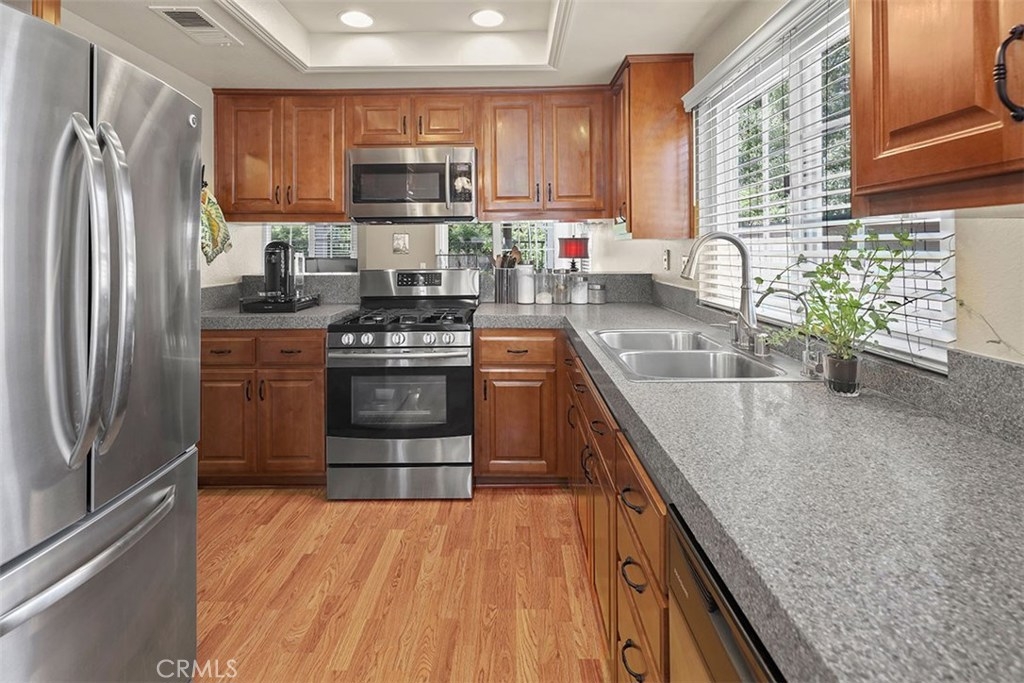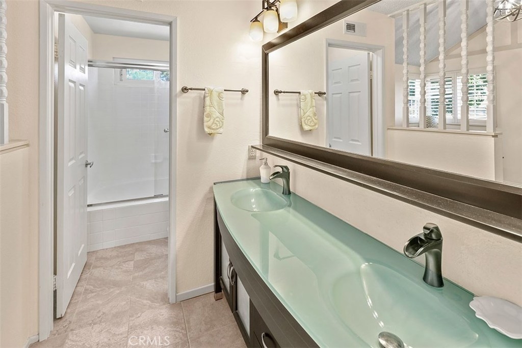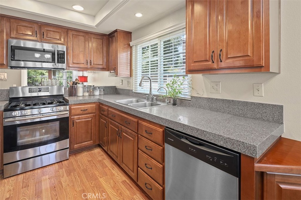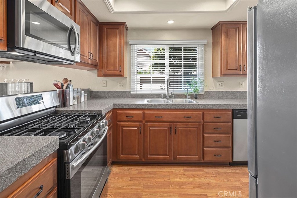 BACK ON MARKET!! Located on a quaint cul-de-sac street, this 3 Bedroom and 3 Bath home features dual Master Suites (one with a large walk-in closet) upstairs in addition to a bedroom and full bathroom downstairs. Turnkey and ready to move in, this home has been meticulously maintained and has many upgrades throughout. The remodeled kitchen has custom soft-close drawers and cabinets, granite counters, newer appliances, and a water filter system. An open family room space and high ceilings makes the downstairs feel very open and inviting with lots of natural light and plenty of room to entertain. The home features Dual-pane windows and doors with custom shutters, neutral paint coloring and a separate dining area. The backyard is private and peaceful backing to beautiful greenery and a nice side sized yard. The two car attached garage has plenty of space for storage in addition to the laundry hook ups. The community is surrounded by beautiful walking/hiking trails and has a private gated pool and spa perfect those those warm Summer days.