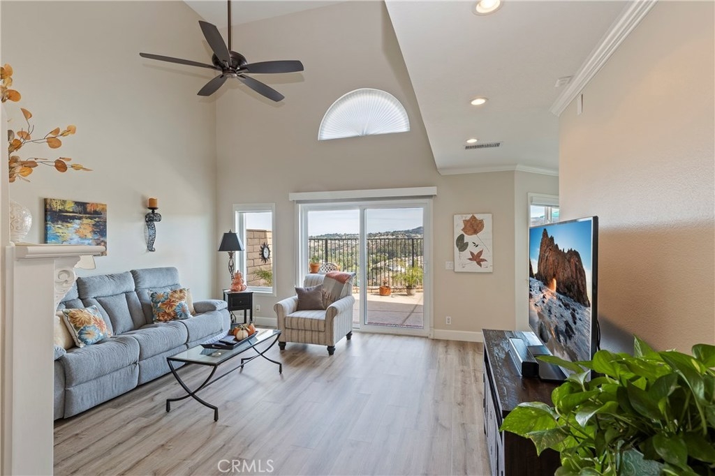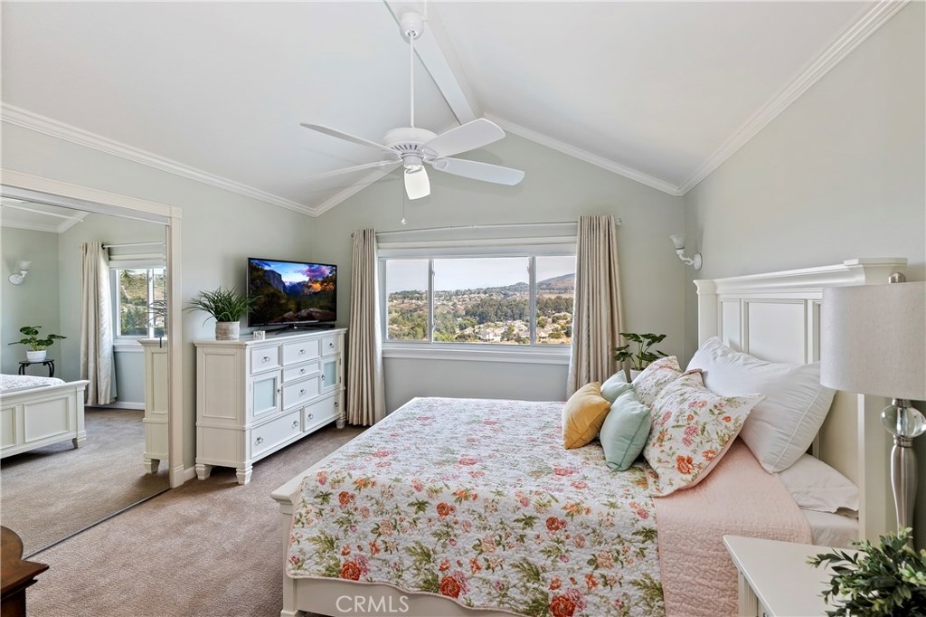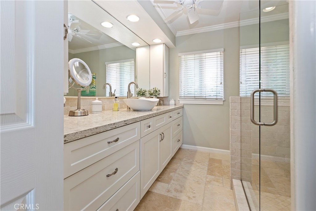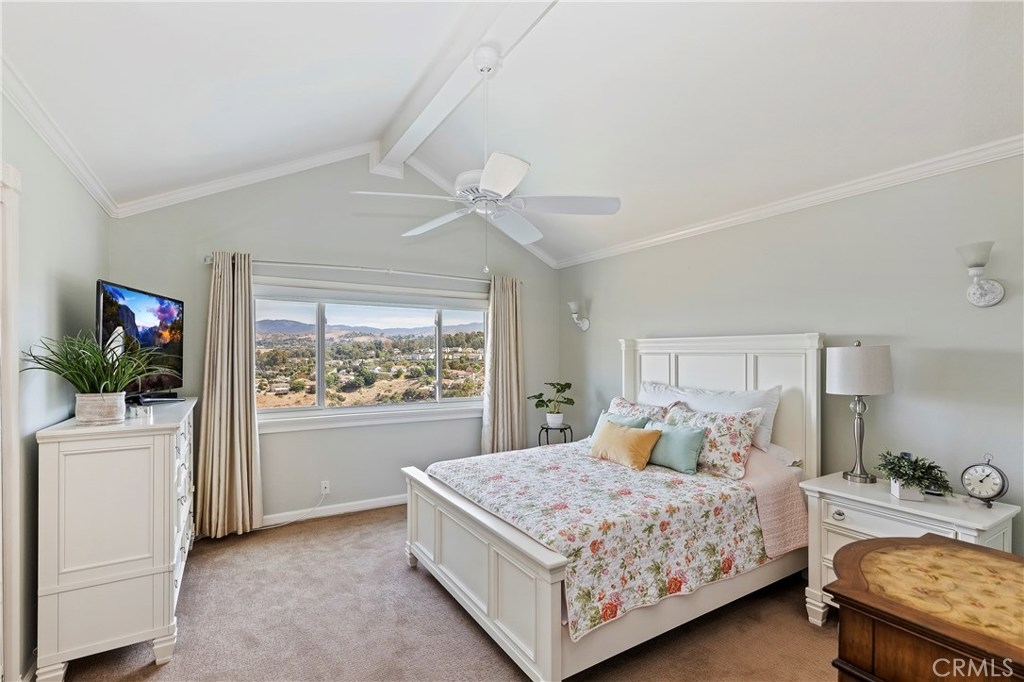 The minute you arrive at Kings Meadow you will notice that there are no cars parked on the street. Lush front grass front yard leads to amazing remodeled show home. Newer flooring, paint, granite counter tops, shutters, crown moulding, stainless steel appliances and amazing new master bathroom. The views are endless from living room, kitchen, back patio and master suite. Looking east you'll enjoy sunrise over the equestrian trail, stables and Anaheim Hills golf course.