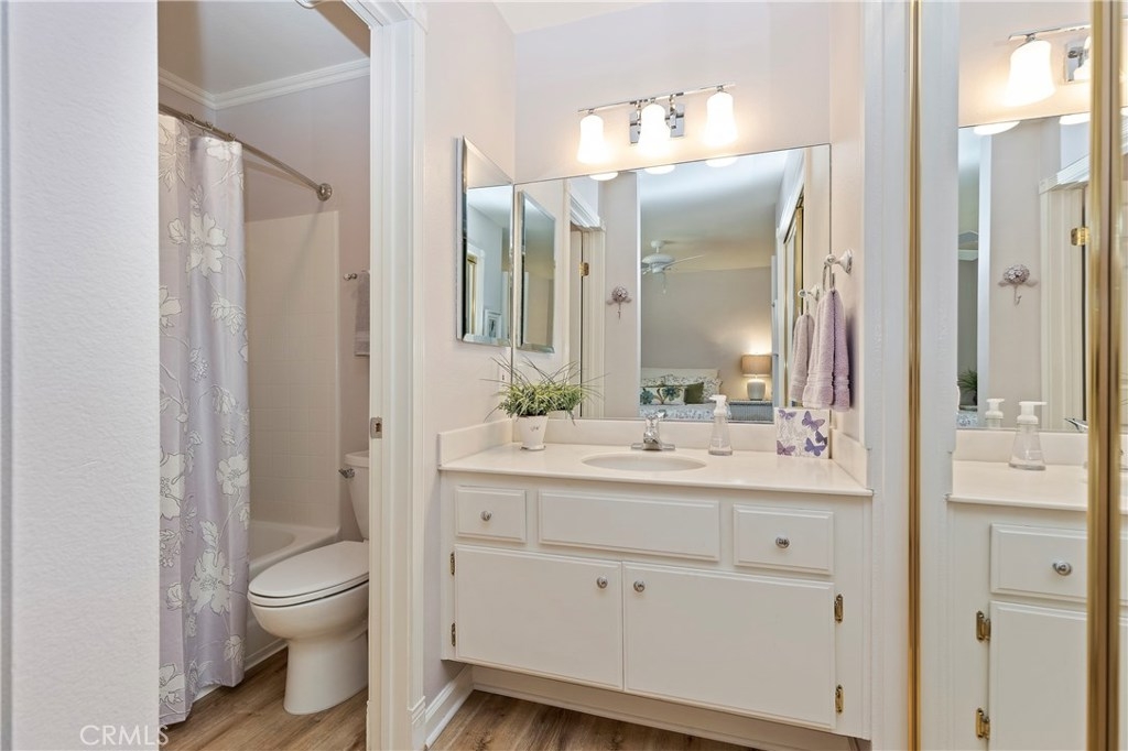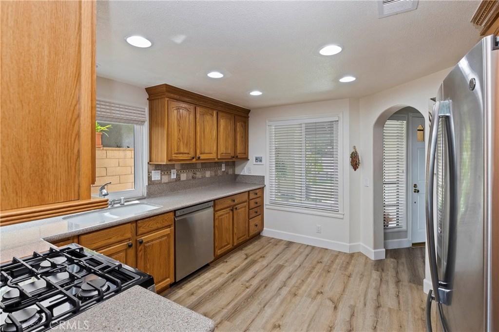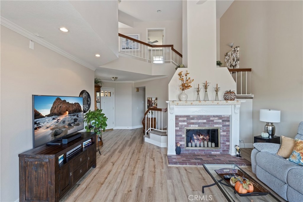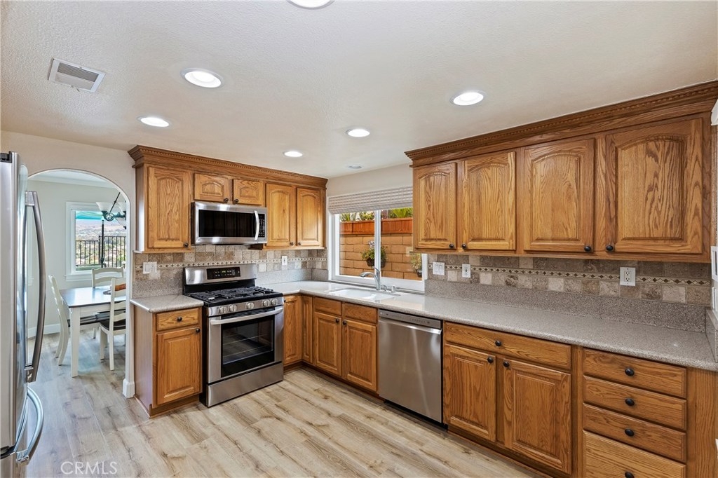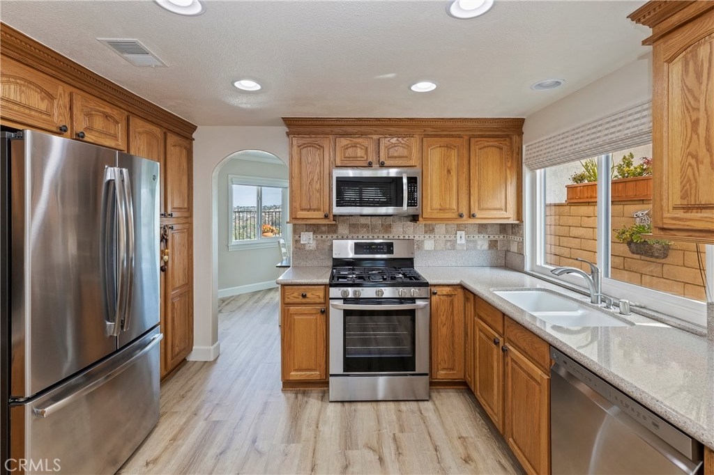 The minute you arrive at Kings Meadow you will notice that there are no cars parked on the street. Lush front grass front yard leads to amazing remodeled show home. Newer flooring, paint, granite counter tops, shutters, crown moulding, stainless steel appliances and amazing new master bathroom. The views are endless from living room, kitchen, back patio and master suite. Looking east you'll enjoy sunrise over the equestrian trail, stables and Anaheim Hills golf course.