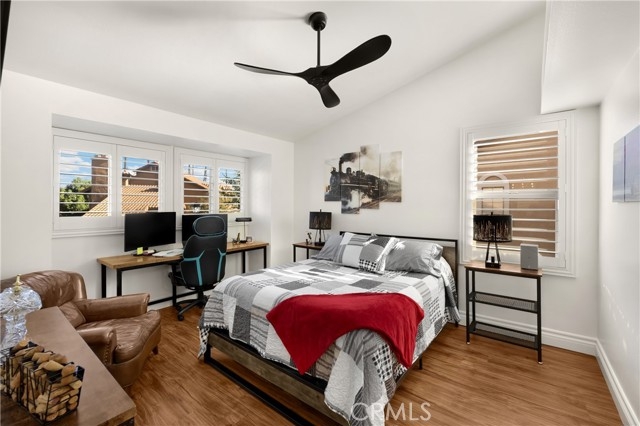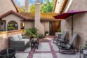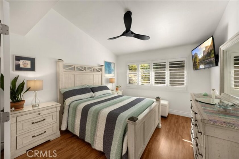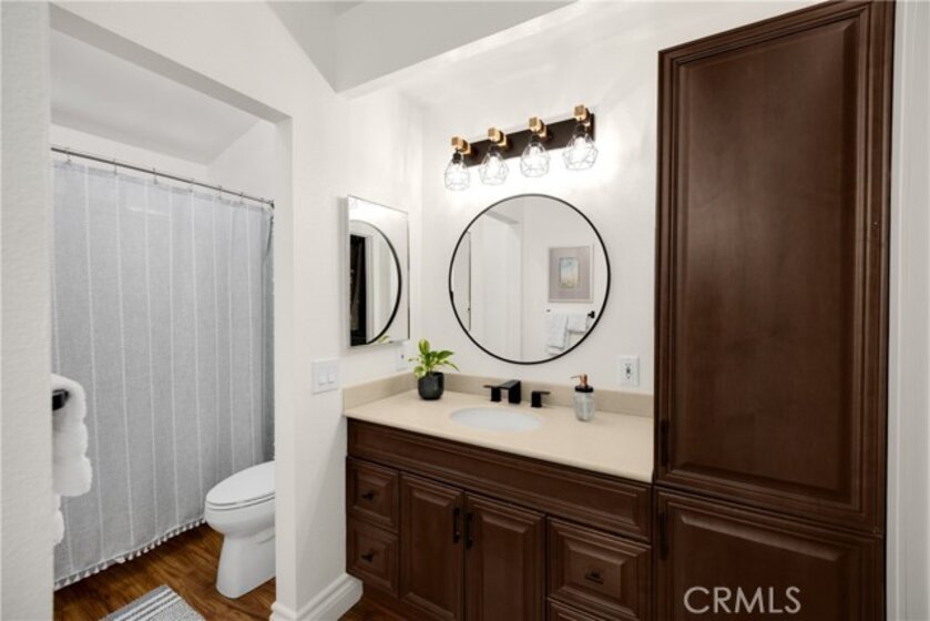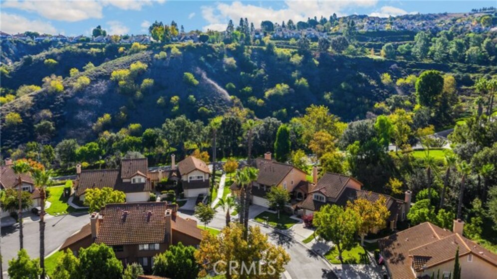 Beautifully updated home in the Anaheim Hills, tucked on a peaceful cul-de-sac in the desirable Camino Grande Villas community. Arrive to a professionally landscaped courtyard and gated, brick-lined patio, with an upgraded entry door setting the stage for the completely turnkey interior. Inside, the bright and airy home showcases upgraded luxury plank flooring, modern baseboards, and plantation shutters throughout that invite the perfect amount of natural light. The living room features dramatic cathedral ceilings, a gas fireplace, and a shiplap feature wall, with views of the pergola-shaded patio. The remodeled kitchen offers a spacious eat-in dining area with direct backyard access through an upgraded back door. Home chefs will love the upgraded KitchenAid appliances, granite countertops, and ample storage in custom wood cabinetry with pull-out drawers. Effortlessly move outside to grill and relax on the covered patio, which includes a BBQ-ready gas line, ceiling fan, and side walls for privacy. The lower level is complete with a refreshed powder room and laundry facilities in the two-car attached garage, which features a Tesla charger and additional driveway parking. Upstairs, retreat to two generously sized primary suites, each designed for comfort and privacy with tall vaulted ceilings, ceiling fans, walk-in closets with custom organizers, and two remodeled en suite full bathrooms. A spacious linen closet is conveniently placed on the upper landing. This home is truly move-in ready, with extensive recent updates including a new AC and heating system with an attic fan (2023), a whole-house water softener, and updated windows, doors, sprinkler system, garage built-ins, washer/dryer, water heater, fans, lighting, and fixtures throughout. This prime Anaheim Hills location is close to the Anaheim Hills Golf Course, schools, shopping, dining, and great hiking trails all nearby. With easy freeway access and a host of thoughtful upgrades, this meticulously maintained property is ready to welcome you home.