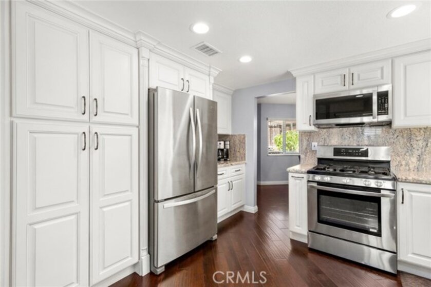Welcome to your gorgeous, turnkey home in the beautiful, peaceful community of Kings Meadow - Anaheim Hills. California succulent landscaping offers great curb appeal while being both low maintenance & water conscious. Move in ready is what you experience when you enter this recently renovated 3 bed & 3 bath home. Hardwood flooring leads to a light & bright family room w/high ceilings & double paned windows. The stone fireplace is perfect for a chilly evening. Kitchen boasts elegant cream “soft close” cabinetry, beautiful granite counters & new stainless steel appliances, fixtures & recessed lighting. The dining & family rooms open to a colorful, fragrant patio garden teeming with Roses, Lilly, Hydrangeas & Bougainvillea. Hard to find main floor bed/bath offers a new vanity, granite counters, walk in shower, Kohler sink, plumbing & lighting fixtures. Upstairs bedrooms offer thick, plush neutral grey carpet. The Master Suite is generously sized with full wall mirrored wardrobe closets. Remodeled Master Spa utilizes White & Grey Subway Carrera Marble in large walk in shower w/sitting ledge & 2nd hand held fixture, thick seamless wrap around glass, double sink vanity, quartz counters, pendant lighting fixtures, custom “Chateau” mirrors & satin nickel plumbing fixtures. The flooring is a "wood" tile to complement downstairs hardwood. Direct garage access. Near walking trails, Oak Canyon, AHGC & close to dining, entertainment, freeway/toll + award winning schools.