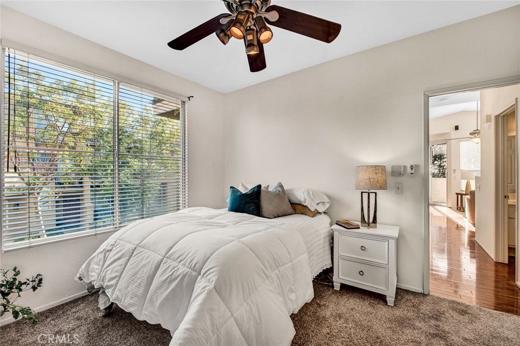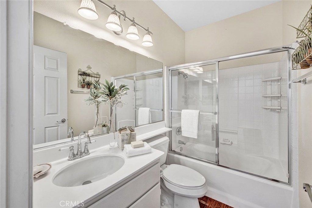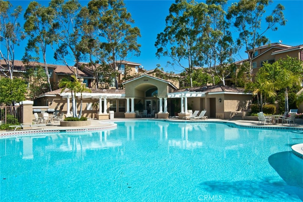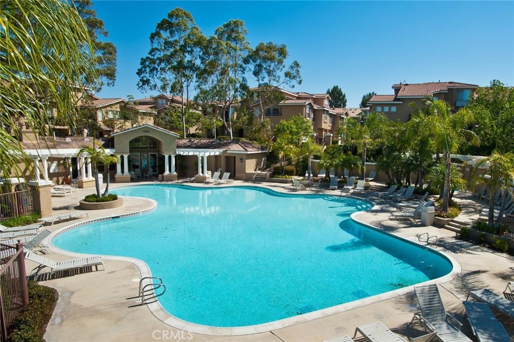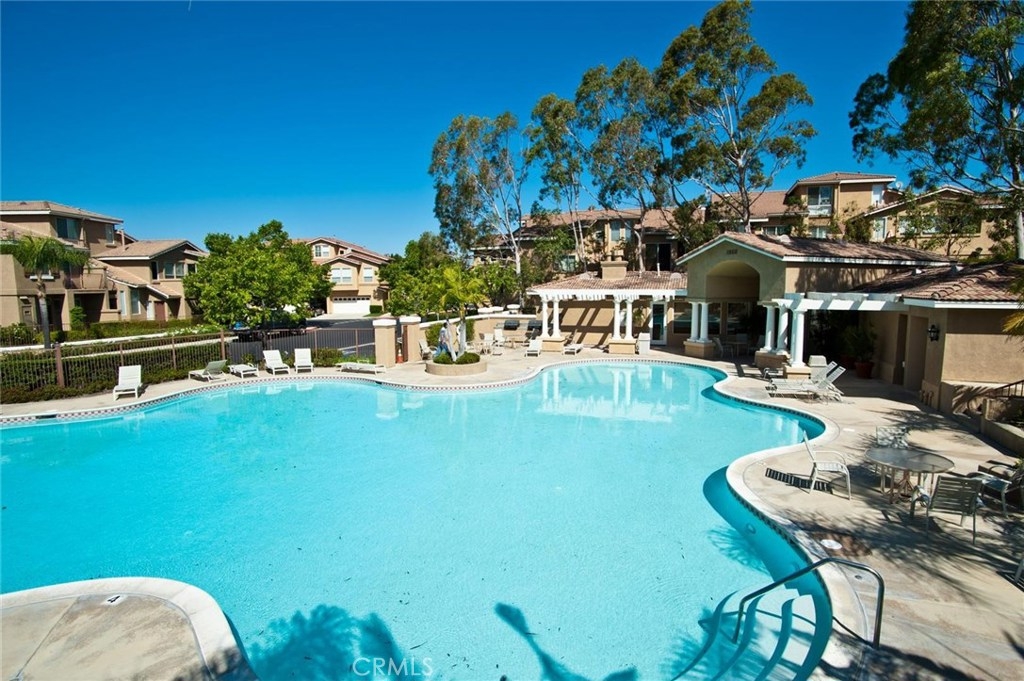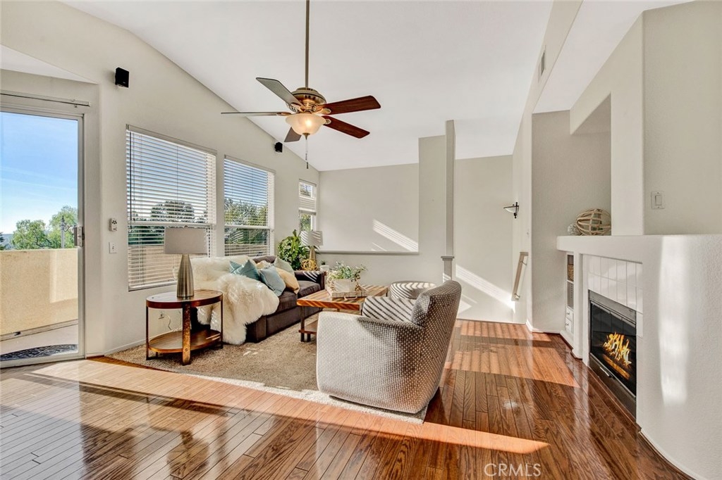 How would you like to feel like you're on vacation every day? Monaco in Anaheim Hills is the place, offering resort style living year round. There's a tropical, big pool & spa area with abundant space to swim, play or just lounge and enjoy the sun. There's also a clubhouse & a gym/workout room if you need to get some cardio in while living on vacation. All this with low HOA dues! And your luxury suite on your year round vacation is absolutely wonderful! You enter at the ground floor with direct access to your 2 car garage. The living space is upstairs which opens to a spacious and natural light filled great room with stunning wood flooring featuring a big living room with fireplace, entertainment niches, ceiling fan and high ceilings,a spacious dining area and a terrific kitchen with clean white cabinets, counters and appliances. The kitchen also has an island with bar seating. There's a sliding glass door leading to an expansive balcony/deck with serene views of the hills and trees. The first bedroom off the hallway is currently used as an office and has ample mirrored wardrobe closet space, soft carpeting & a cooling ceiling fan. Across the hall is a full bath with tub & shower, white vanity and wood flooring. At the end of the hall you find the master suite with soft carpeting, a cooling ceiling fan and arched opening to the private bath which has a white double vanity, privacy door for the toilet, walk-in closet, tub & shower. Don't miss this! Come live the good life!