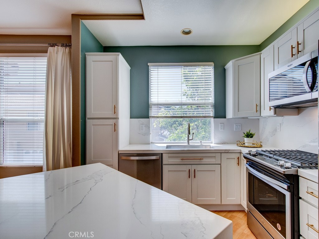 This is a Rare Single Level Carriage Living. 2 Bedroom, 2 FULL Bath END UNIT, with 2-car Driveway is located in the Highly Desirable Anaheim Hills Resort Style community of Monaco. This home is immaculate with no living unit above or below, has vaulted ceilings, painted tones & fireplace, creating a comfortable and relaxing setting. With many large windows throughout, this home invites an Abundance of Natural Light. Recently UPGRADED GOURMET KITCHEN with Modern Quartz Countertops and Custom Cabinets. Upgraded stainless steel oven and range, dishwasher and microwave oven. Refrigerator is Included in sale. Master Suite has Dual Sinks in the En-Suite Bathroom. Walk-in closet with Built-In Organizers and full length mirrored closet doors. Oversized 2-car garage with Direct Access to entry way comes complete with Built-in Custom Cabinetry. Arms Reach to the 91, 55, and 241, Shopping, Dining, Parks and Trails. Don’t Miss This GREAT HOME!