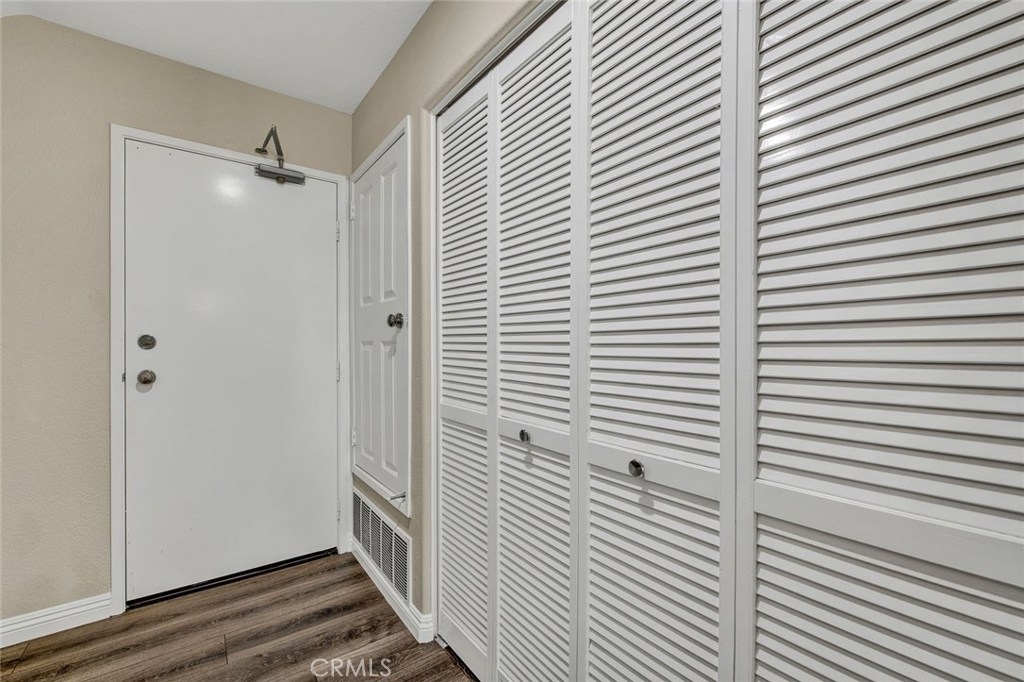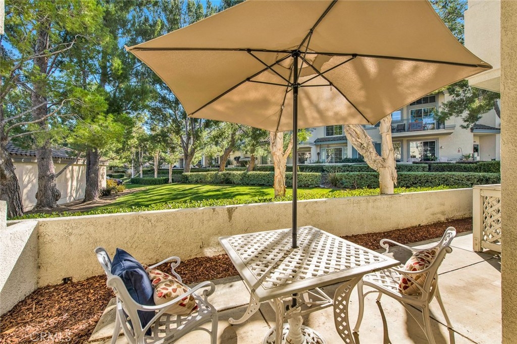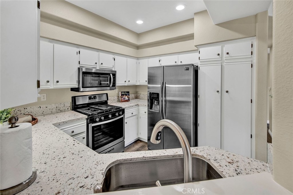 Desirable ground floor end unit with two bedroom and two bathrooms located in the beautiful gated community of Viewpointe North. Popular floor plan with open living space and large patio that extends from the living room to the master bedroom. Enter into the living room with new wood laminate flooring, fireplace, and large sliding glass door to access the private patio. Dining room is adjacent to living room and includes updated chandelier. Remodeled kitchen with new quartz countertops, white cabinets, new recessed lighting, new stainless steel sink and faucet, stainless steel appliances including refrigerator. Down the hall are the two bedrooms, guest bathroom, and laundry closet. Master bedroom with new wood laminate flooring and large sliding glass door to access private patio. Master bathroom is remodeled with walk-in shower, dual sink vanity, recessed lighting, and walk-in closet. Guest bedroom with wood laminate flooring, closet with mirrored doors, and peaceful view of greenbelt. Guest bathroom with bathtub/shower combo. One car attached garage with direct access to home and one designated covered carport. Viewpointe North includes two pools, five spas, clubhouse, and offers two gated entries.