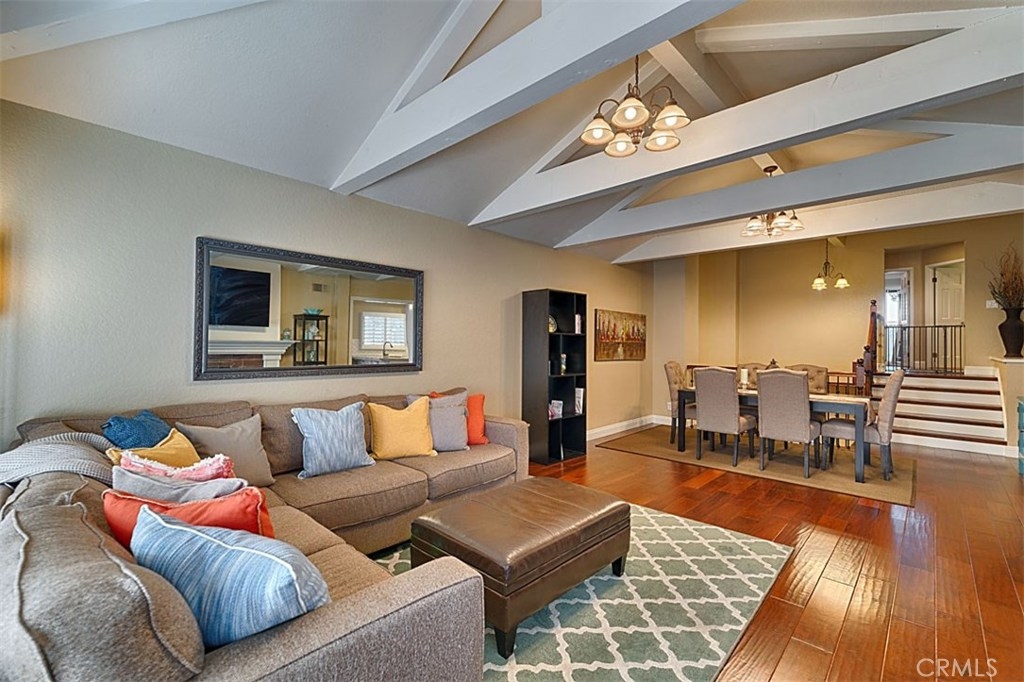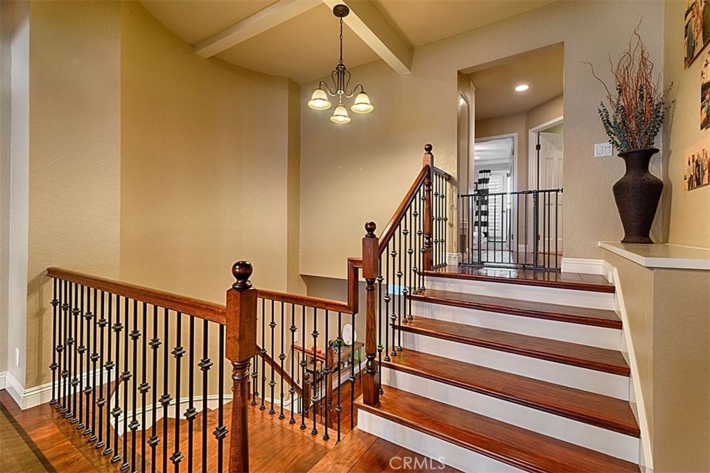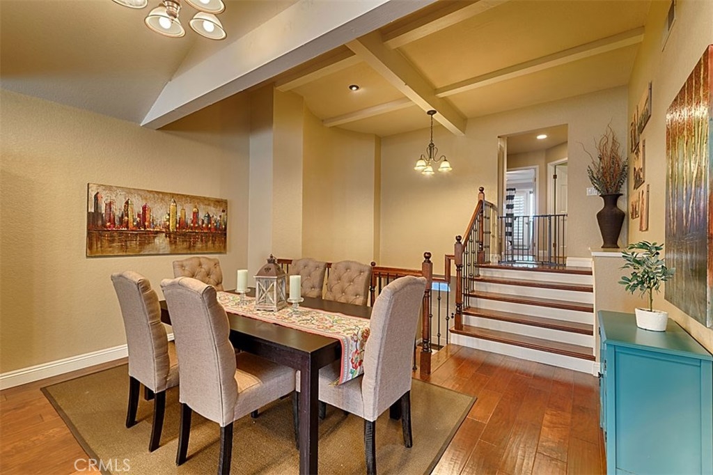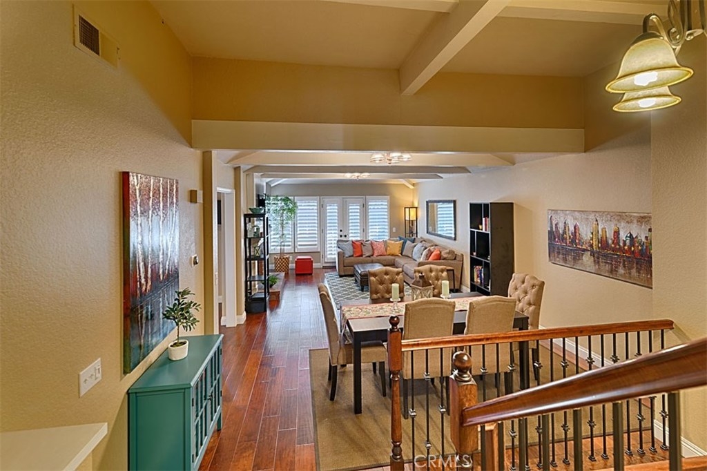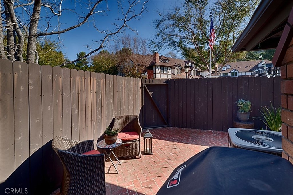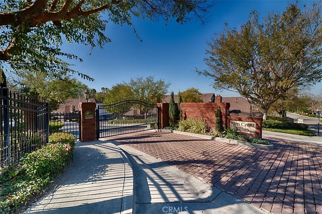 Beautiful Rim Crest Villa in private gated community. Upon entering, notice the custom staircase and wood flooring through out living spaces. You will enjoy the open Living Room with high wood beam ceilings, customized fireplace and mantle, French doors, and Formal Dining Room. Remodeled Kitchen includes granite counters, custom back splash, new SS appliances, and pantry. Adjacent Nook has French doors out to brick patio. Master Bedroom with French Doors to balcony, brick fireplace, two closets. Master Bathroom with separate tub and shower, dual sinks, tile floor. Secondary Bedroom, also enjoys French Doors to shared balcony. Interior Laundry room has generous cabinetry and a storage closet. Property has 2 car attached garage with direct access and storage closets. Features include: new water heater, no Mello Roos, walking distance to Canyon Rim Elementary School. Association Pool and Spa. Great location near reservoir trails, parks, school, and shopping.