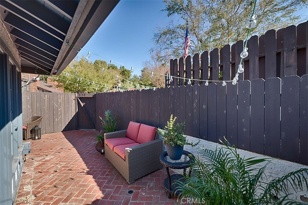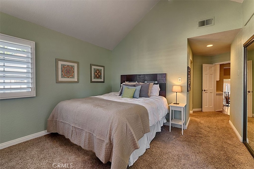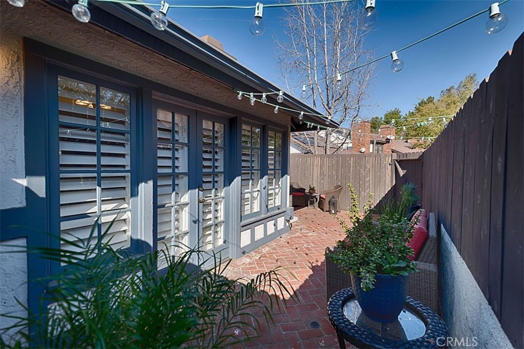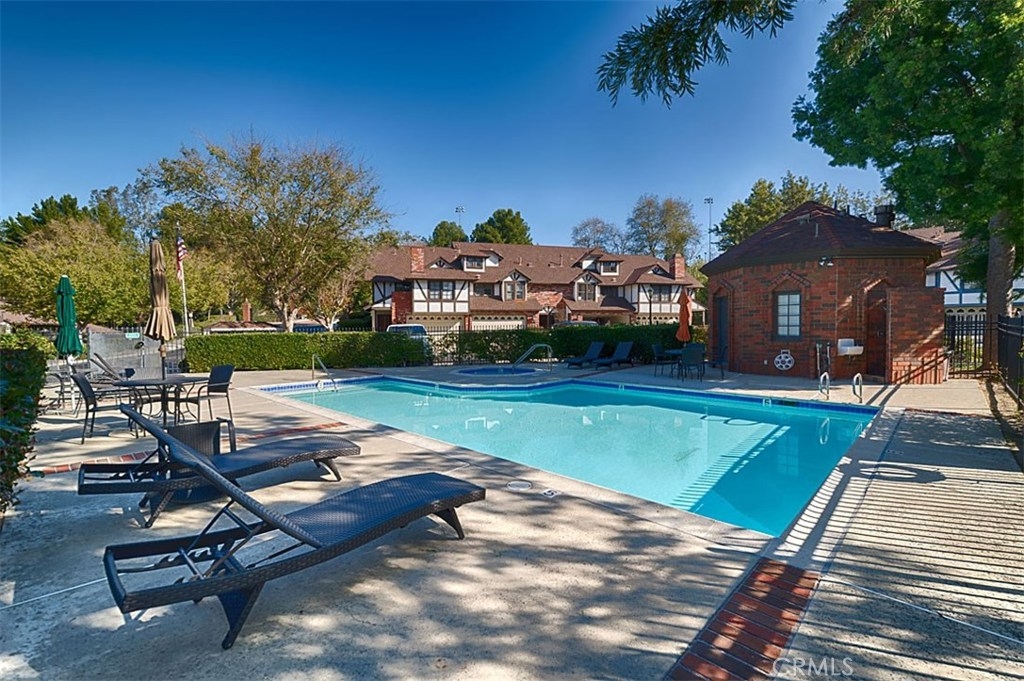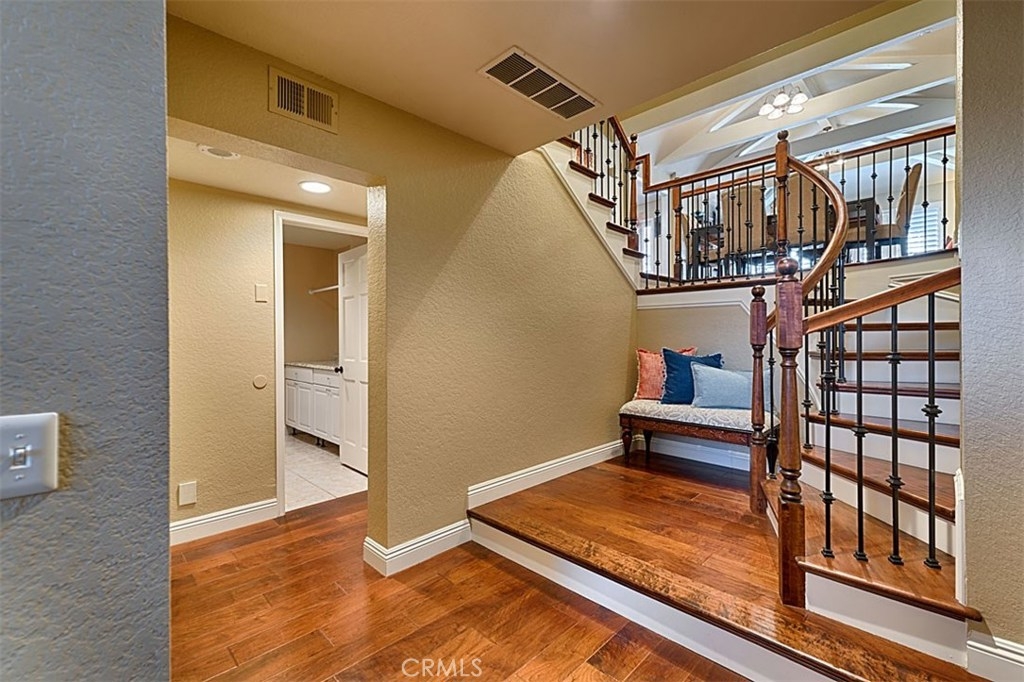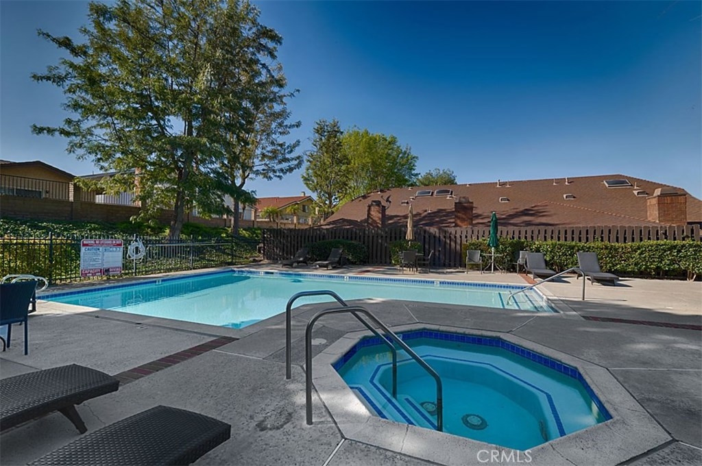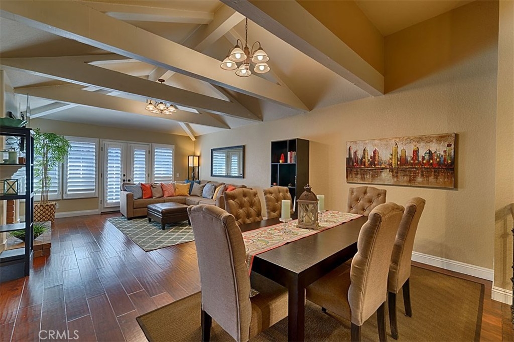 Beautiful Rim Crest Villa in private gated community. Upon entering, notice the custom staircase and wood flooring through out living spaces. You will enjoy the open Living Room with high wood beam ceilings, customized fireplace and mantle, French doors, and Formal Dining Room. Remodeled Kitchen includes granite counters, custom back splash, new SS appliances, and pantry. Adjacent Nook has French doors out to brick patio. Master Bedroom with French Doors to balcony, brick fireplace, two closets. Master Bathroom with separate tub and shower, dual sinks, tile floor. Secondary Bedroom, also enjoys French Doors to shared balcony. Interior Laundry room has generous cabinetry and a storage closet. Property has 2 car attached garage with direct access and storage closets. Features include: new water heater, no Mello Roos, walking distance to Canyon Rim Elementary School. Association Pool and Spa. Great location near reservoir trails, parks, school, and shopping.