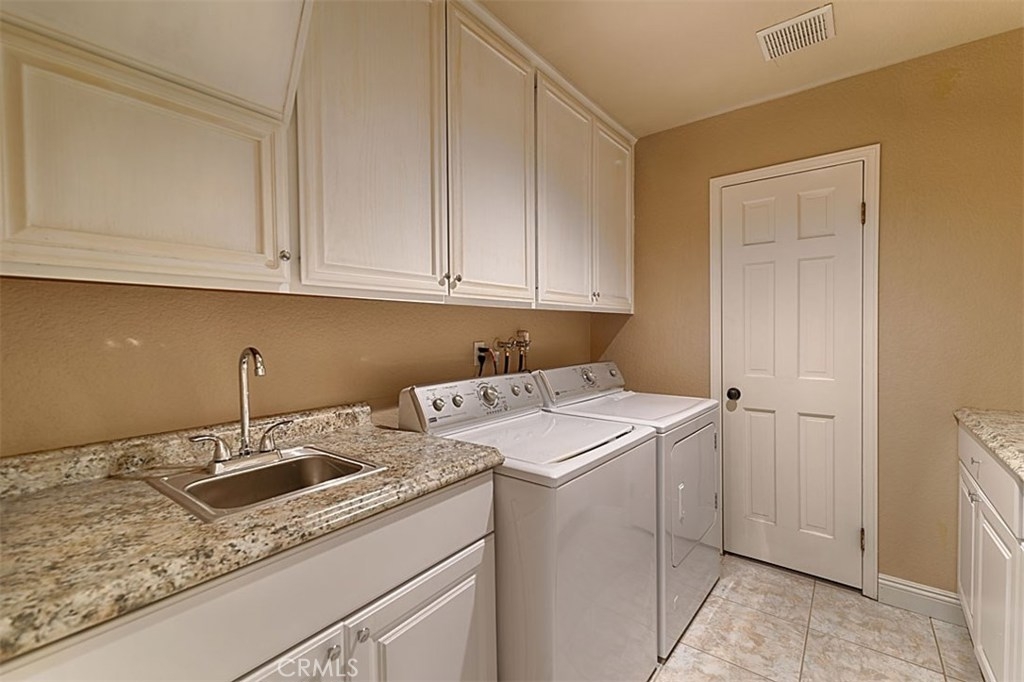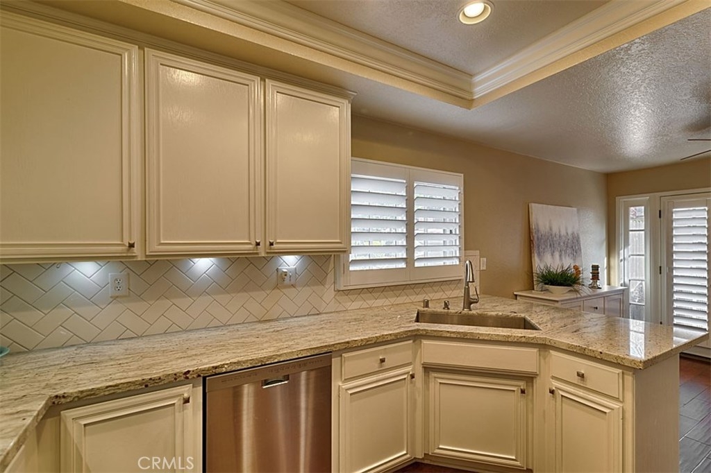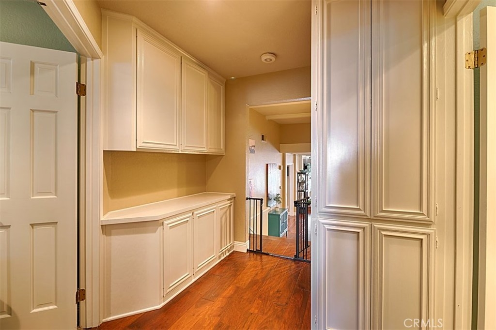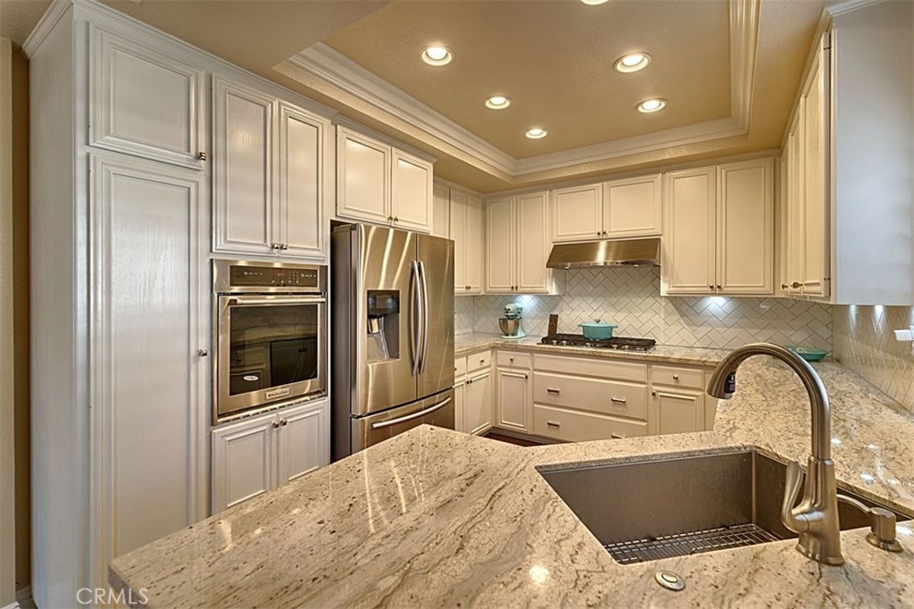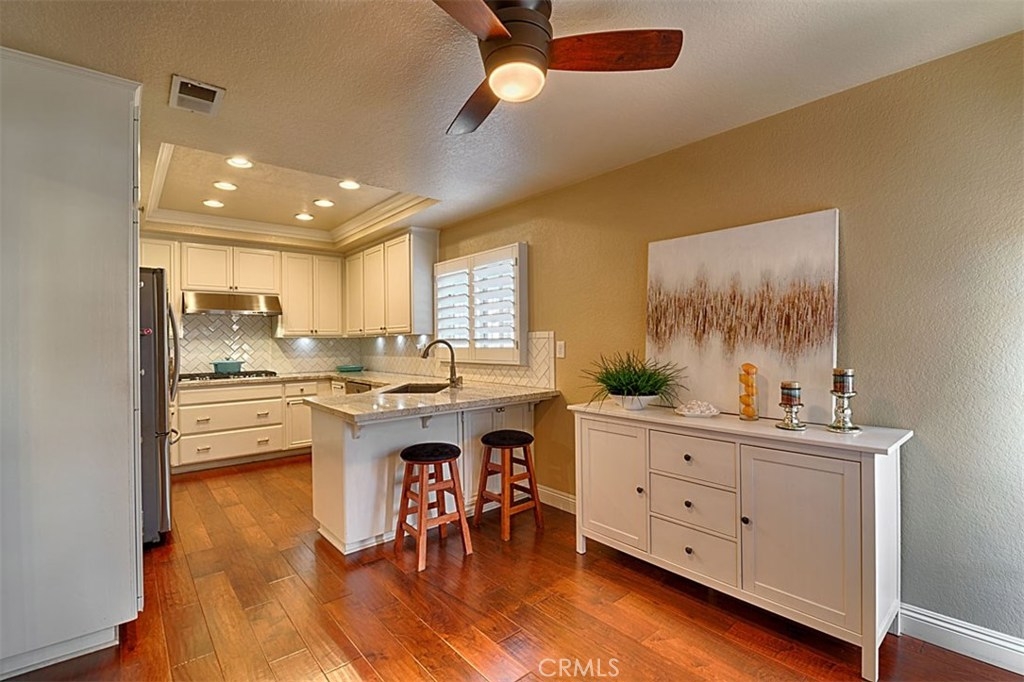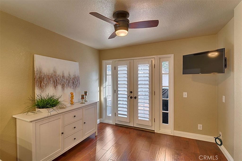 Beautiful Rim Crest Villa in private gated community. Upon entering, notice the custom staircase and wood flooring through out living spaces. You will enjoy the open Living Room with high wood beam ceilings, customized fireplace and mantle, French doors, and Formal Dining Room. Remodeled Kitchen includes granite counters, custom back splash, new SS appliances, and pantry. Adjacent Nook has French doors out to brick patio. Master Bedroom with French Doors to balcony, brick fireplace, two closets. Master Bathroom with separate tub and shower, dual sinks, tile floor. Secondary Bedroom, also enjoys French Doors to shared balcony. Interior Laundry room has generous cabinetry and a storage closet. Property has 2 car attached garage with direct access and storage closets. Features include: new water heater, no Mello Roos, walking distance to Canyon Rim Elementary School. Association Pool and Spa. Great location near reservoir trails, parks, school, and shopping.